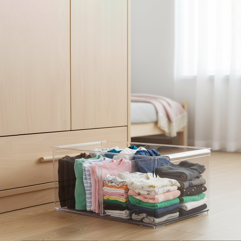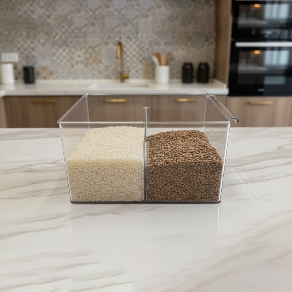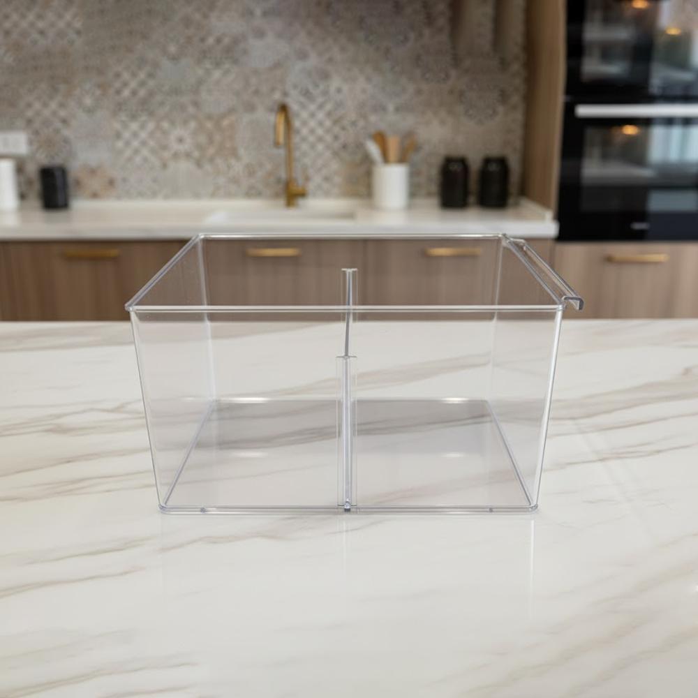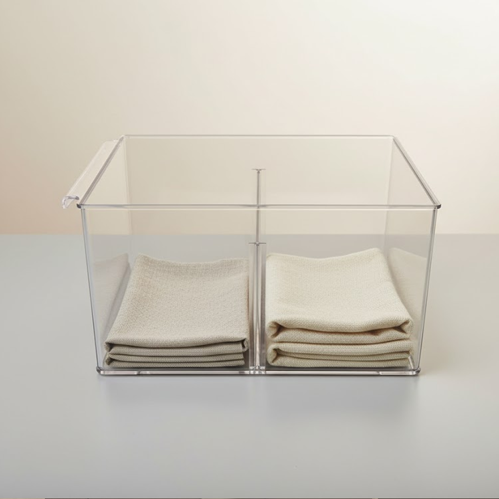 احصل على تنظيم أنيق وعملي مع حاوية التنظيم الأكريليك الشفافة المقسّمة، المصممة لتسهيل ترتيب المحتويات والحفاظ على مظهر مرتب في أي مساحة.
