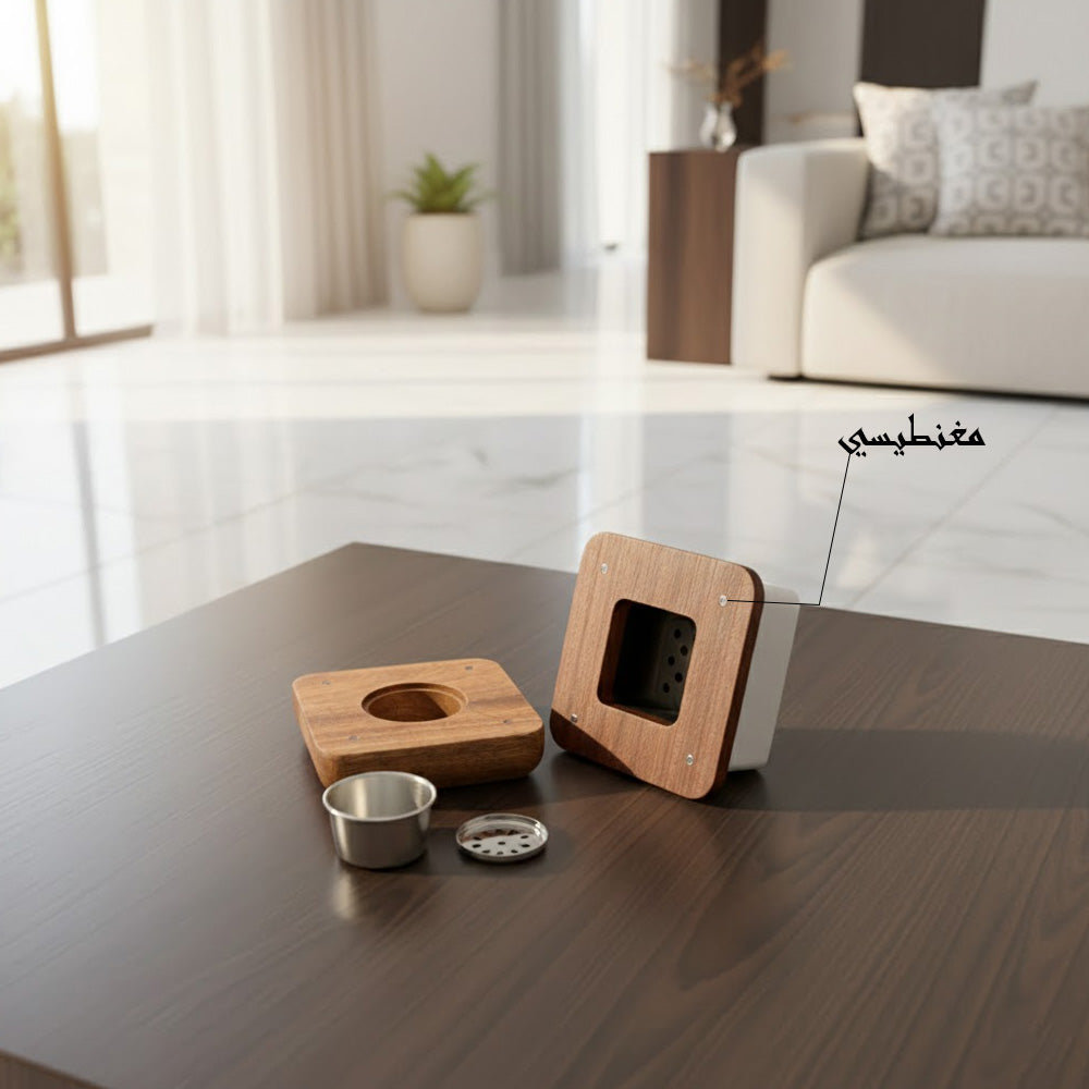 صُنعت المبخرة من خشب طبيعي أملس، وتتميز بغطاء مغناطيسي قابل للإزالة لسهولة الاستخدام والتعامل الآمن. في الداخل، يوجد كوب معدني مقاوم للحرارة لحفظ الفحم أو البخور بأمان، بينما يسمح الغطاء المثقب بانتشار العطر بلطف في أرجاء الغرفة.
