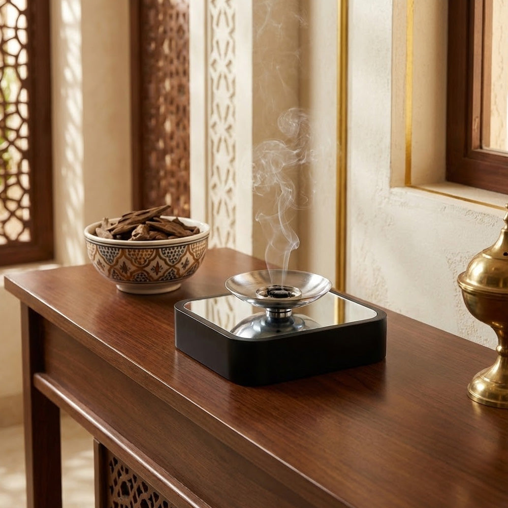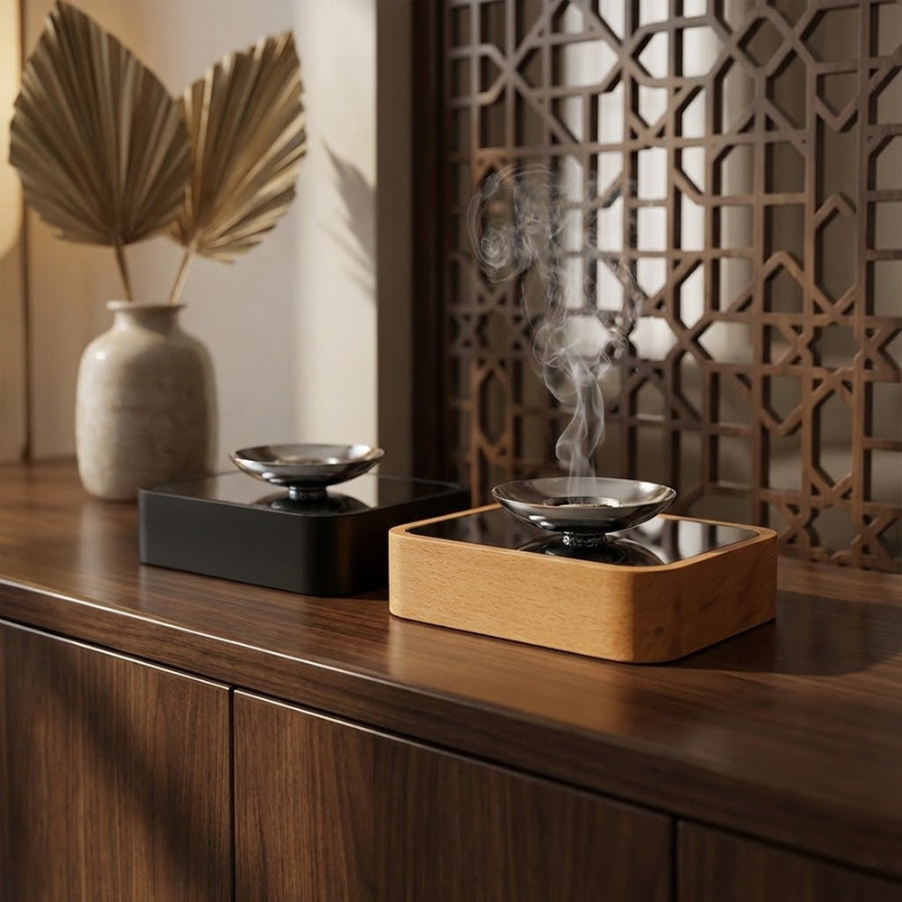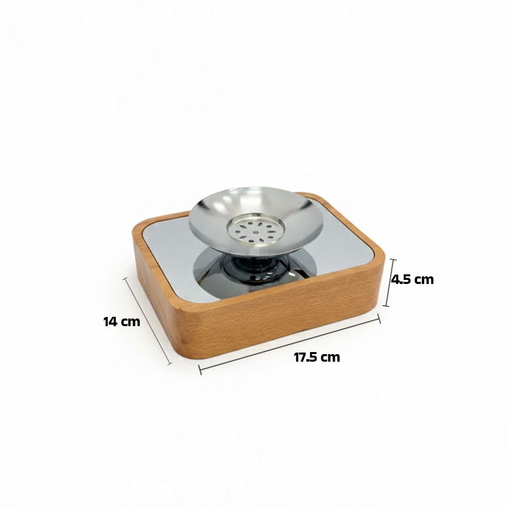 يضمن الطبق المعدني المقاوم للحرارة احتراقًا آمنًا، بينما تسهل القاعدة الخشبية القابلة للإزالة عملية التنظيف وجمع الرماد. حجمها الصغير يجعلها مناسبة للطاولات والرفوف والمكاتب دون أن تشغل مساحة كبيرة.