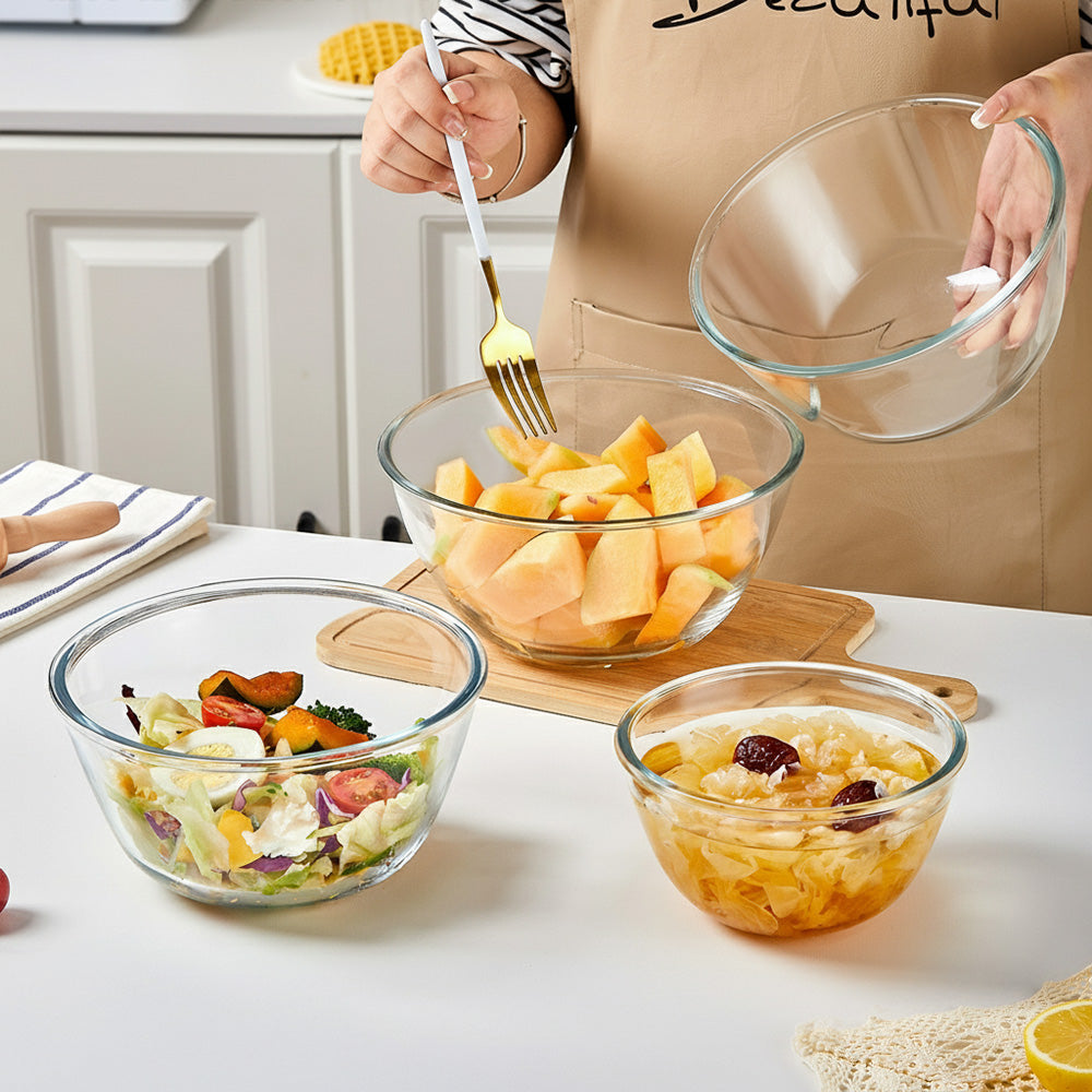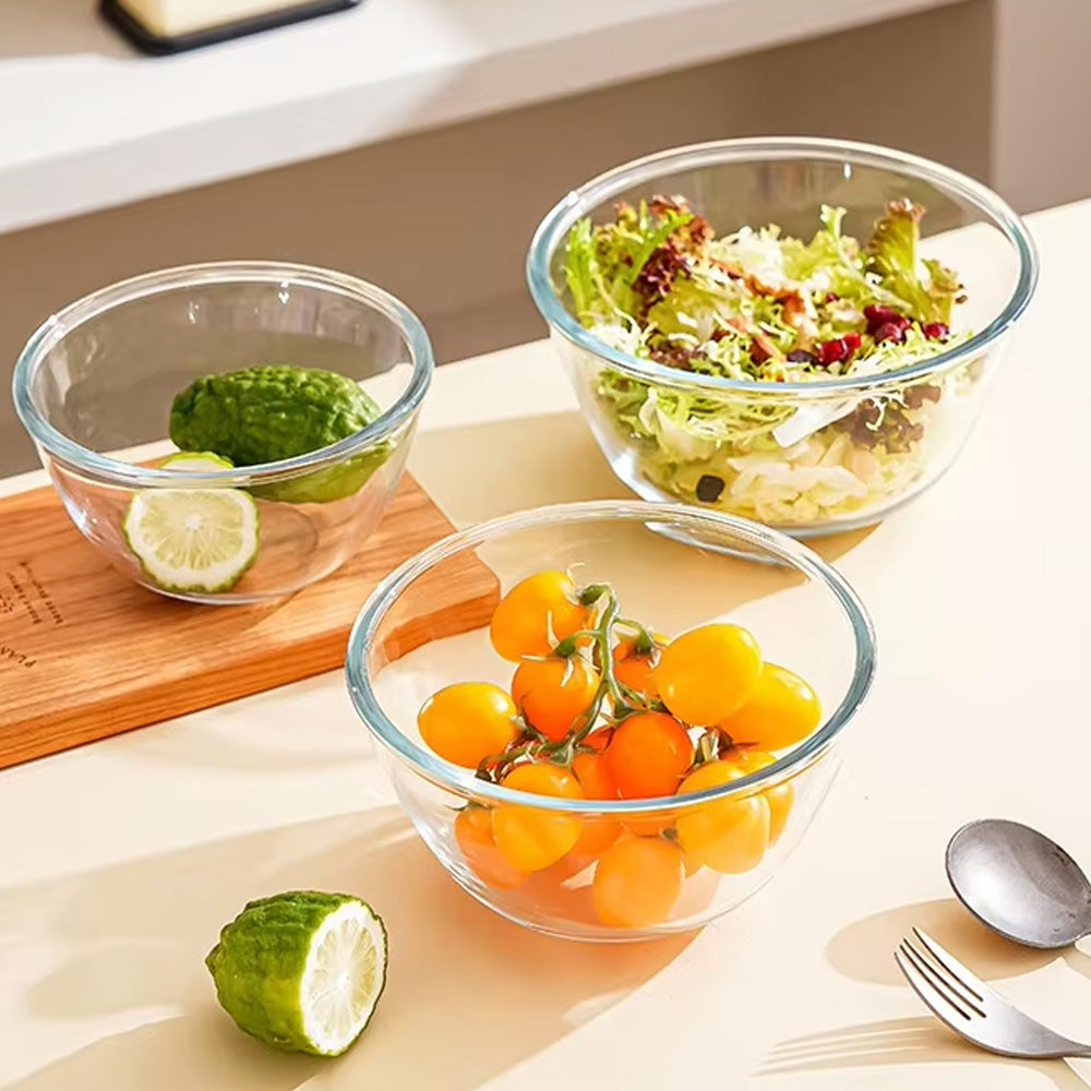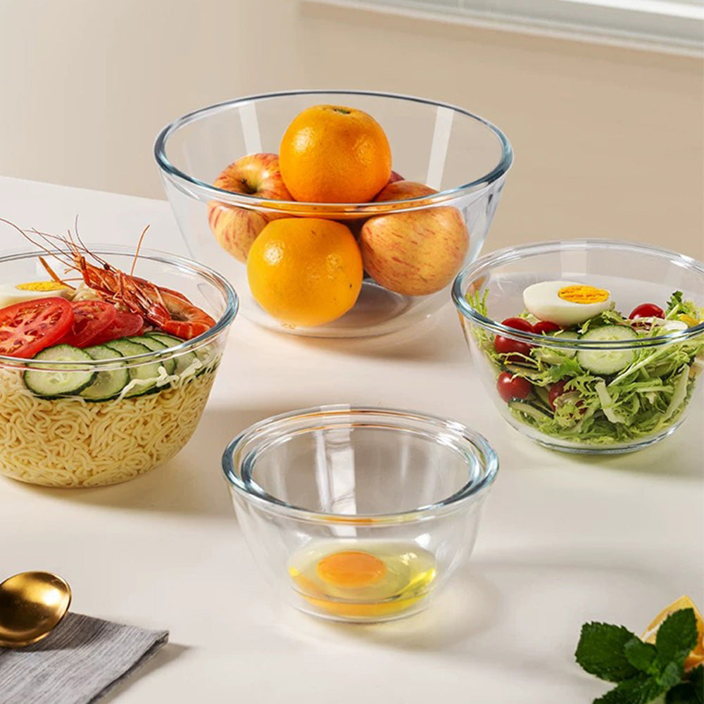 سواء كنت تخلط المكونات، أو تقدم السلطات، أو تخزن بقايا الطعام، فإن هذه الأوعية الزجاجية الشفافة توفر لك الراحة والمظهر الأنيق. تصميمها الشفاف يسمح لك بسهولة مراقبة محتوياتها، بينما يوفر شكلها القابل للتكديس مساحة تخزين قيّمة.