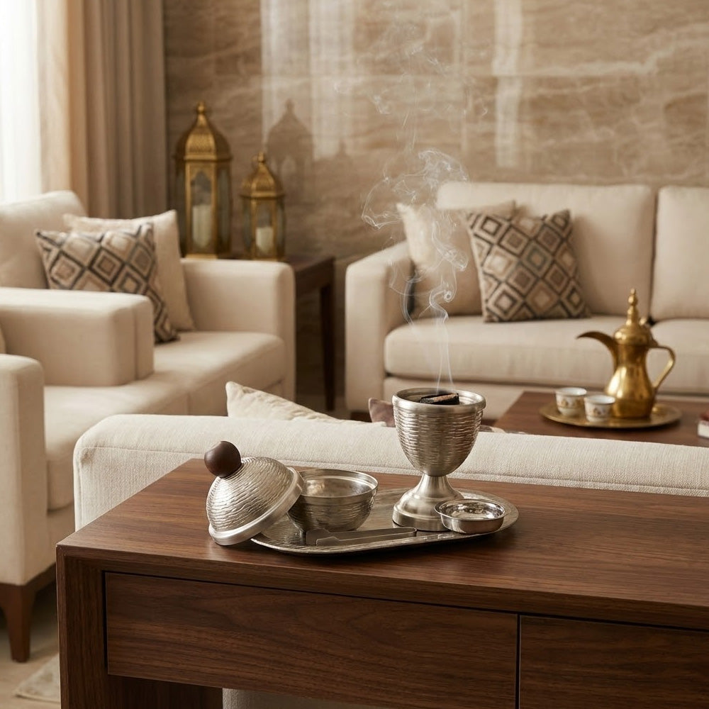 أضف لمسة روحانية وجمالية إلى مساحتك مع طقم مبخرة البخور الأنيق المصنوع من الفولاذ، والمصمم بعناية فائقة ليجمع بين الجمال والعملية. يتضمن الطقم مبخرة بغطاء، وحامل بخور على شكل كأس، وصينية متناسقة، وملقط - مثالي لطقوس تبخير متكاملة.