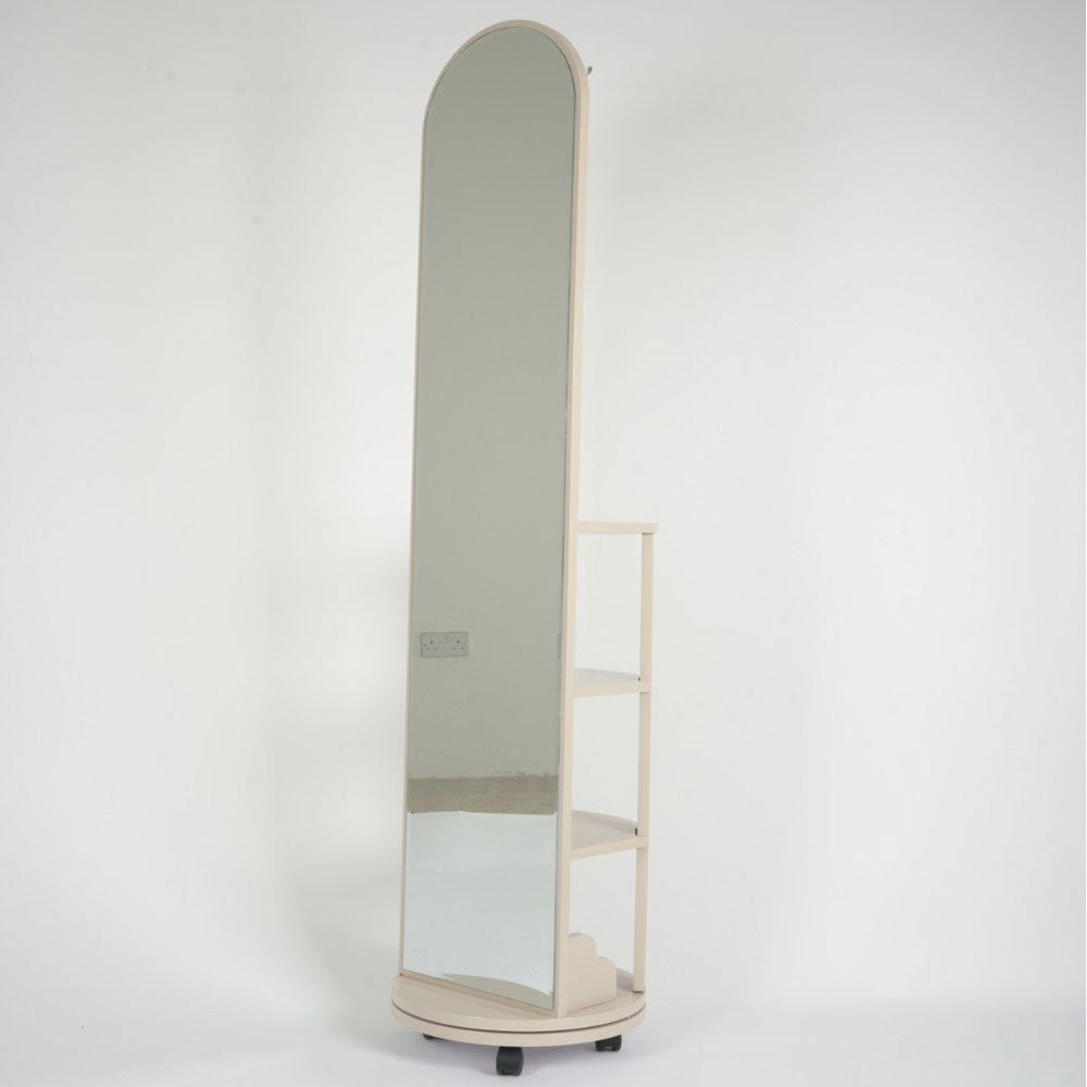 مرايا طوليه متحركة مع قاعدة دواره و ارفف خشبيه لعرض أدوات الزينة و المقتنيات والكتب لإضفاء لمسة جمال لغرفة النوم والمكتب والمكان الذي توضع فيه مراية الارفف توفر لك منظر جمالي و مساحة إضافية في الغرفة , مرايا الارفف مصنوعه من الزجاج و هيكل من الخشب عالي الدقة وقاعدة خشب دواره ومتحركة مما يسهل نقلها من مكان لأخر , مراية الارفف متوفر منها عدة ألوان لتتناسب مع الديكور المنزلي , مرايا الارفف يمكنك تنظيفها بمسحة رقيقة .