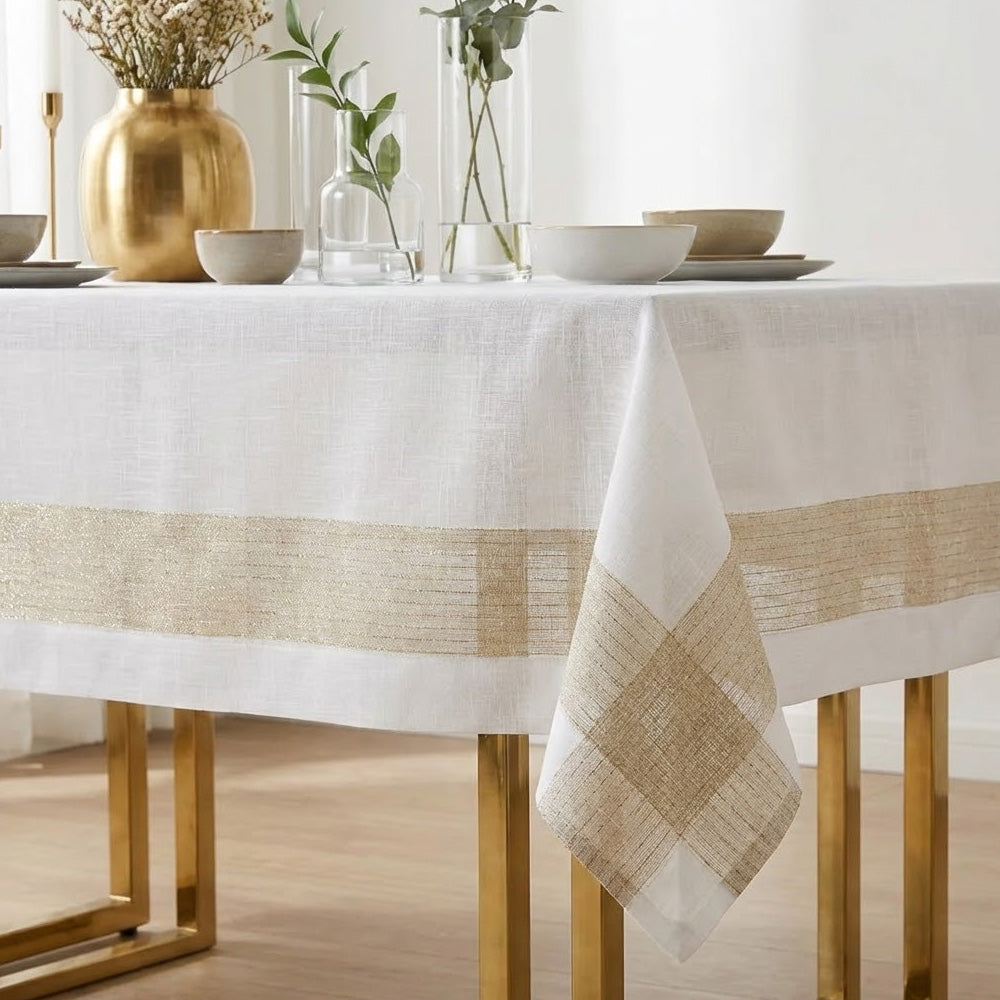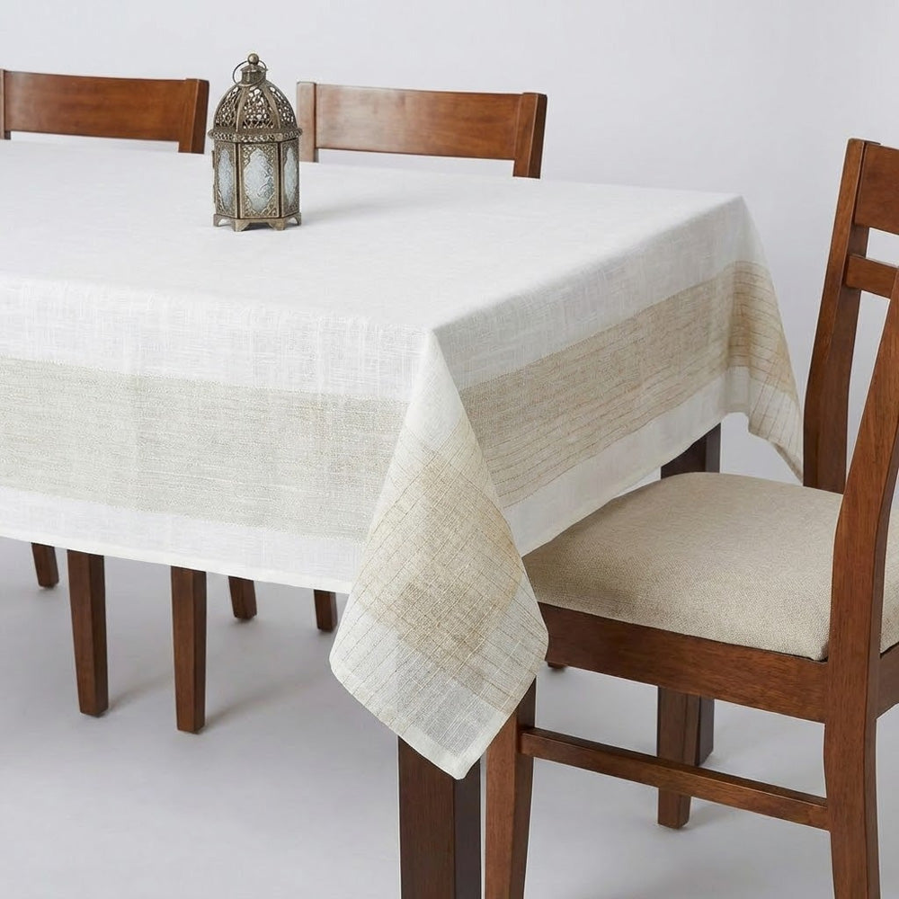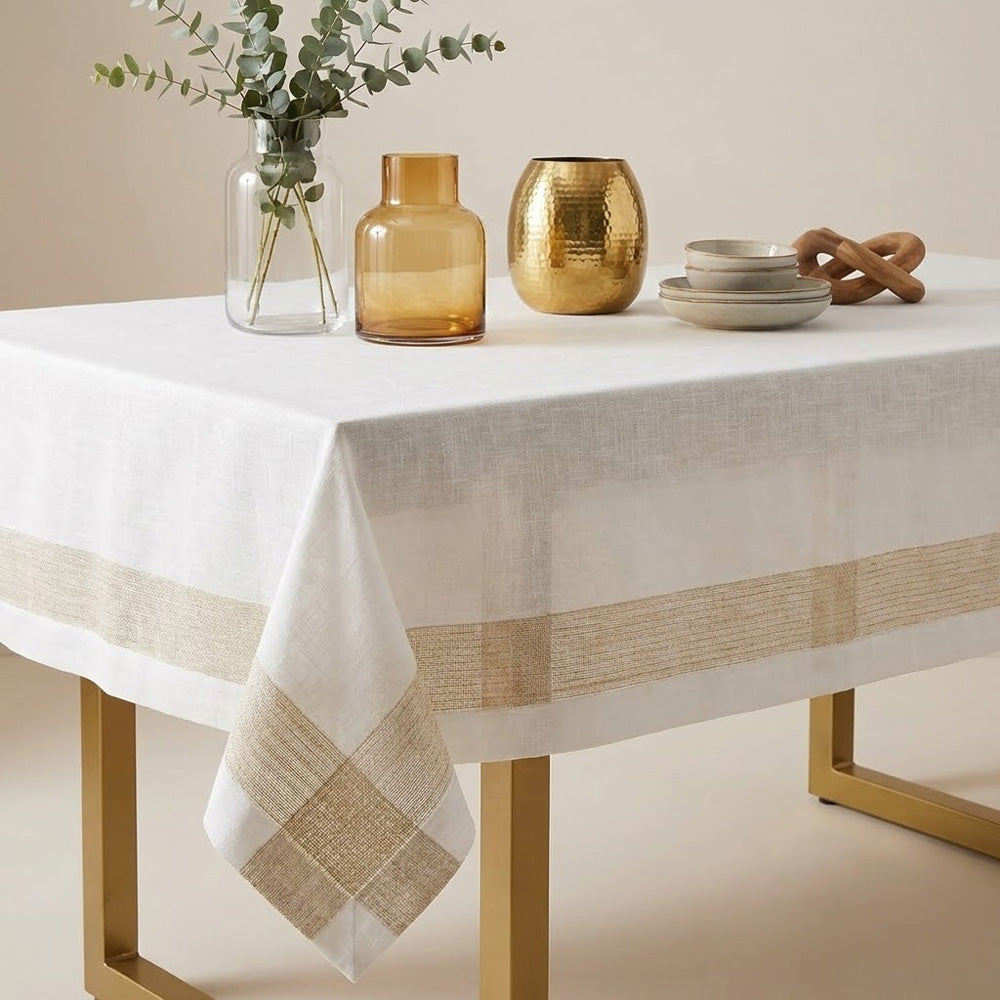 ارتقِ بتجربة تناول الطعام مع مفرش المائدة الفاخر هذا، المصمم بلون عاجي ناعم مع خطوط ذهبية بيج منسوجة بدقة. مصنوع من قماش عالي الجودة، يتميز بخفة وزنه ومتانته، مما يجعله مثاليًا للاستخدام اليومي والمناسبات الخاصة.