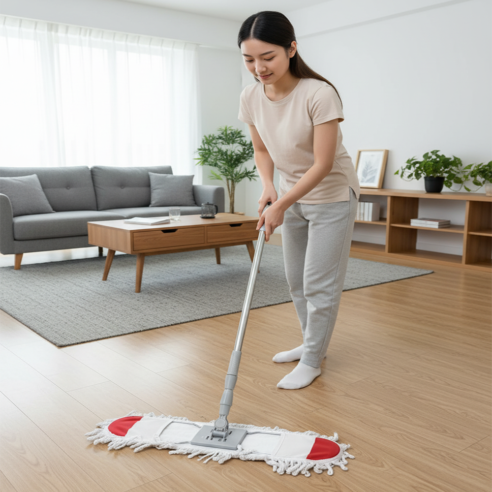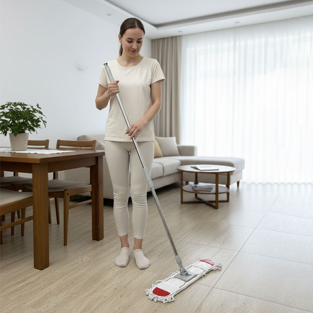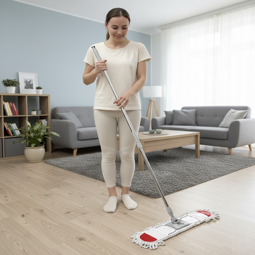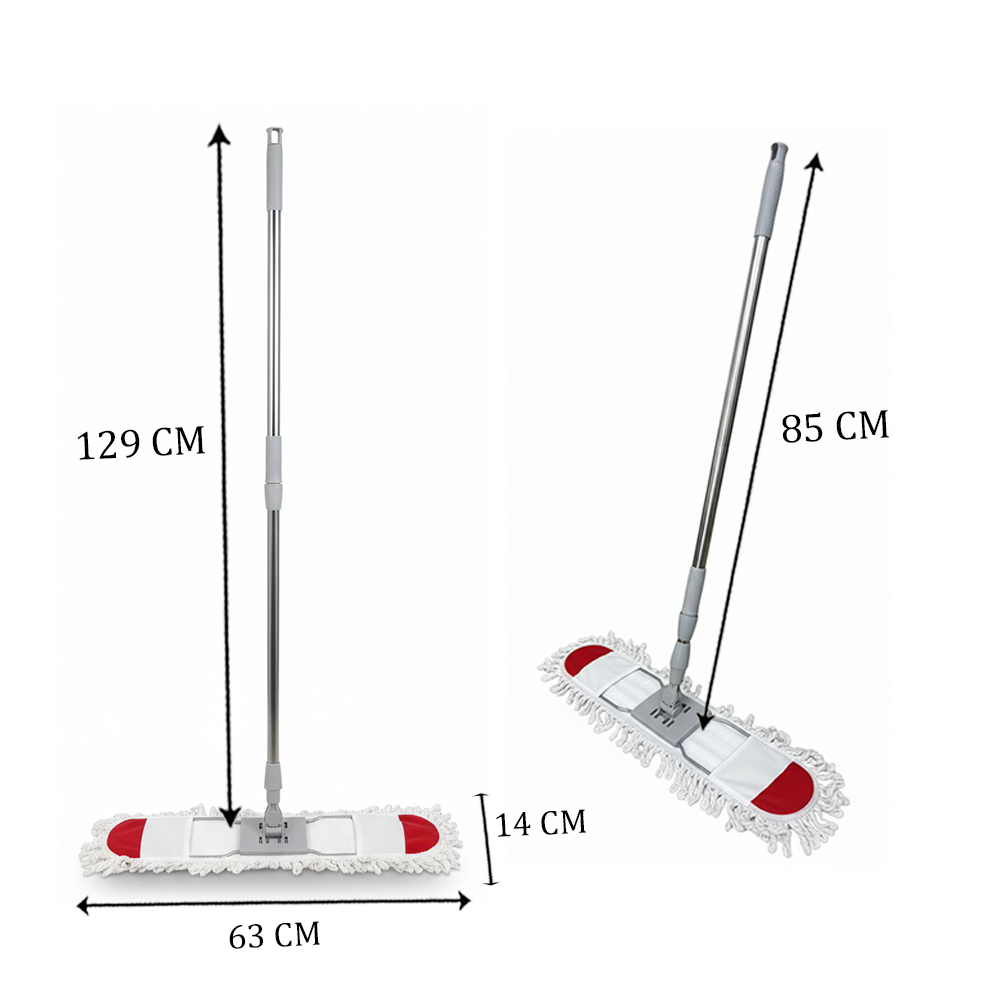 استمتعي بتنظيف فعال وسهل مع الممسحة القابلة للتعديل. تأتي ممسحة الأرضيات بمقبض قابل للتمديد من 85 سم إلى 129 سم، مما يتيح لكِ تنظيف المساحات الكبيرة بسهولة ودون الحاجة للانحناء.