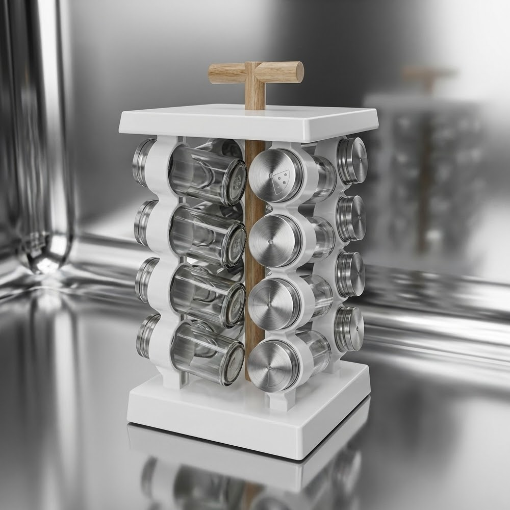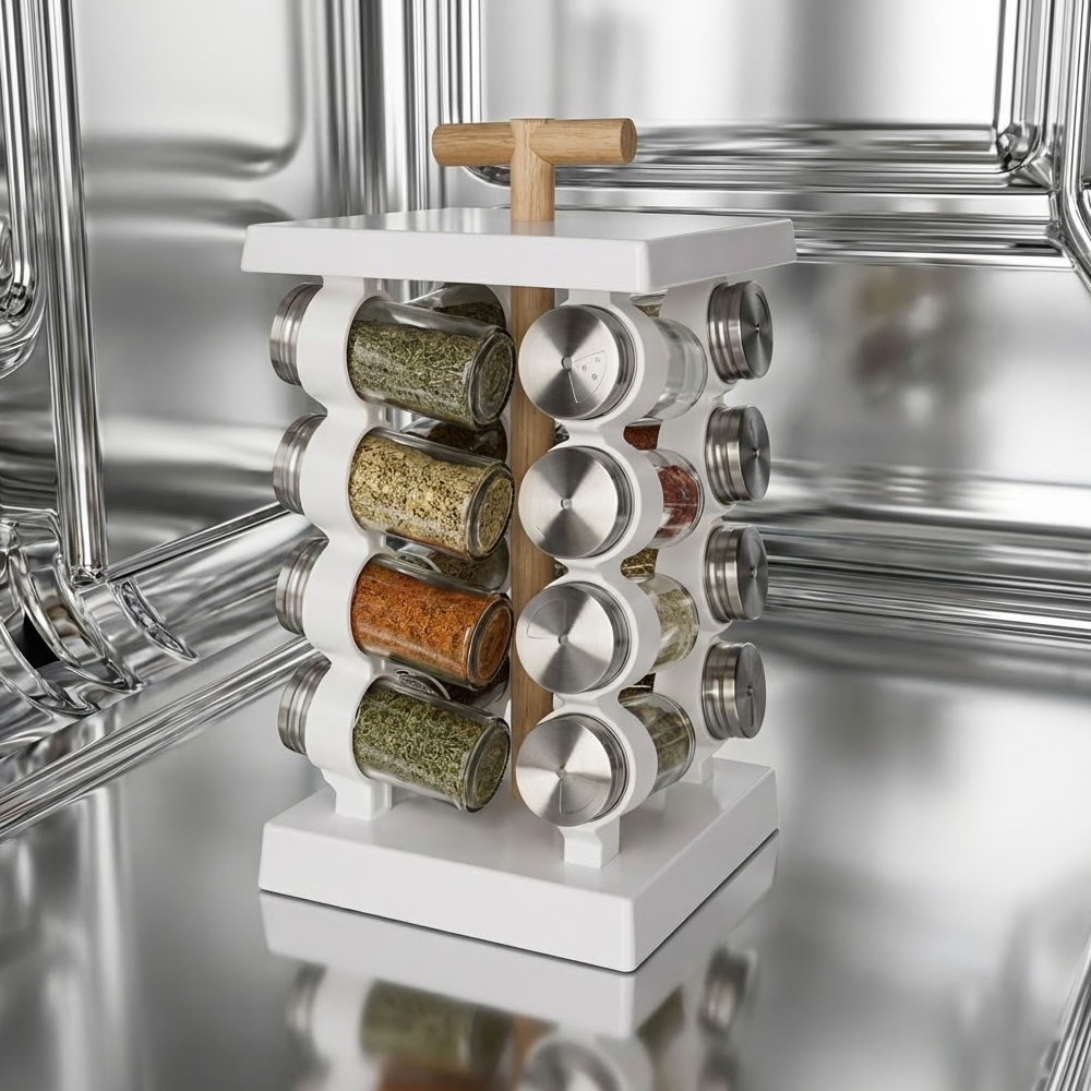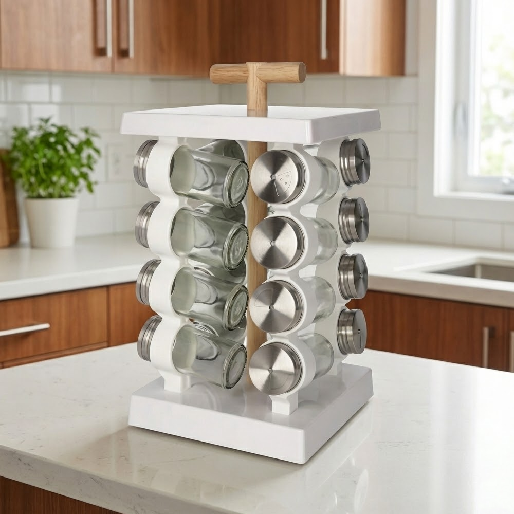 حوّل مطبخك إلى مساحة منظمة وأنيقة مع منظم البهارات الدوّار 360 درجة، المصمم ليجمع بين الجمال والعملية. يأتي مع 16 علبة بهارات زجاجية بأغطية ستانلس ستيل محكمة، مرتبة على قاعدة دوّارة تتيح الوصول السريع والسهل لجميع التوابل أثناء الطهي.