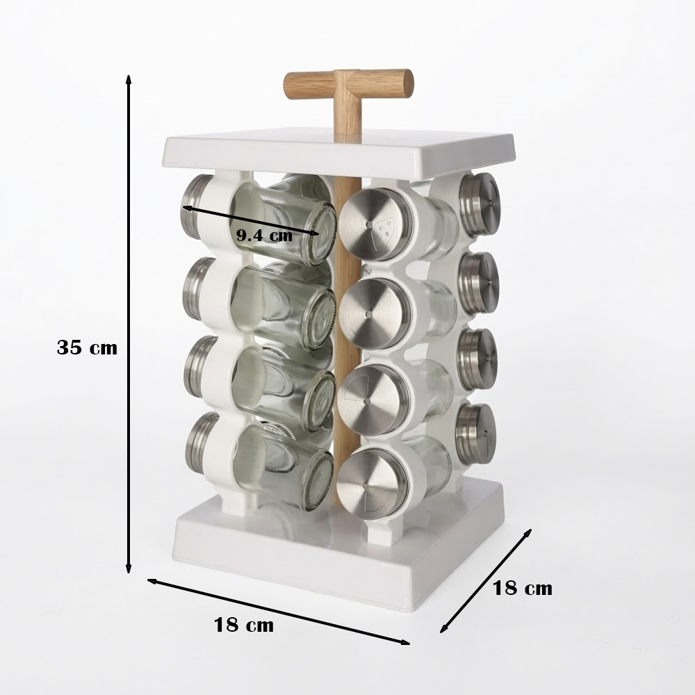 منظم بهارات دوّار 360° مع 16 علبة زجاج – تصميم أنيق بلمسة خشبية