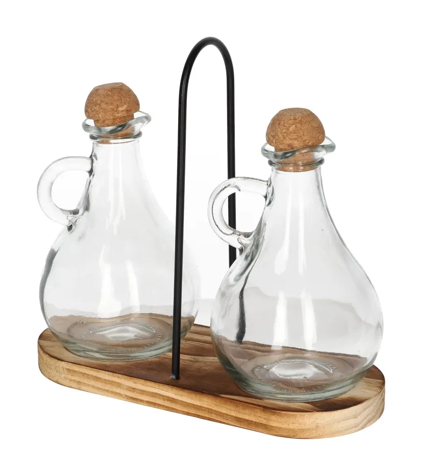 مثالي لتخزين التوابل السائلة، مثل الزيت وزيت الزيتون والخل والصلصات والتتبيلات. يأتي مع حامل خشبي.