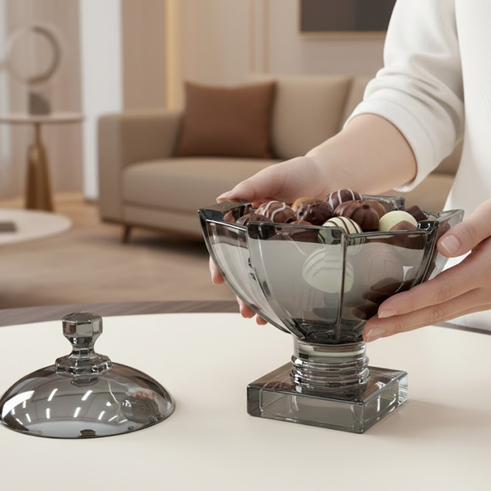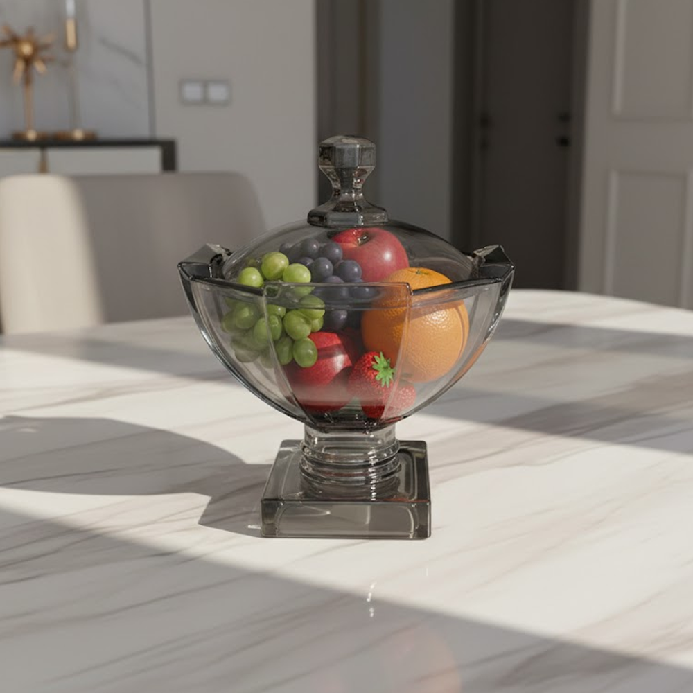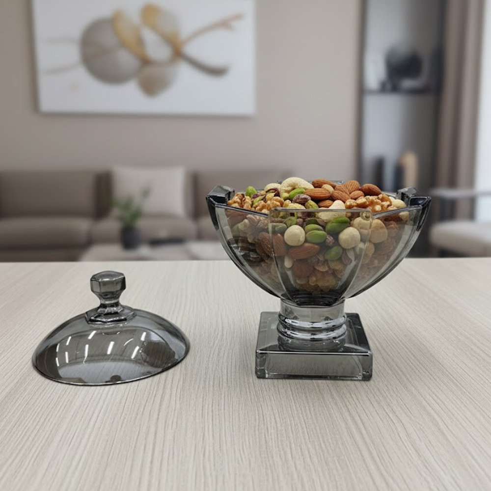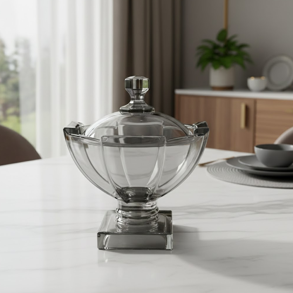 وعاء تقديم زجاجي بتصميم راقٍ يجمع بين الفخامة والعملية، مصنوع من زجاج شفاف بلون دخاني أنيق مع قاعدة ثابتة تضيف له حضورًا مميزًا على طاولة الضيافة. يأتي مع غطاء زجاجي بمقبض أنيق يحافظ على المحتويات طازجة ونظيفة، ويمنحك تجربة تقديم منظمة وراقية.