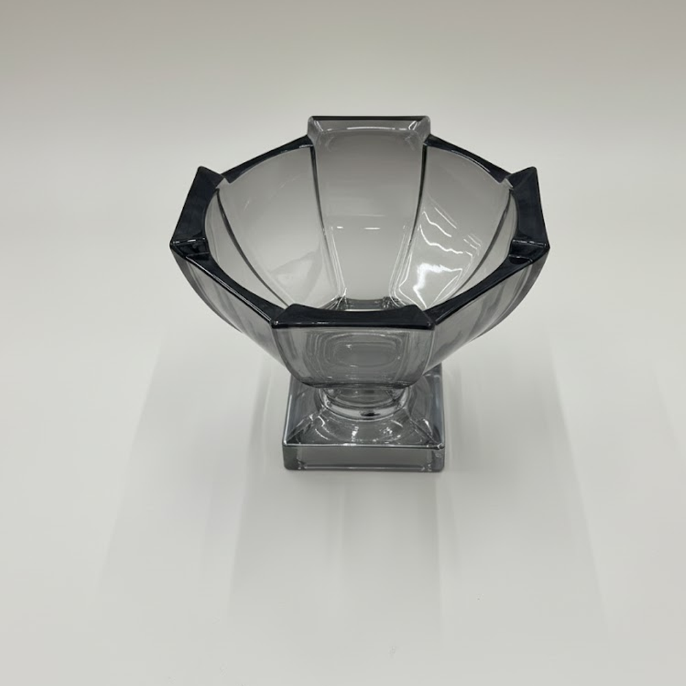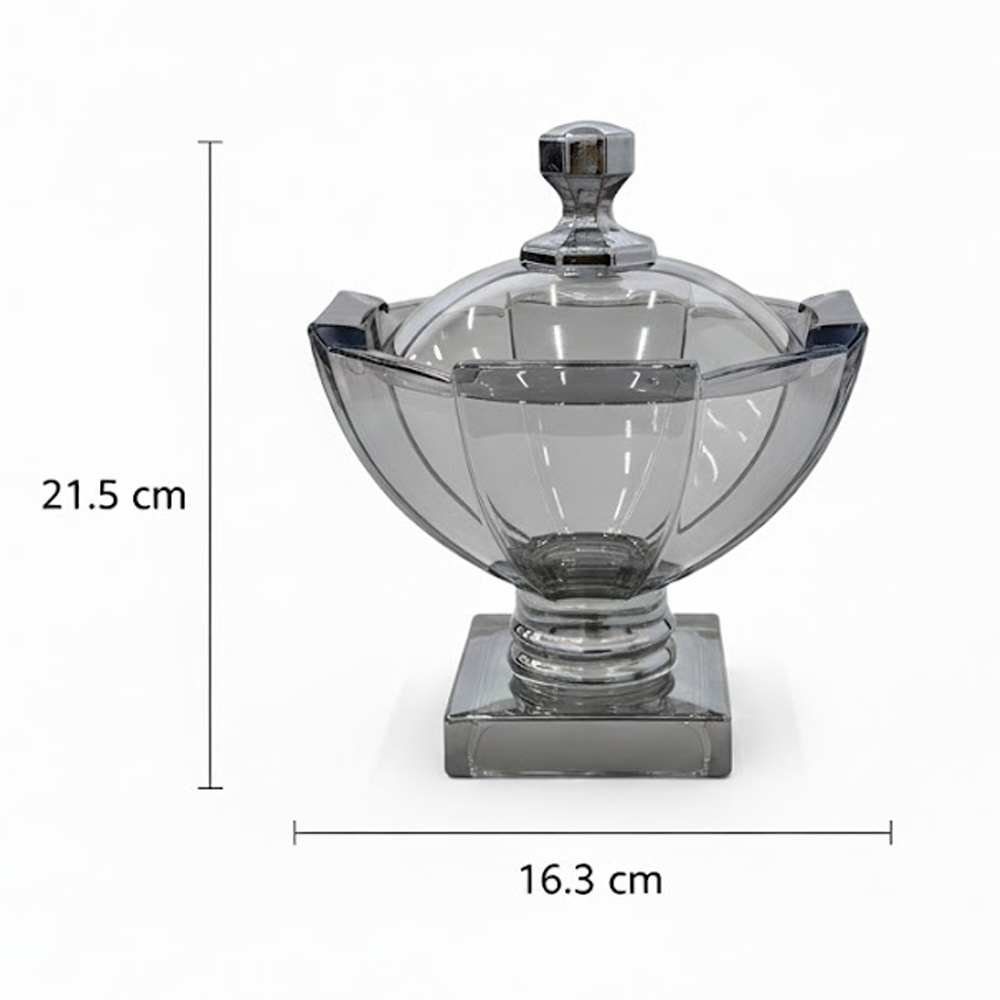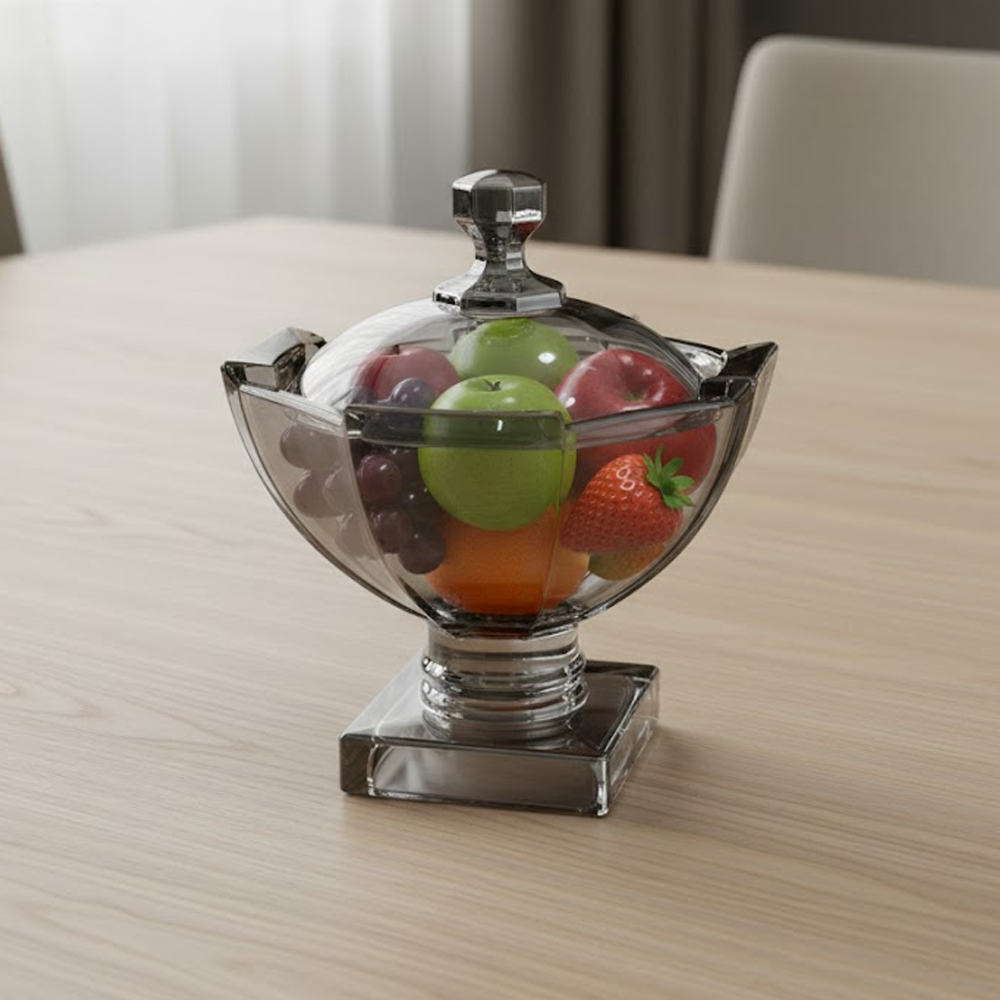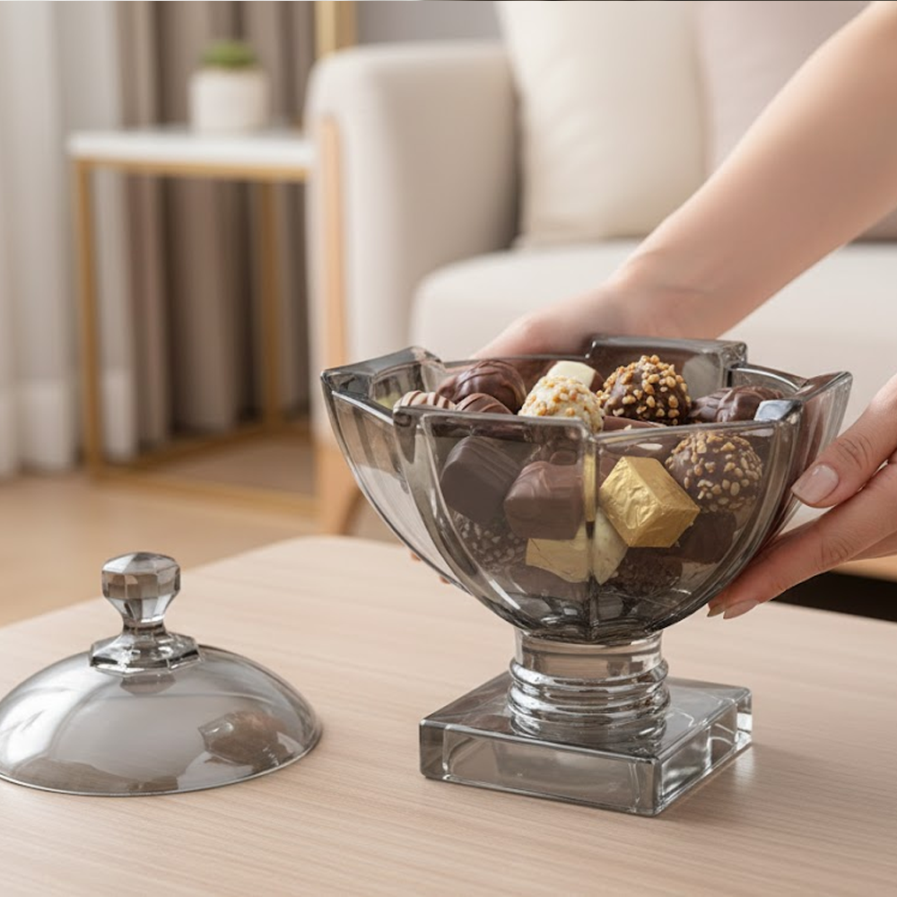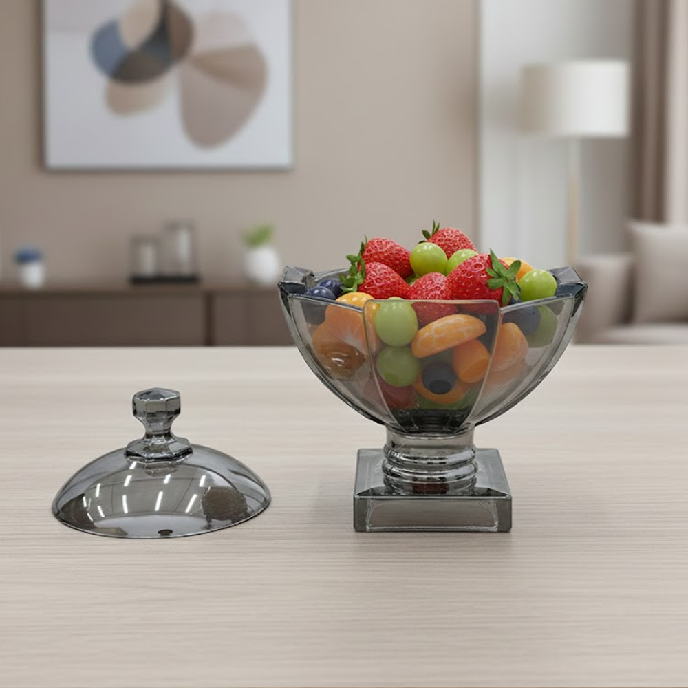 وعاء تقديم زجاجي بتصميم راقٍ يجمع بين الفخامة والعملية، مصنوع من زجاج شفاف بلون دخاني أنيق مع قاعدة ثابتة تضيف له حضورًا مميزًا على طاولة الضيافة. يأتي مع غطاء زجاجي بمقبض أنيق يحافظ على المحتويات طازجة ونظيفة، ويمنحك تجربة تقديم منظمة وراقية.