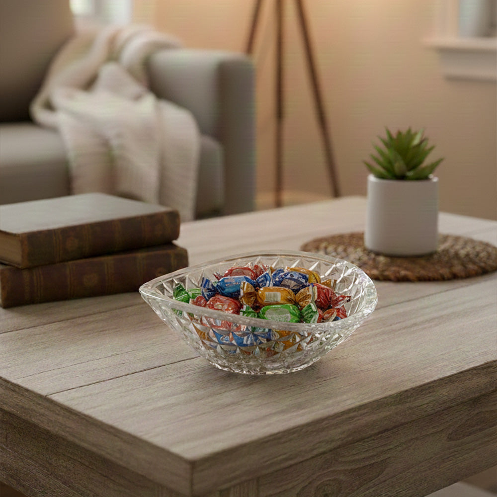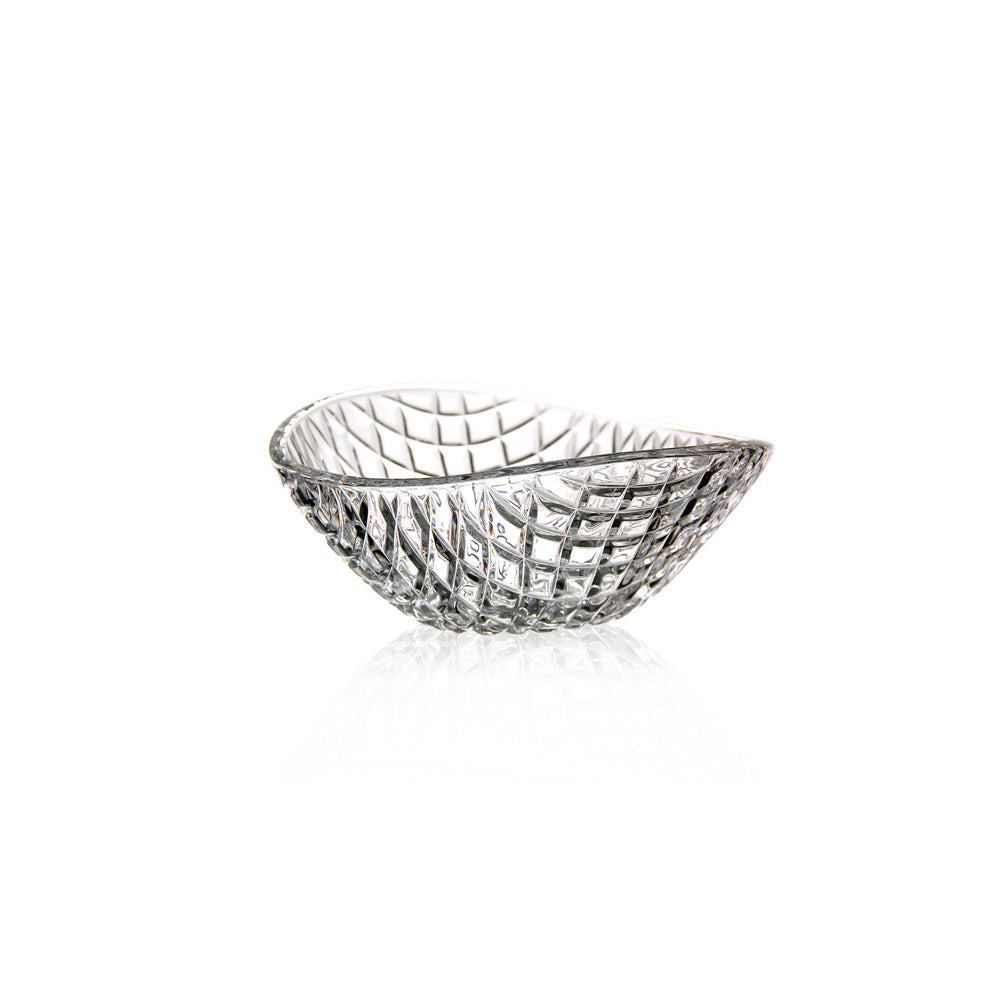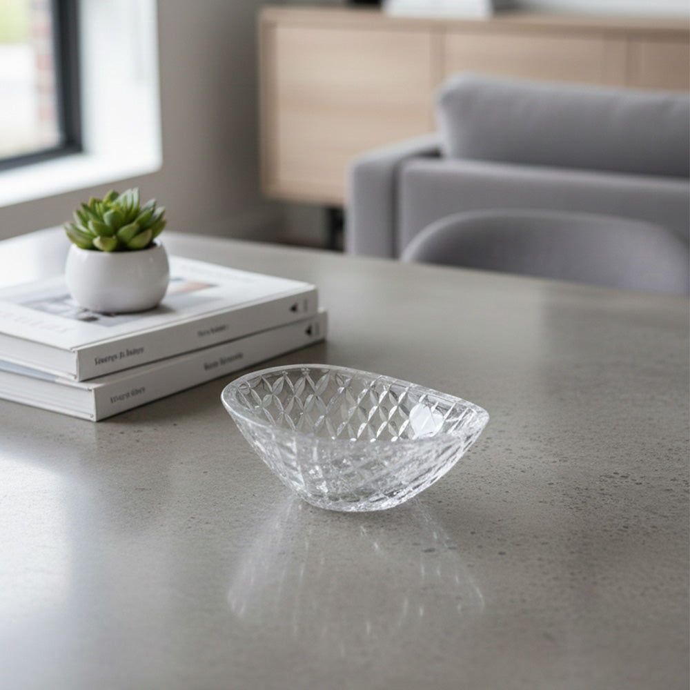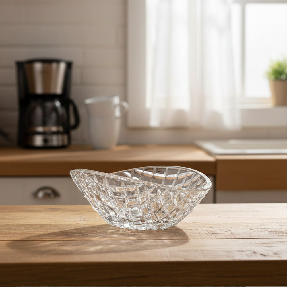 هذا وعاء تقديم صغير وأنيق مصنوع من زجاج شفاف مقصوص. يتميز بسطح خارجي مزخرف بشكل ماسي يعكس الضوء بشكل جميل، مما يمنحه مظهرًا زخرفيًا راقيًا. يتميز الوعاء بشكله العضوي غير المتماثل قليلاً، مما يجعله عمليًا وأنيقًا في آن واحد.
