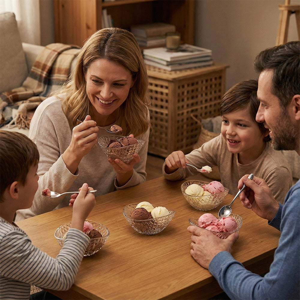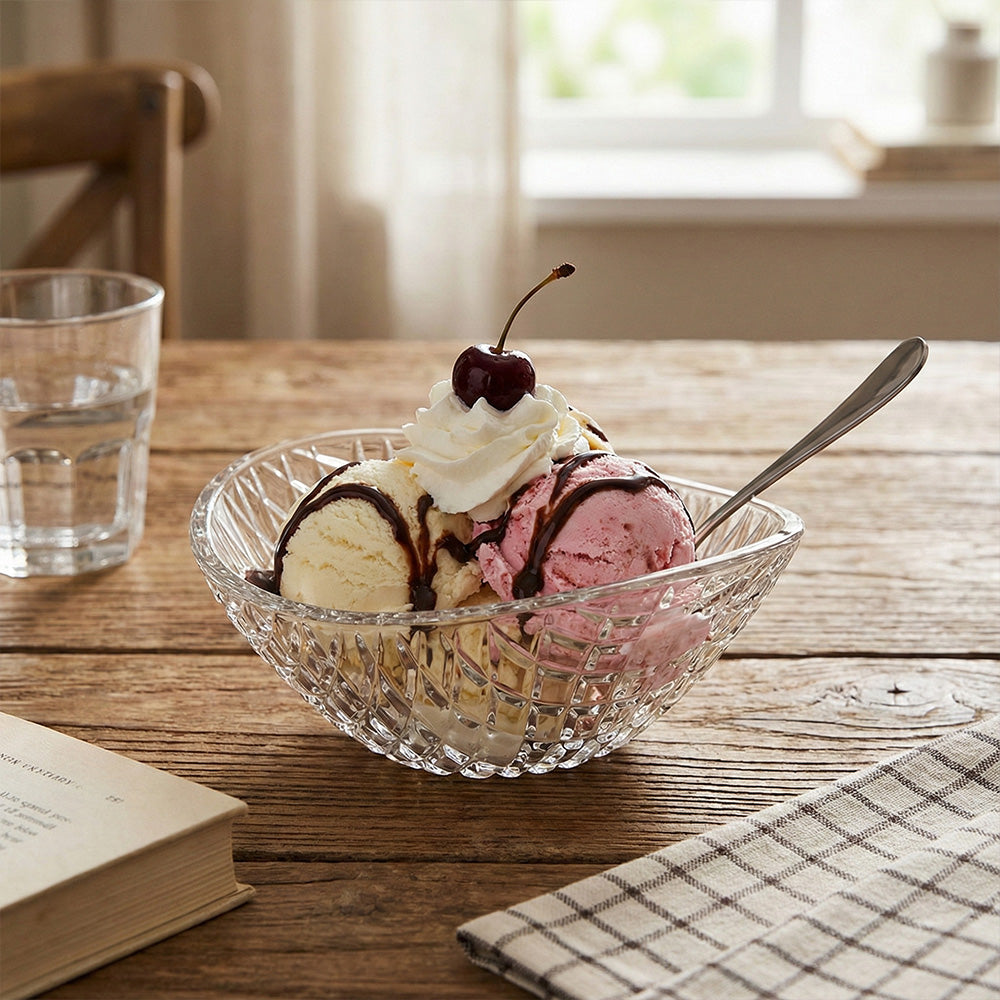 بعرض 16 سم وارتفاع 6.5 سم، يُعد مثاليًا لتقديم الحلويات مثل الآيس كريم والفواكه والحلوى والمكسرات أو الوجبات الخفيفة الصغيرة. هيكله الزجاجي المتين يجعله مناسبًا للاستخدام اليومي، وكذلك لتزيين طاولات غرف المعيشة وغرف الطعام والمطابخ.