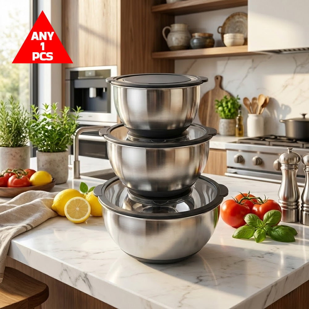 متوفر بأحجام متعددة لتناسب مختلف الاحتياجات، هذا الوعاء مثالي للخلط، والتخزين، والتتبيل، وتقديم السلطات، أو تحضير العجين. تصميمه العصري والبسيط يجعله مناسبًا للاستخدام المنزلي والمهني على حد سواء.