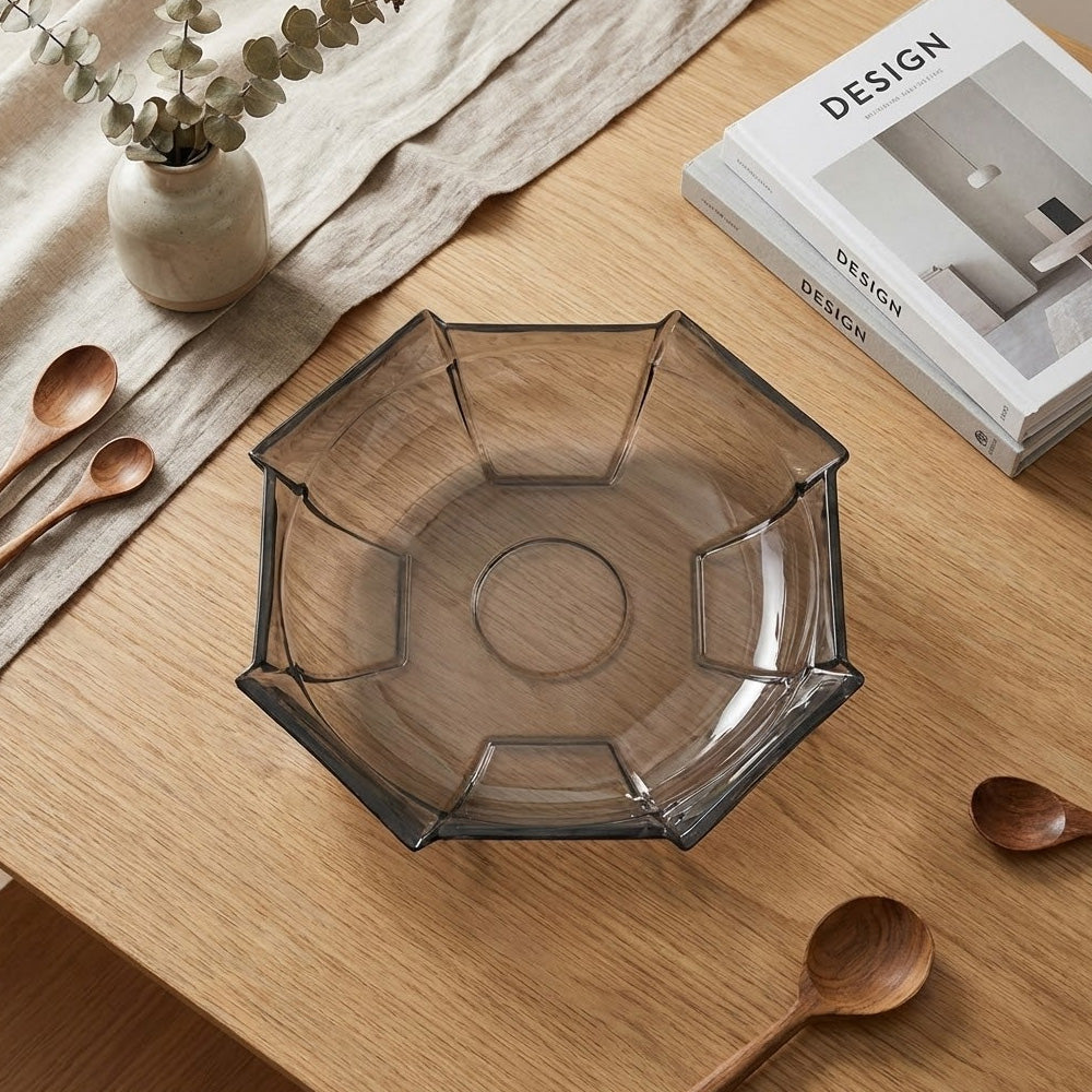 أضف لمسة من الأناقة العصرية إلى مائدتك مع وعاء الفاكهة الكريستالي السداسي (عرض 30 سم). يتميز هذا الوعاء بتصميم هندسي فريد ولمسة نهائية شفافة أنيقة بلون دخاني، مما يجعله مثاليًا لعرض الفواكه الطازجة وإضفاء لمسة جمالية على أي مطبخ أو غرفة طعام.