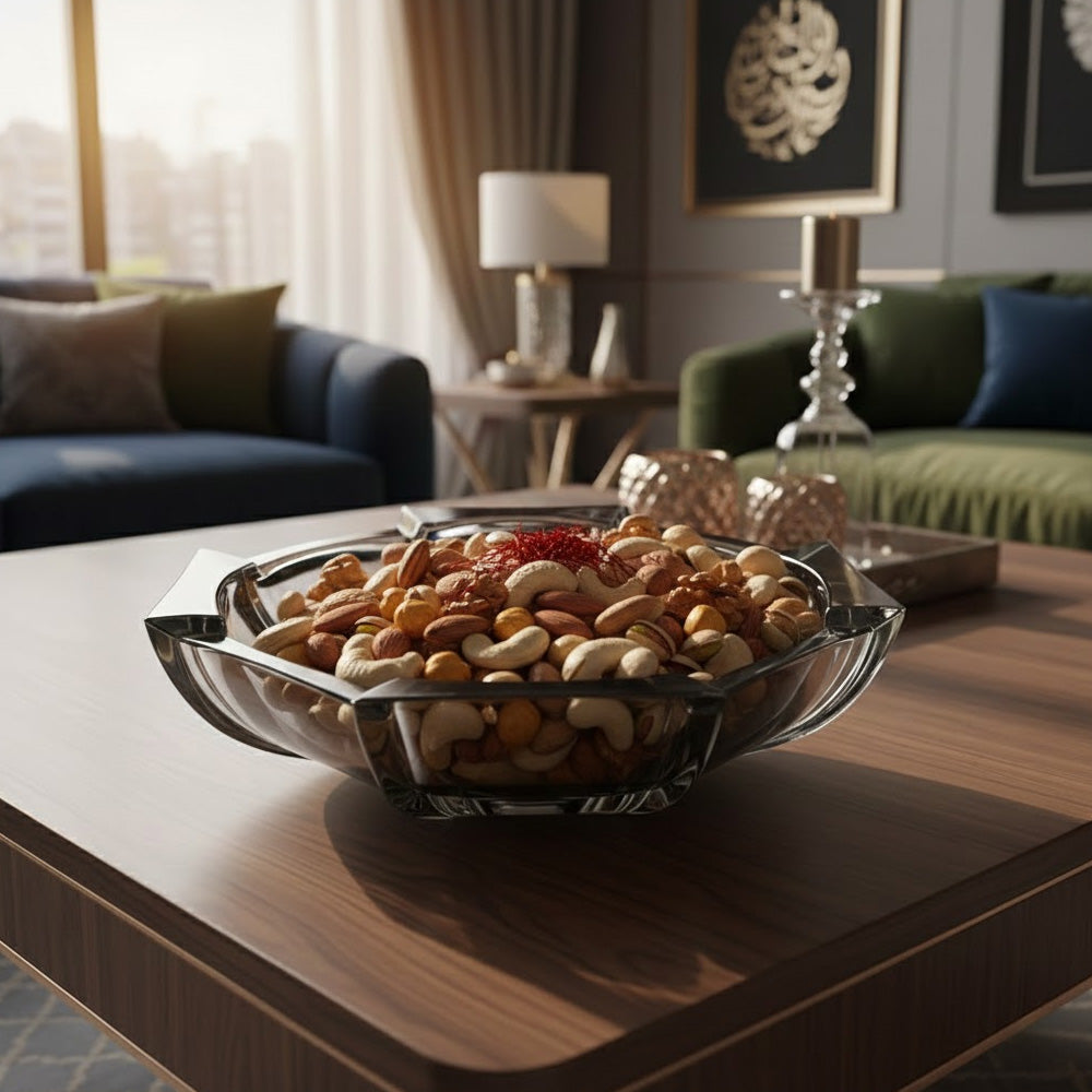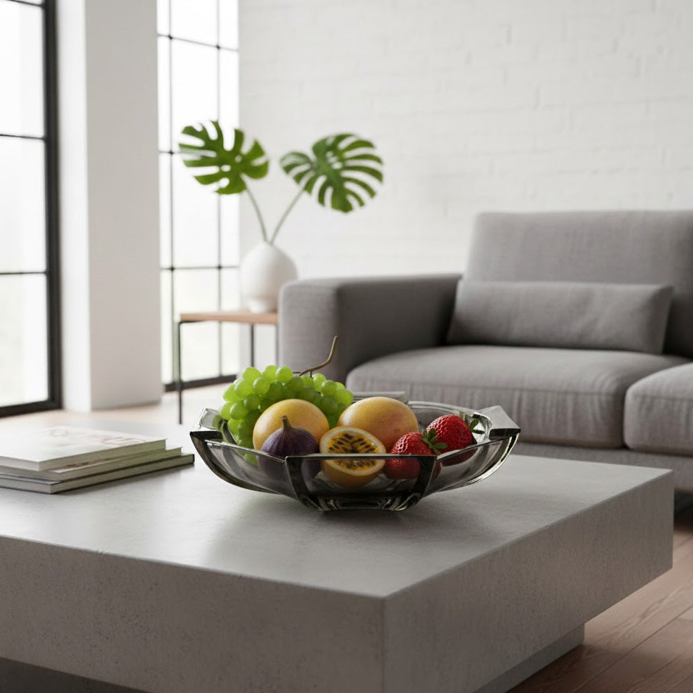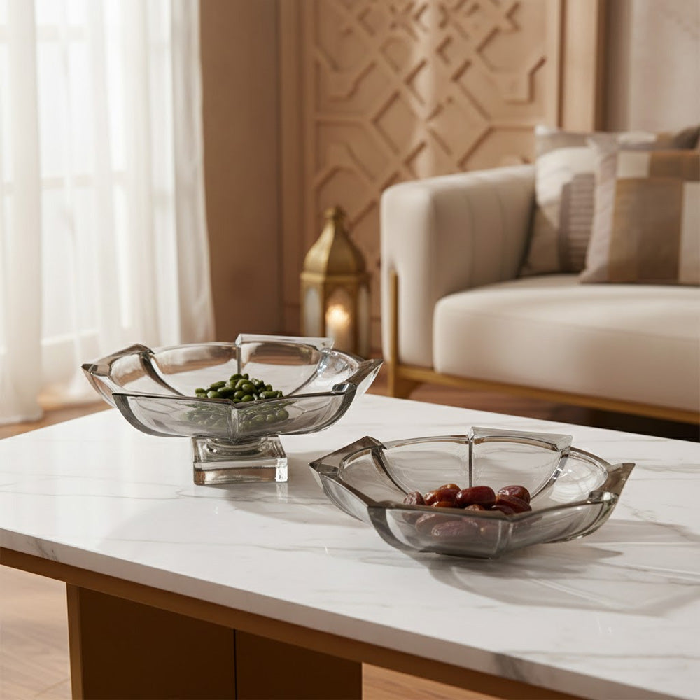 صُنع كل وعاء من أكريليك شفاف عالي الجودة بلمسة نهائية كريستالية دخانية راقية، مما يجعله يعكس الضوء بشكل جميل مع توفير متانة للاستخدام اليومي. يُعد الوعاء الكبير مثاليًا لعرض الفواكه الطازجة أو لتقديمها في التجمعات، بينما يُعد الوعاء الصغير مثاليًا للوجبات الخفيفة أو المكسرات أو التمر أو كقطع ديكور مميزة.
