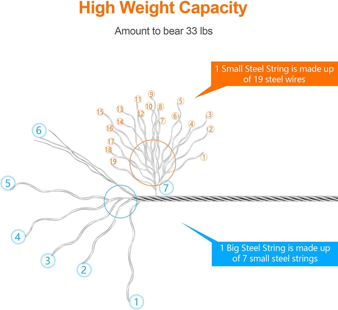 - Max Weight: 33 Pounds. Our high quality stainless steel rope can hold a maximum weight of 33 pounds when mounted.