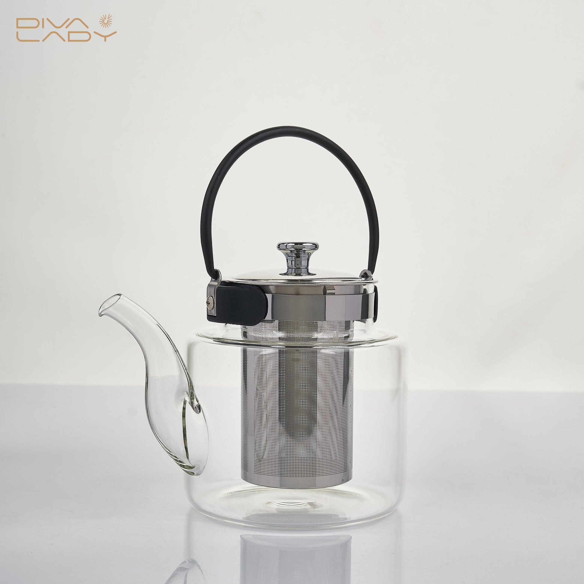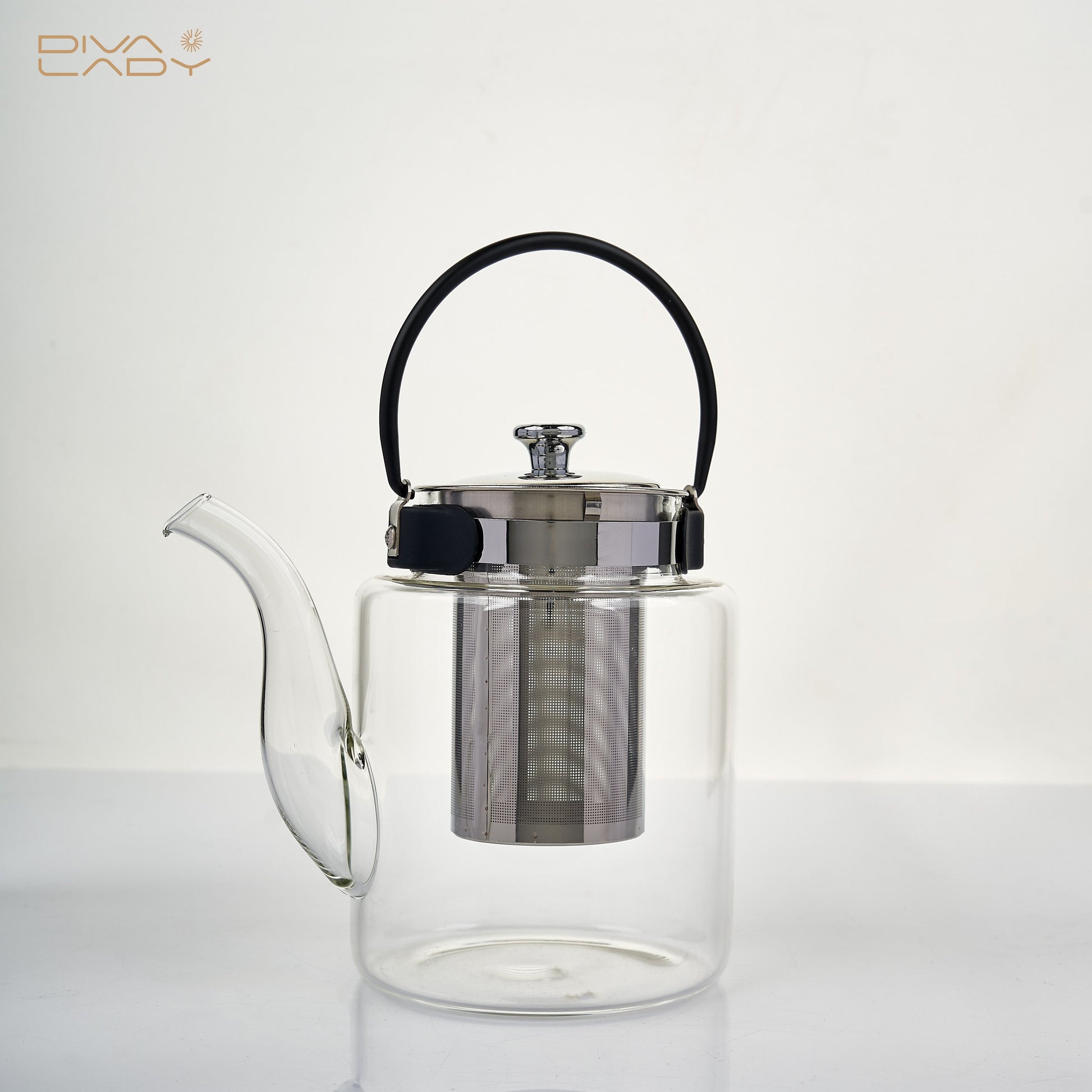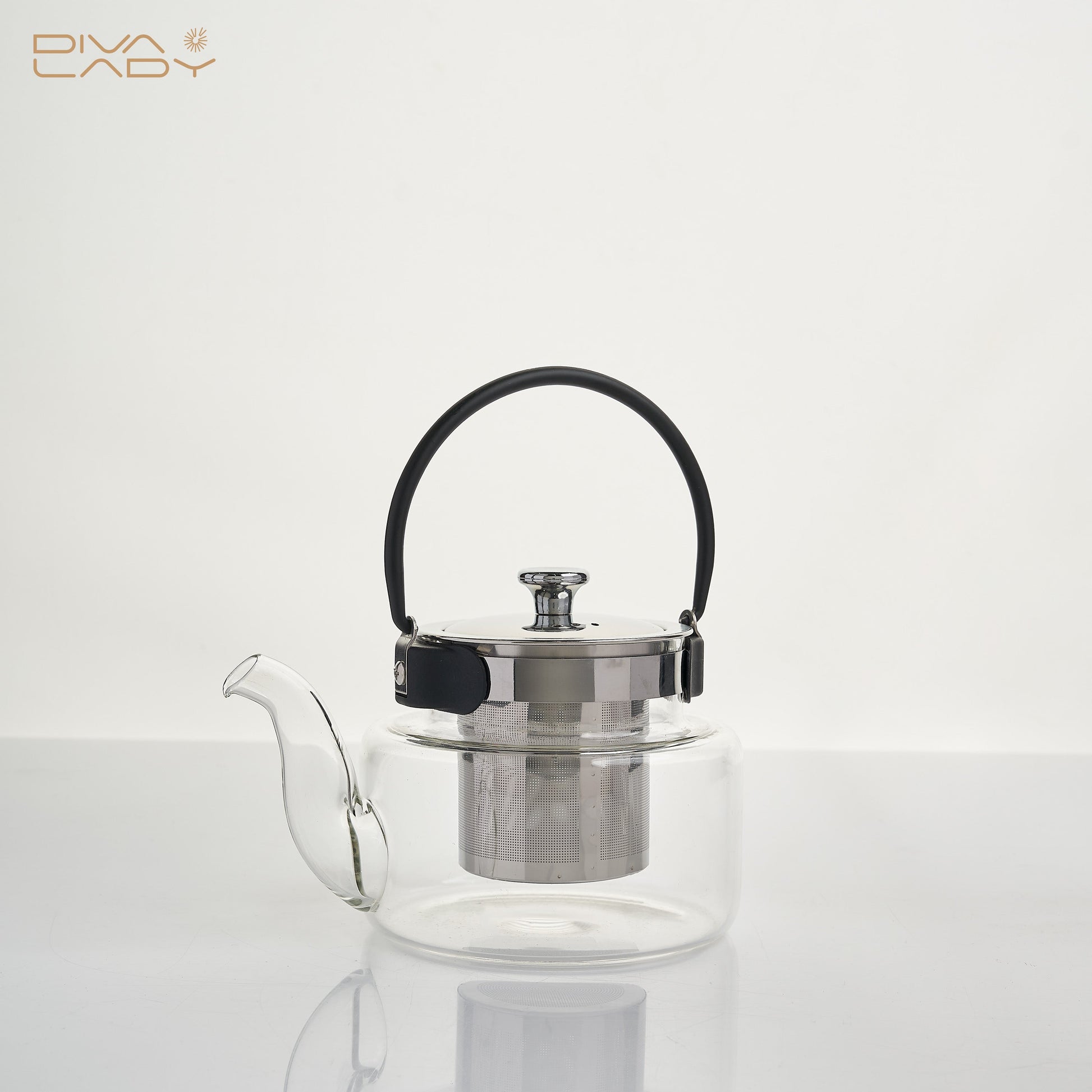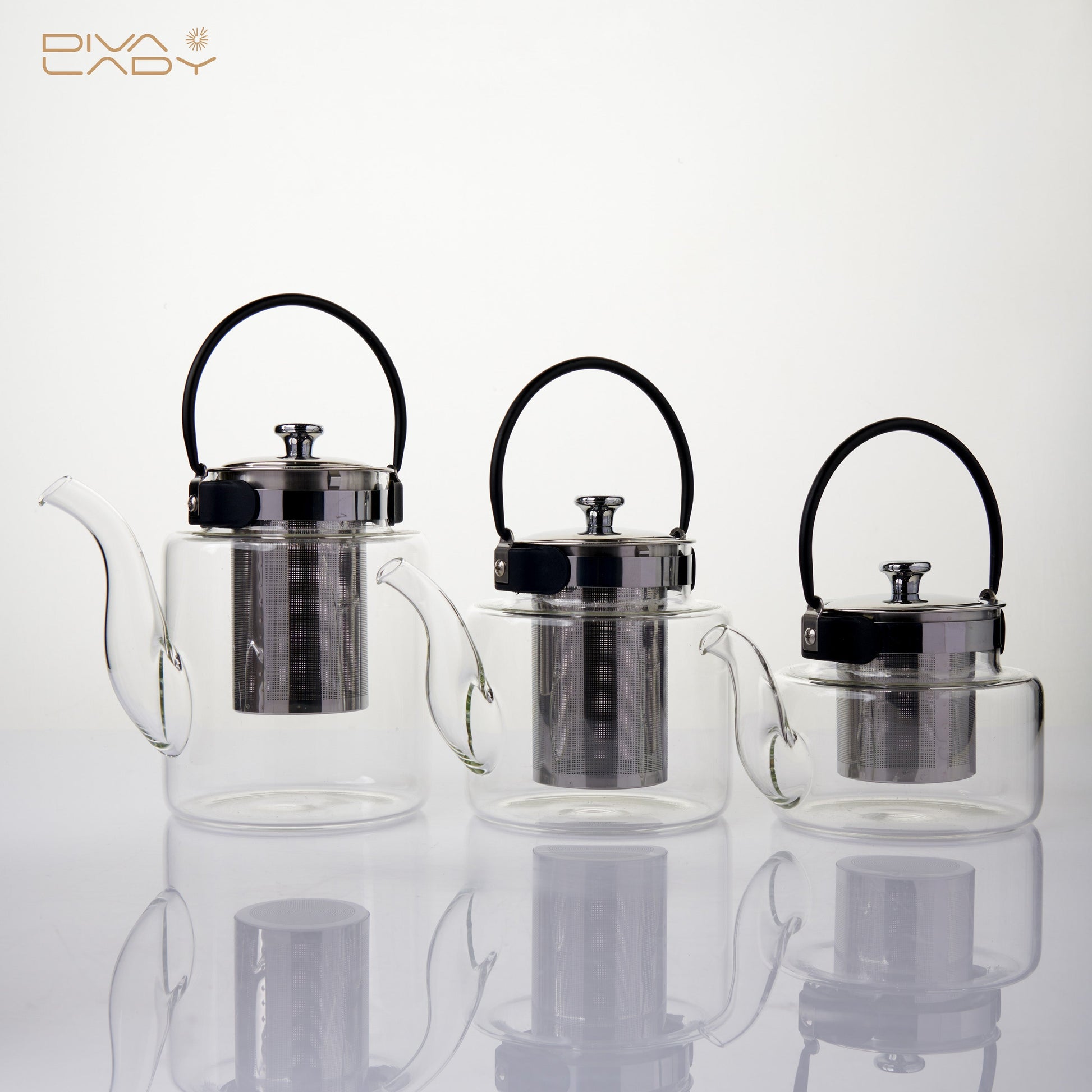 غورى مصنوع من زجاج البايركس المقاوم للنار بتصميم عصري وانيق مع مصفاة و غطاء مصنوعين من الاستيل الفضى المقاوم للصدا