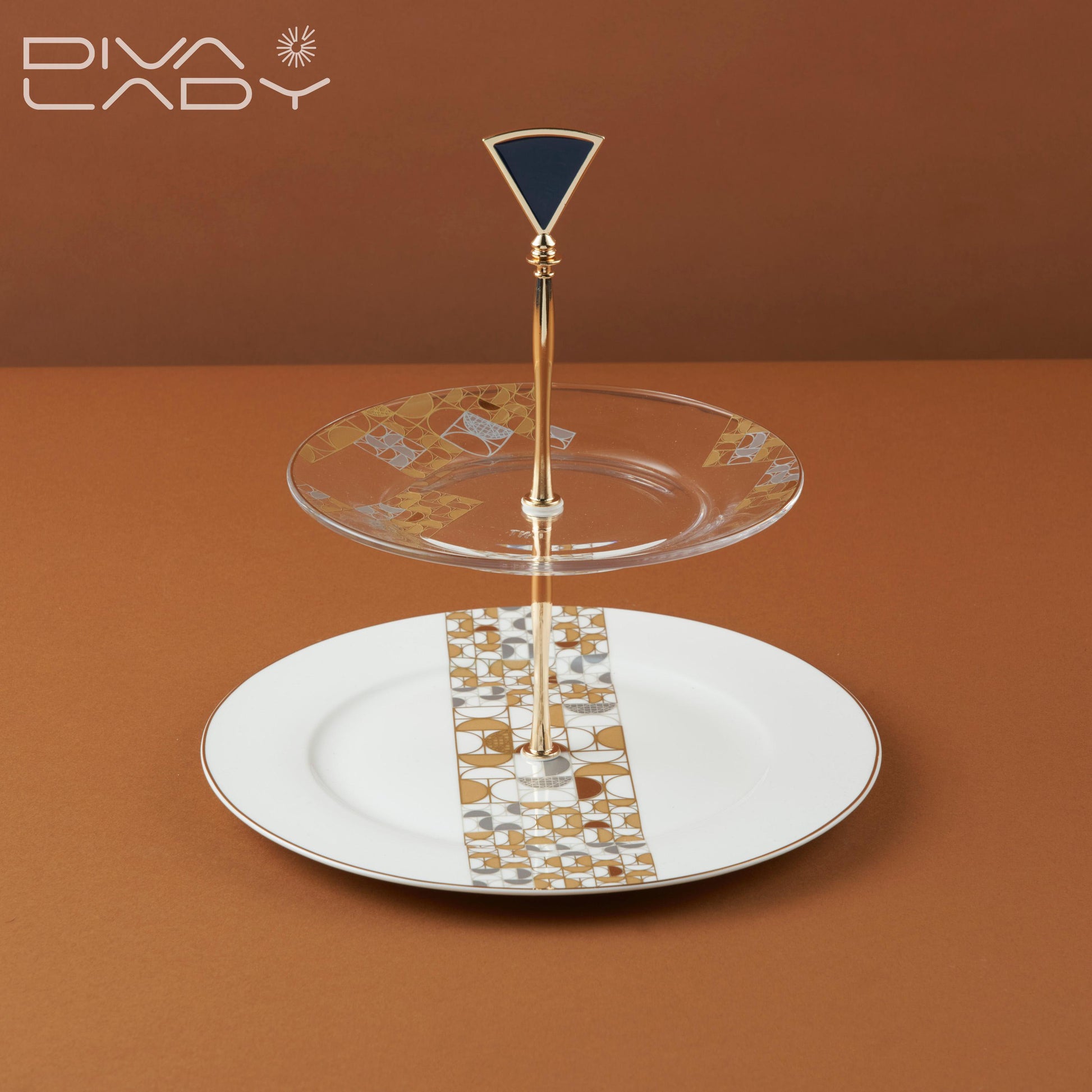 قطعة أنيقة وعملية مصممة لعرض الحلويات والوجبات الخفيفة بطريقة جذابة يتكون من طبقتين دائريتين مثبتتين على عمود معدني ذهبي تتميز الطبق العلوي بتصميم بسيط وأنيق مصنوع من الزجاج العالى الجودة بينما تتميز الطبق السفلية بنقشة أنيقة