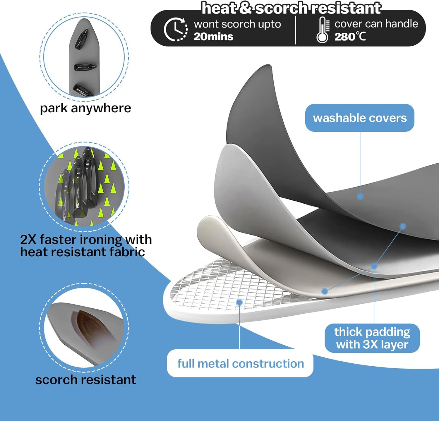 غطاء إضافي وبطانة من اللباد: يأتي مع غطاء قابل للغسل مقاوم للحرارة مصنوع من مادة القطن بنسبة 100% (تصميم حبل مرن على الحافة) وبطانة لباد سميكة وليس وسادة إسفنجية رديئة، سميكة بما فيه الكفاية، لن تترك علامة على ملابسك، للحفاظ على تجربة كي جيدة.