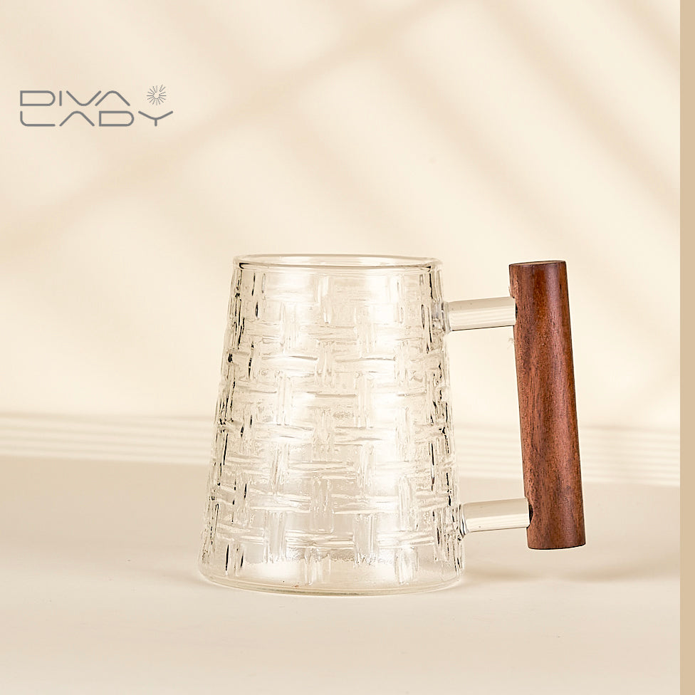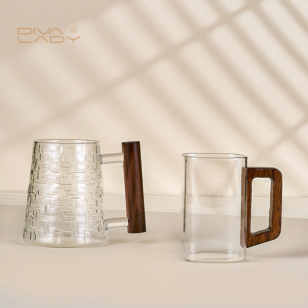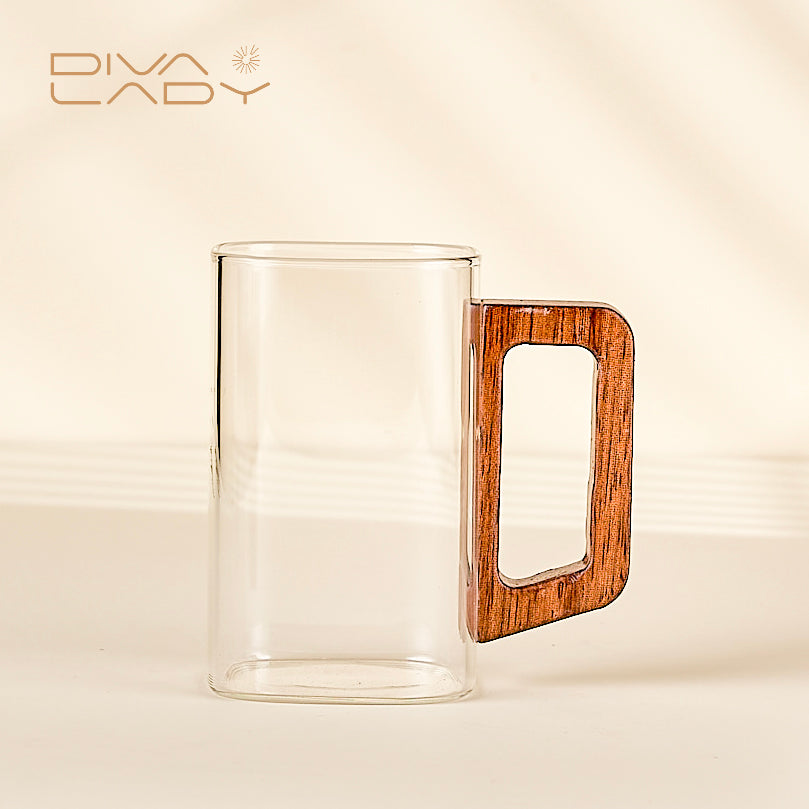 كوب زجاجي أنيق مع مقبض خشبي - مثالي للمشروبات الساخنة والباردة
