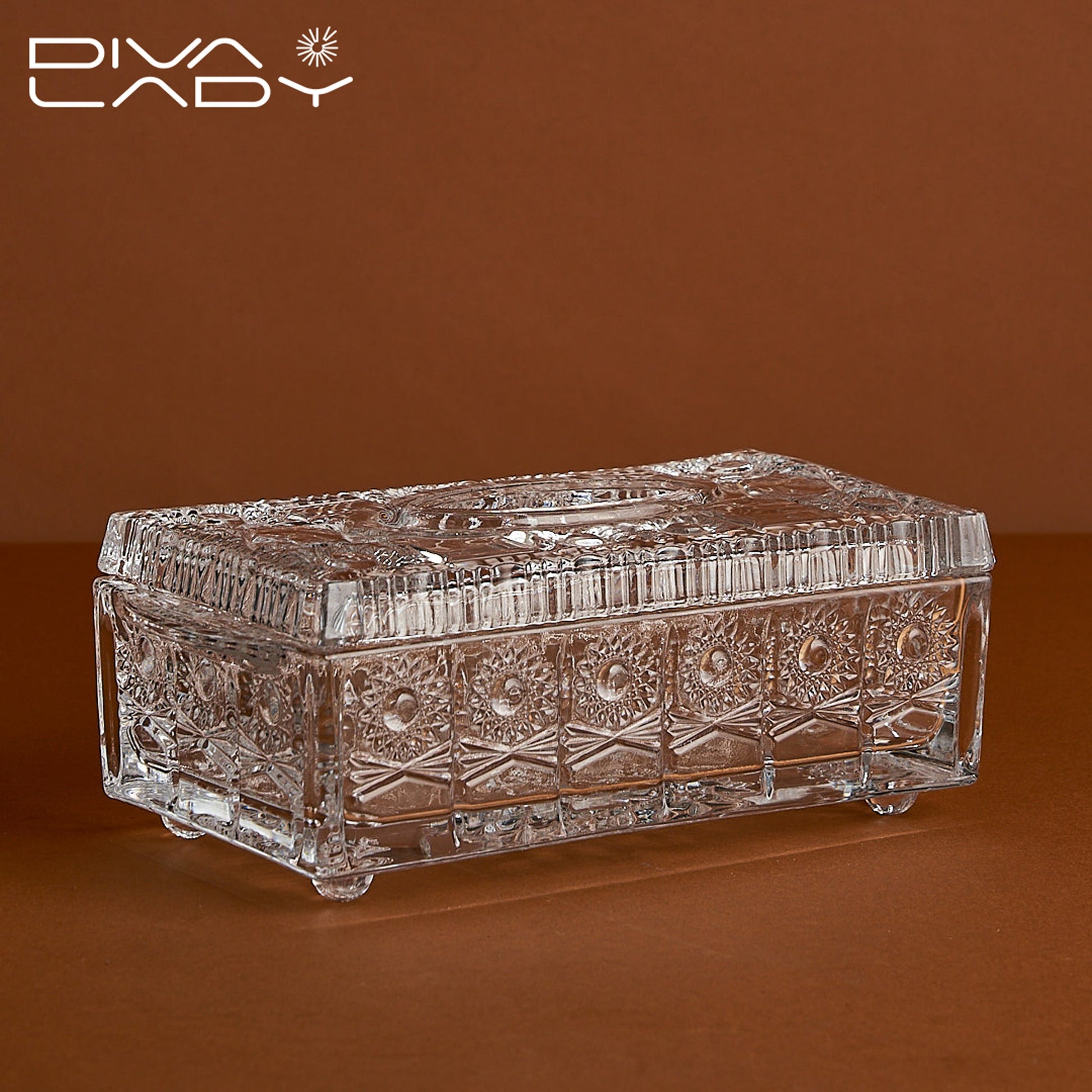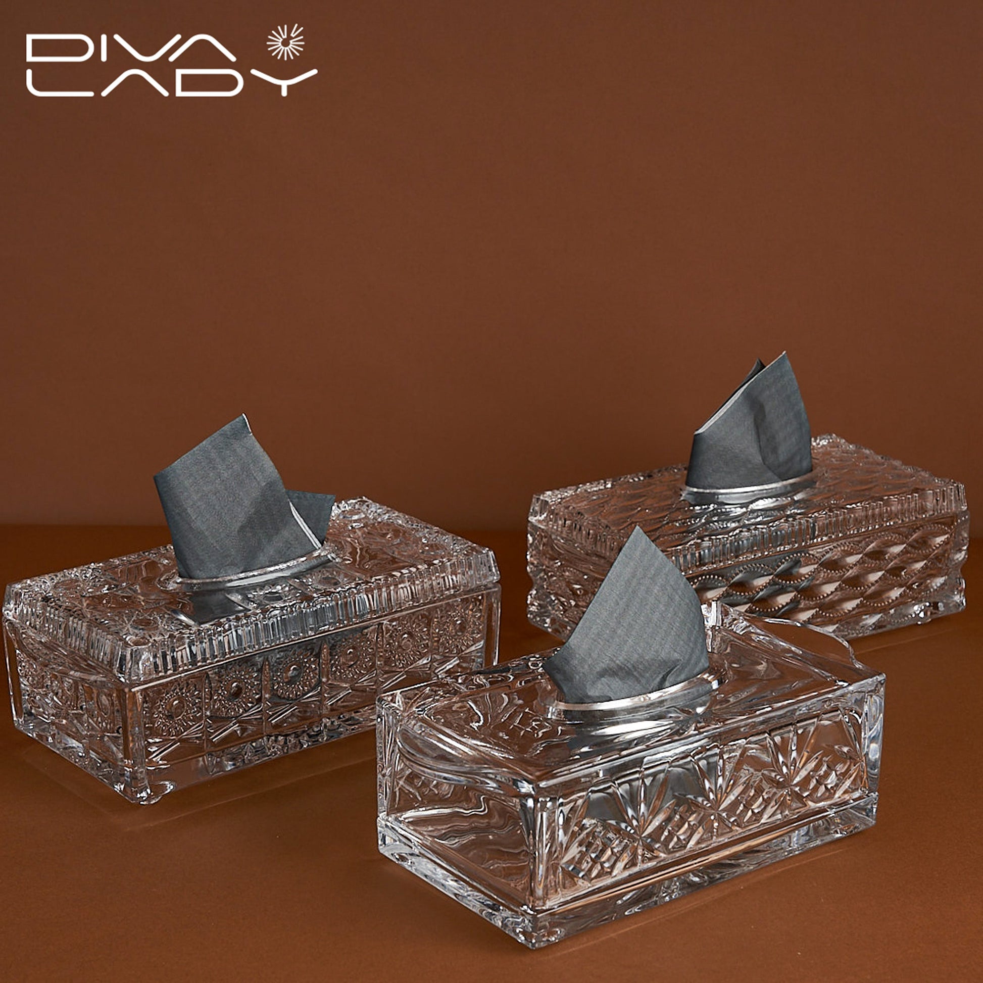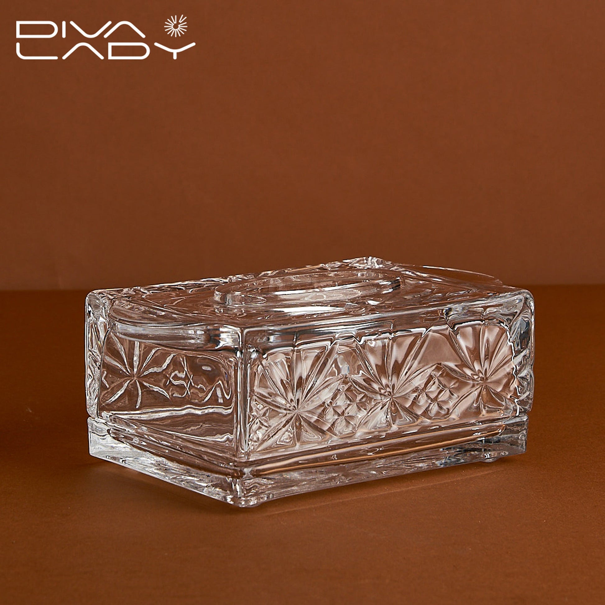 علبة الكلينكس الظاهرة في الصورة مصنوعة من الزجاج الشفاف، بتصميم أنيق وزخارف هندسية ونقوش بارزة تعطيها مظهرًا فخمًا وكلاسيكيًا. شكلها مستطيل مع فتحة علوية بيضاوية لإخراج المناديل بسهولة. تتميز بجوانب مزخرفة بتفاصيل متقنة تشبه النقوش الكريستالية، مما يضيف لمسة فاخرة تناسب الأماكن الأنيقة مثل المكاتب والصالات الفخمة