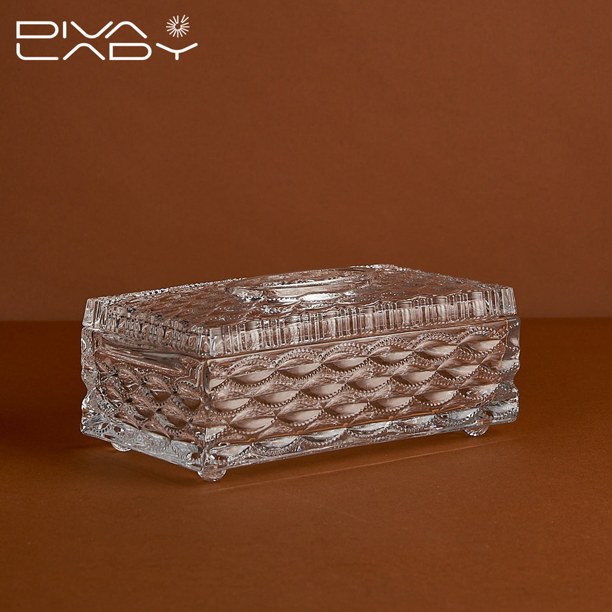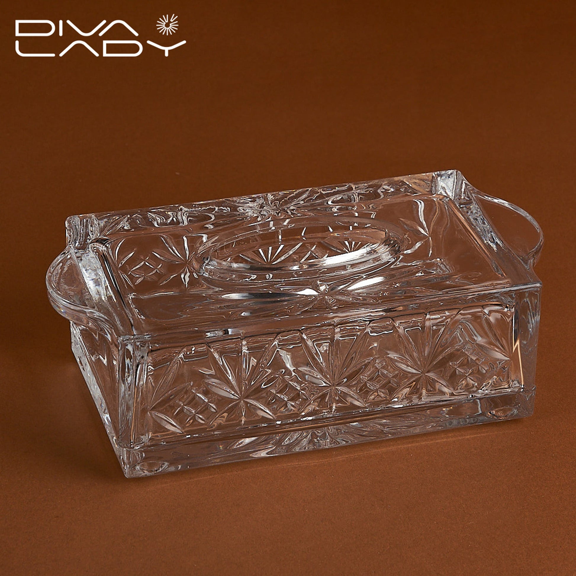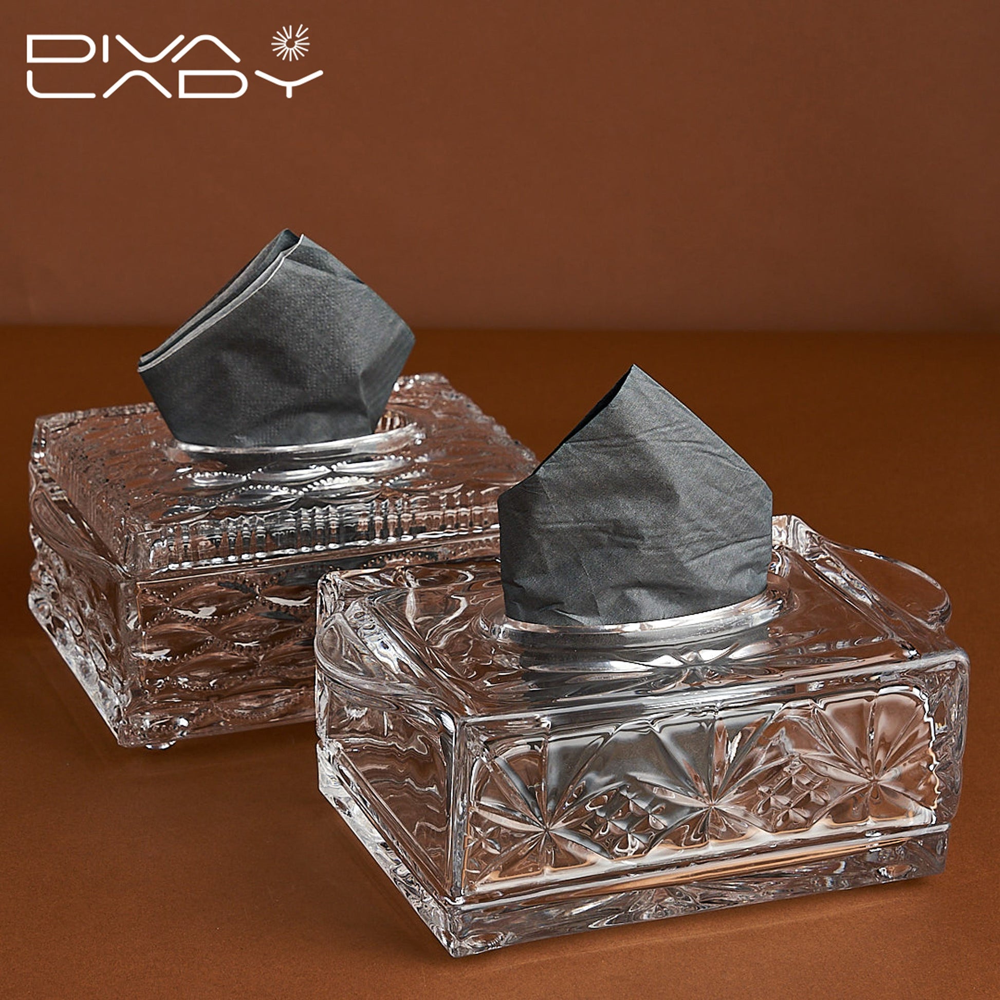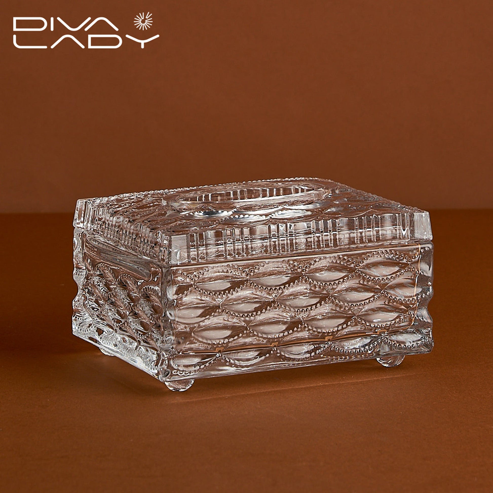 علبة الكلينكس الظاهرة في الصورة مصنوعة من الزجاج الشفاف، بتصميم أنيق وزخارف هندسية ونقوش بارزة تعطيها مظهرًا فخمًا وكلاسيكيًا. شكلها مستطيل مع فتحة علوية بيضاوية لإخراج المناديل بسهولة. تتميز بجوانب مزخرفة بتفاصيل متقنة تشبه النقوش الكريستالية، مما يضيف لمسة فاخرة تناسب الأماكن الأنيقة مثل المكاتب والصالات الفخمة