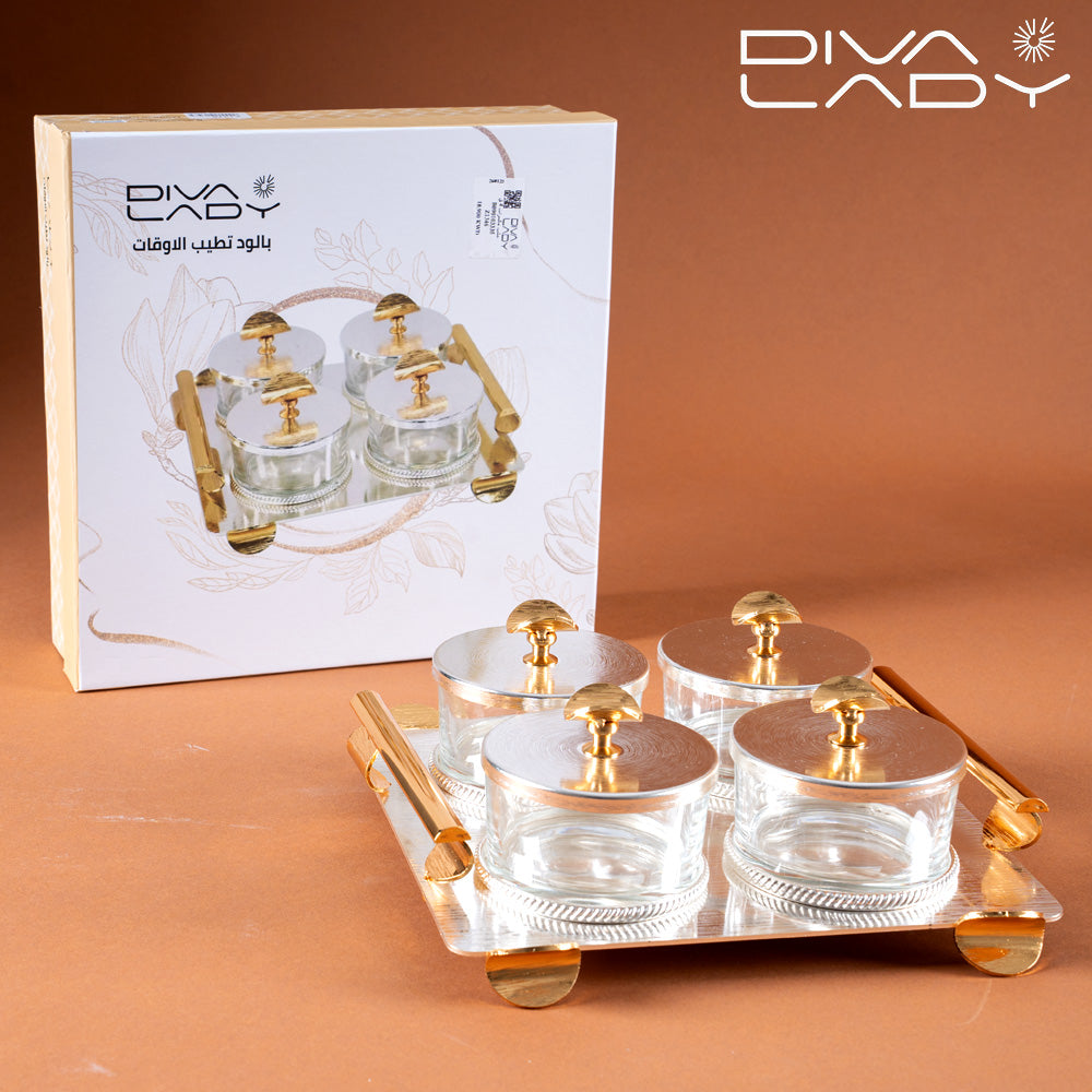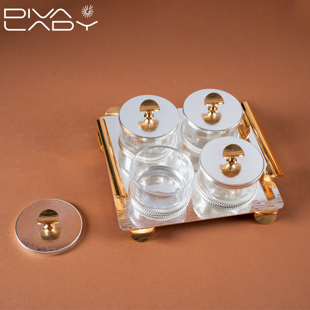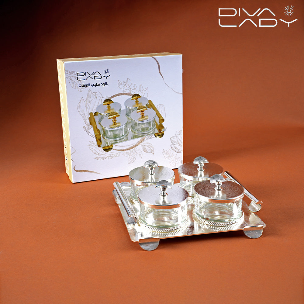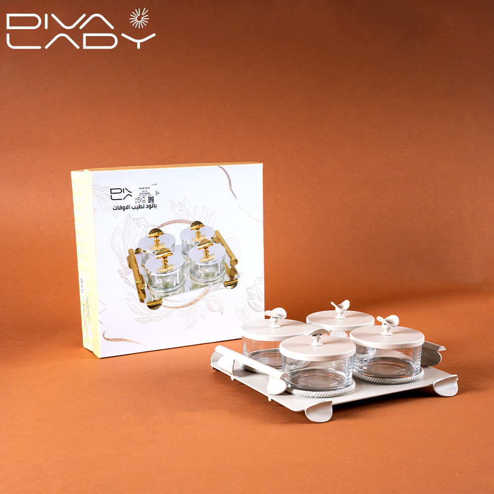 مجموعة اطباق لحفظ المكسرات بتصميم أنيق، تتكون من أربع بوادي بملمس ناعم وأغطية عاكسة مزودة بمقابض عملية. مثبتة على قاعدة مستطيلة متينة، مما يجعلها مثالية للتقديم والتنظيم.