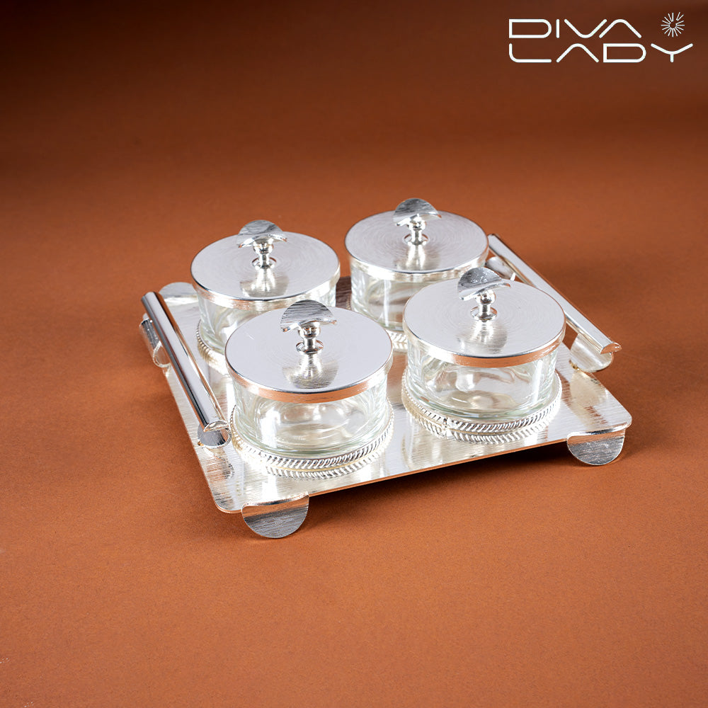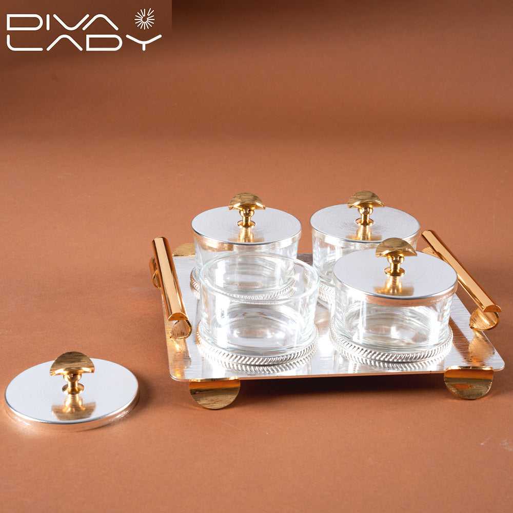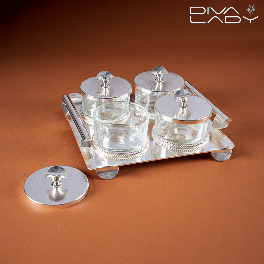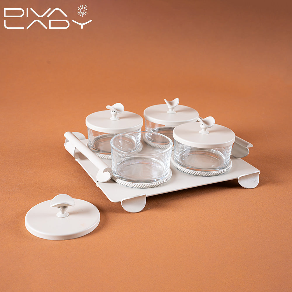 مجموعة اطباق لحفظ المكسرات بتصميم أنيق، تتكون من أربع بوادي بملمس ناعم وأغطية عاكسة مزودة بمقابض عملية. مثبتة على قاعدة مستطيلة متينة، مما يجعلها مثالية للتقديم والتنظيم.