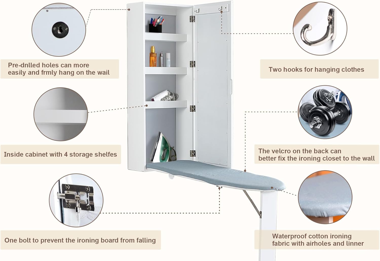 - [تركيب سهل]: يتم تجميع خزانة الكي هذه وتأتي مع التعليمات وأجهزة التركيب. لا يلزم التجميع ، ما عليك سوى اتباع التعليمات لتثبيته على الحائط