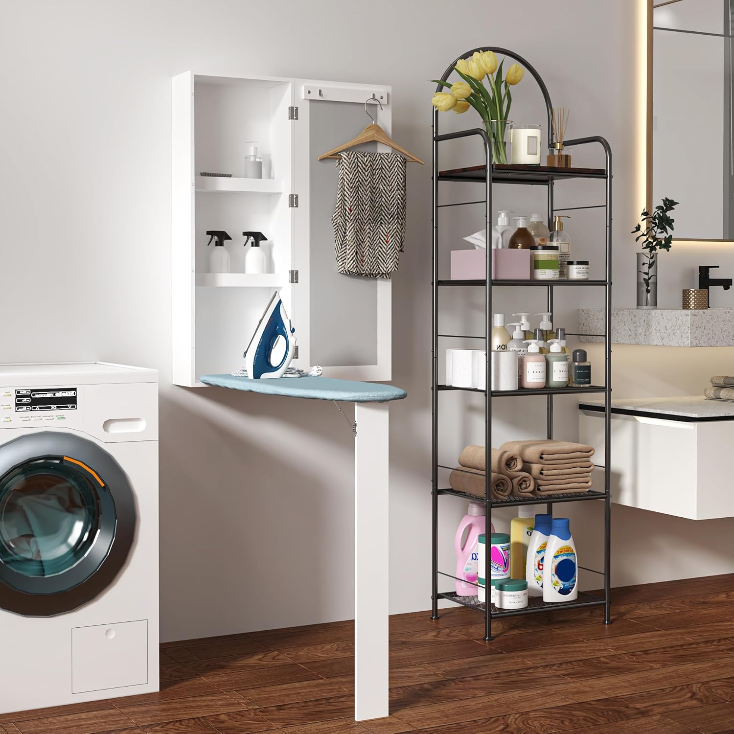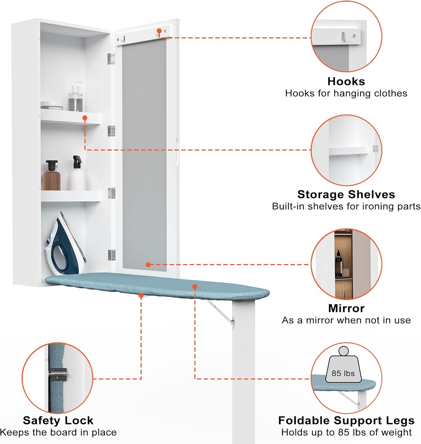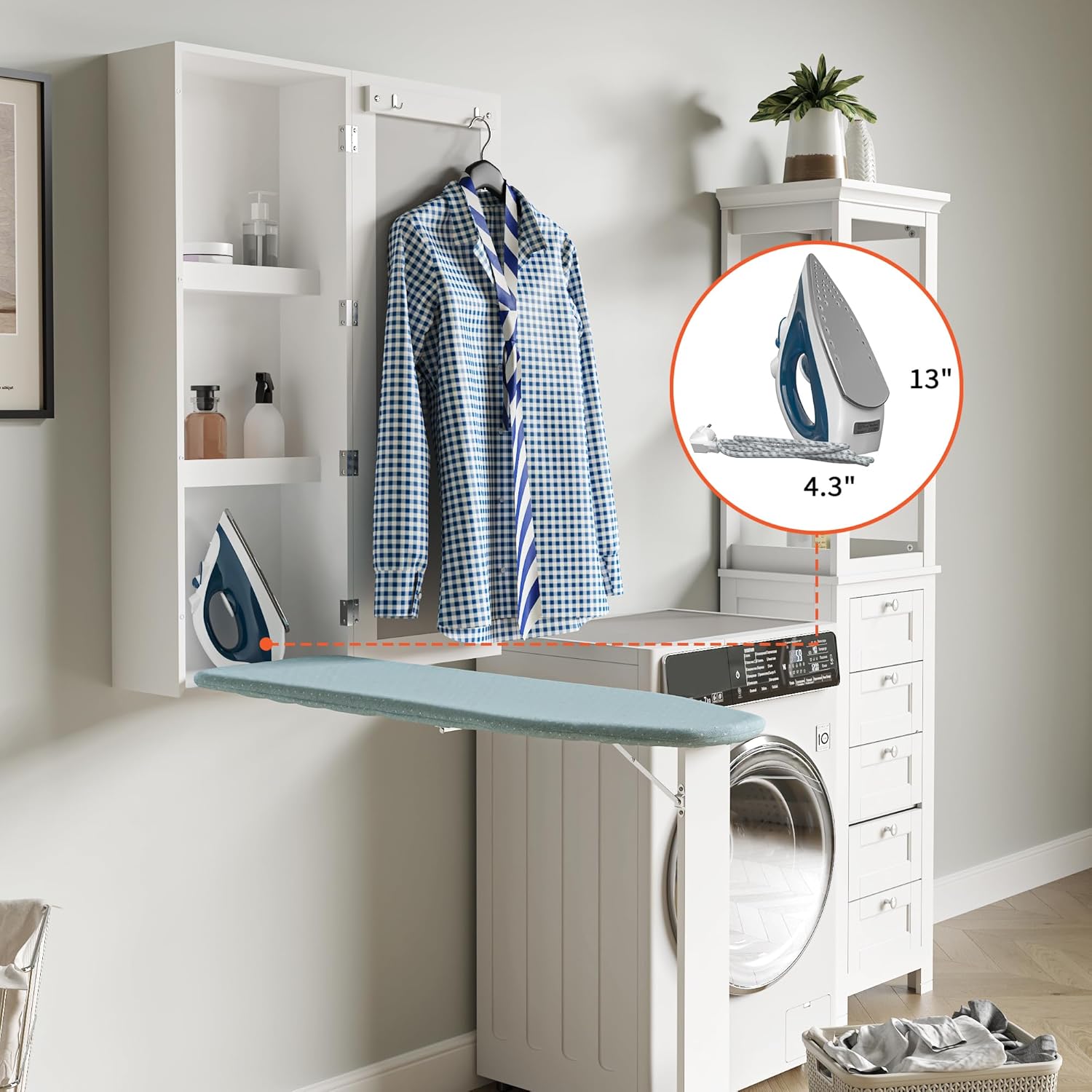 - [التخزين الإضافي]: تحتوي هذه الخزانة المثبتة على الحائط على أرفف تخزين مدمجة وحامل مناسب للحديد والمنظفات وزجاجات الرش مقاس 4.3 بوصة والعديد من ملحقات الغسيل الأخرى. هناك اثنين من السنانير شماعات على باب مجلس الوزراء لسهولة الكي. ابتعد عن متاعب التخزين