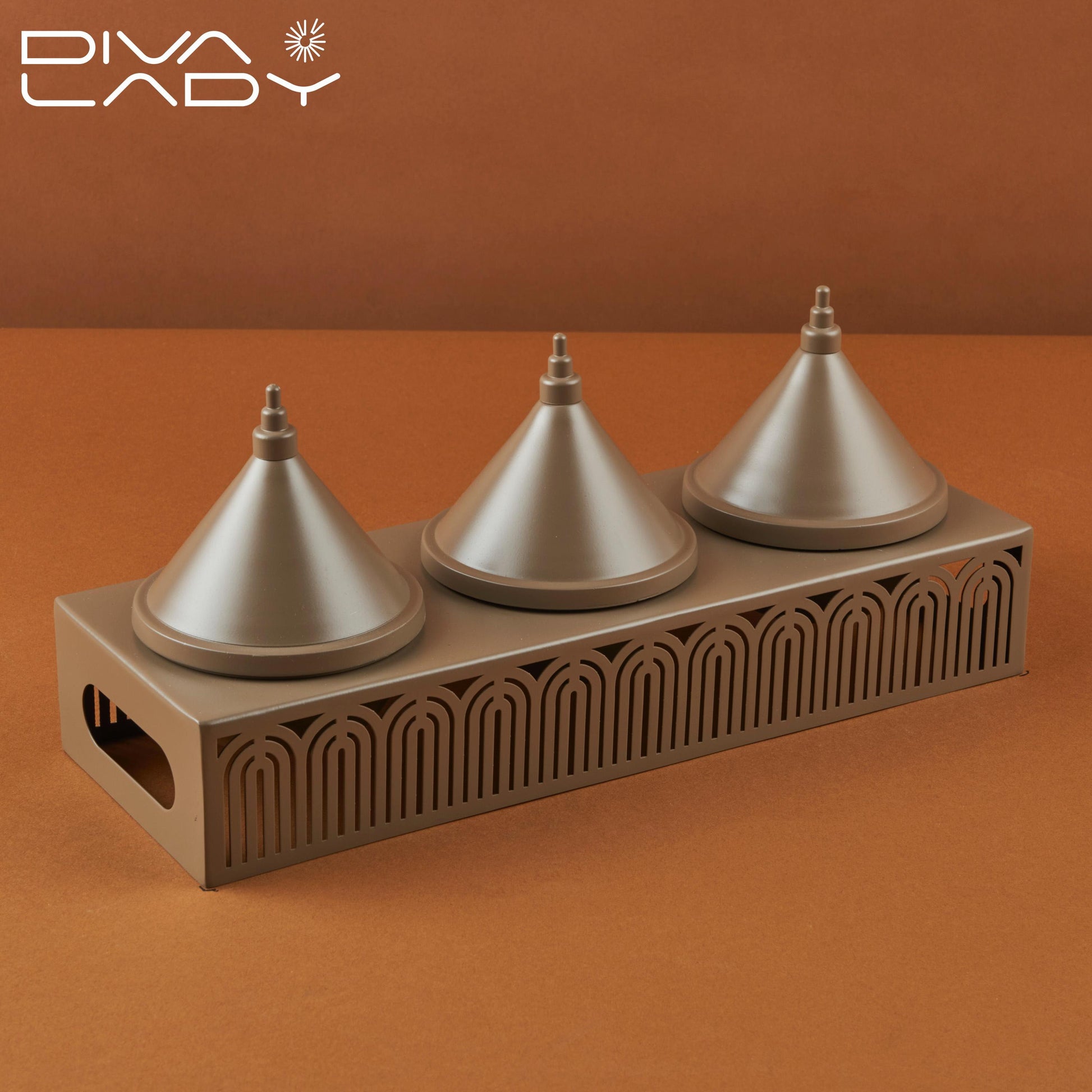 لتصميم أنيق ومزخرف، حيث تحتوي الصينية على ثلاثة أوعية معدنية مخروطية الشكل مزودة بأغطية، وهي مرتبة على قاعدة ذات نقوش جمالية تعكس الطابع التقليدي مع لمسة عصرية. المنتج مناسب لتقديم الضيافة أو تخزين التوابل والمكسرات بشكل منظم وجميل