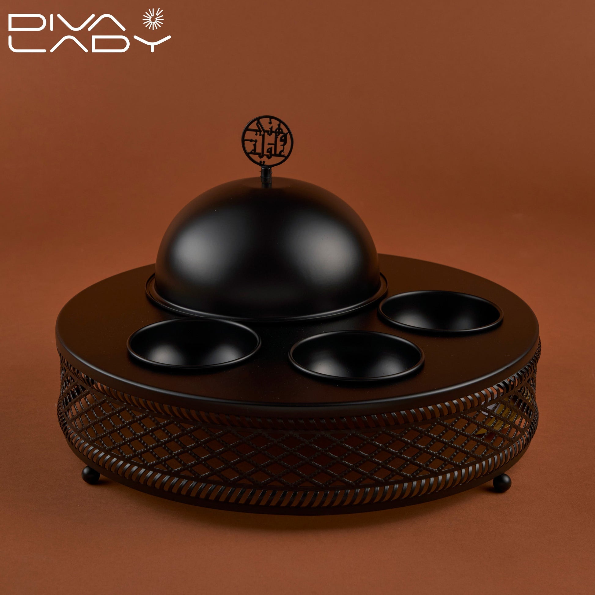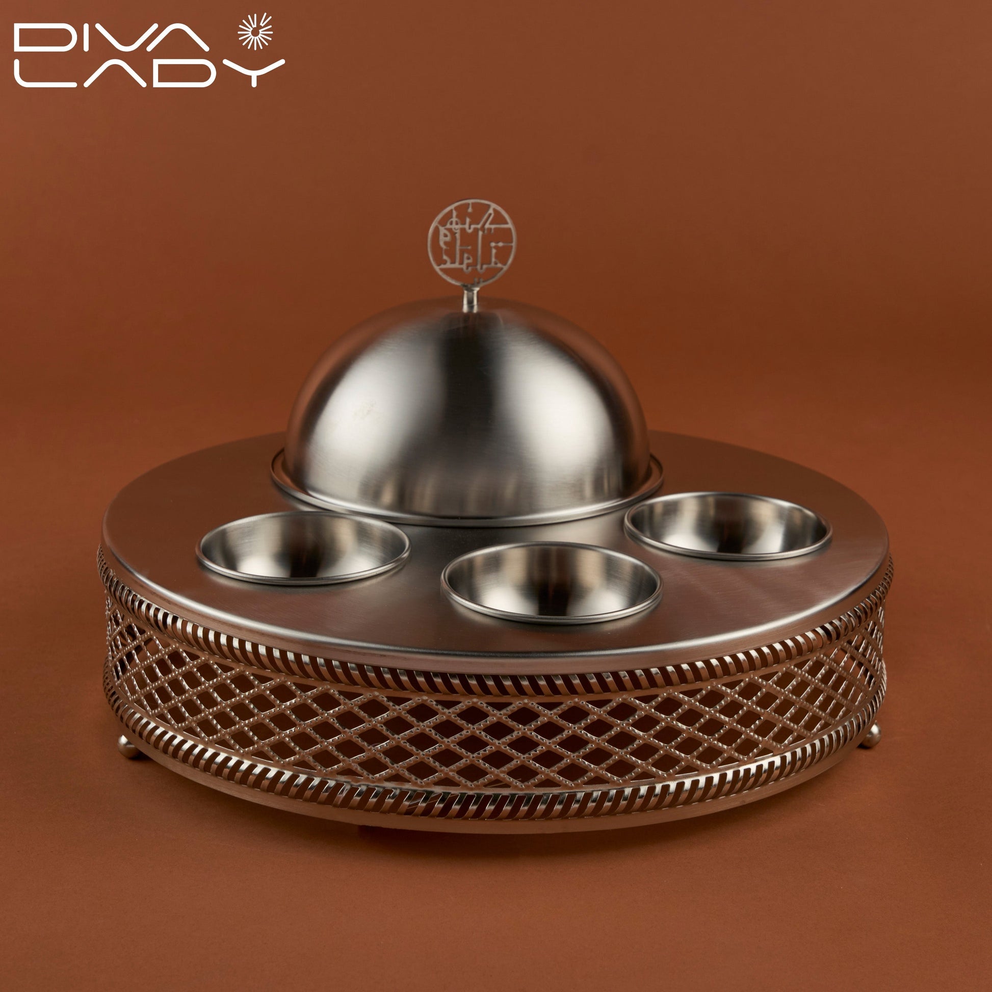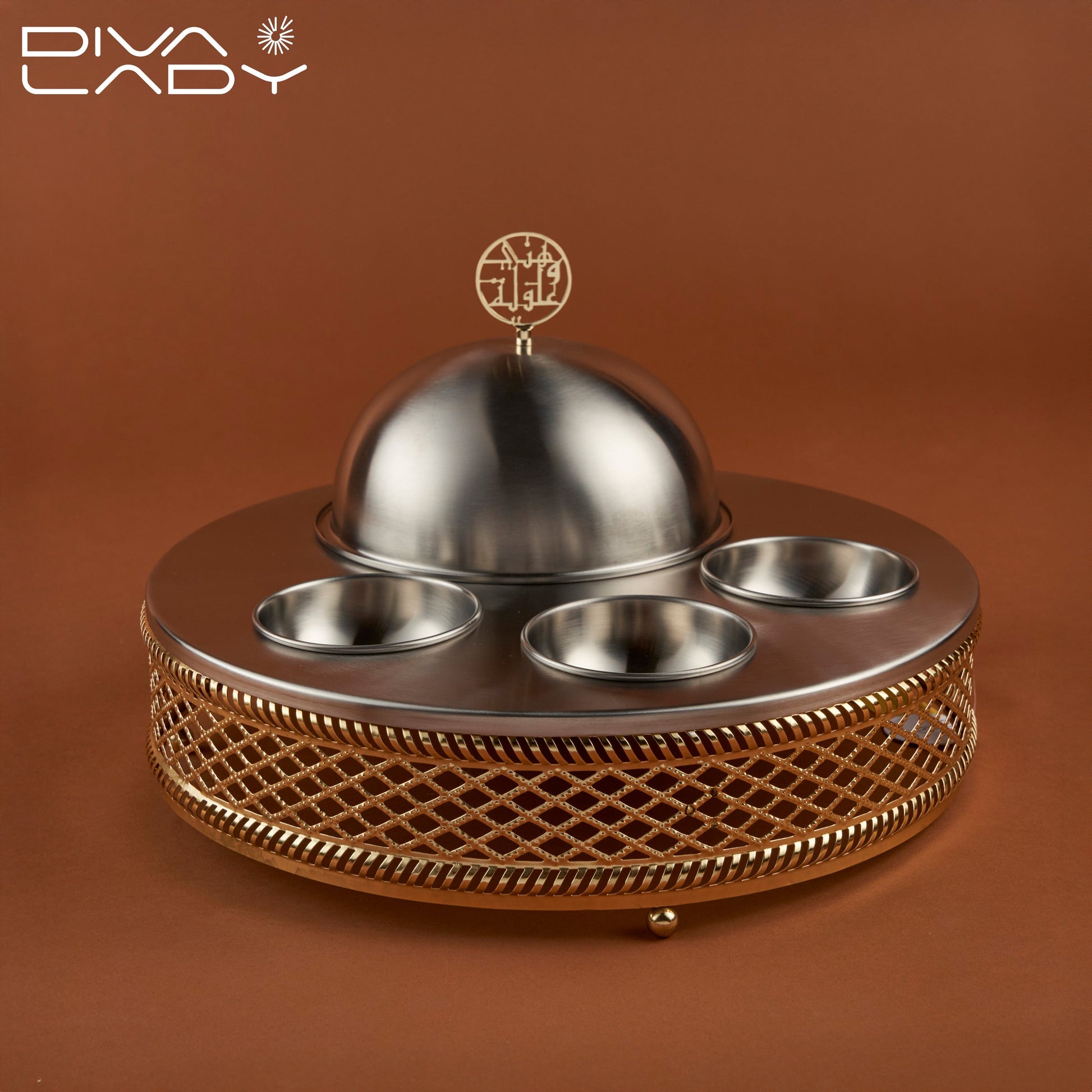 تتميز هذه المجموعة بتصميمها الأنيق والفخم، وهي مثالية لتقديم التمر والحلويات في المناسبات الخاصة. تتكون المجموعة من صينية دائرية مصنوعة من مادة عالية الجودة وتتميز بتصميمها المنقوش الذي يعطيها لمسة من الفخامة