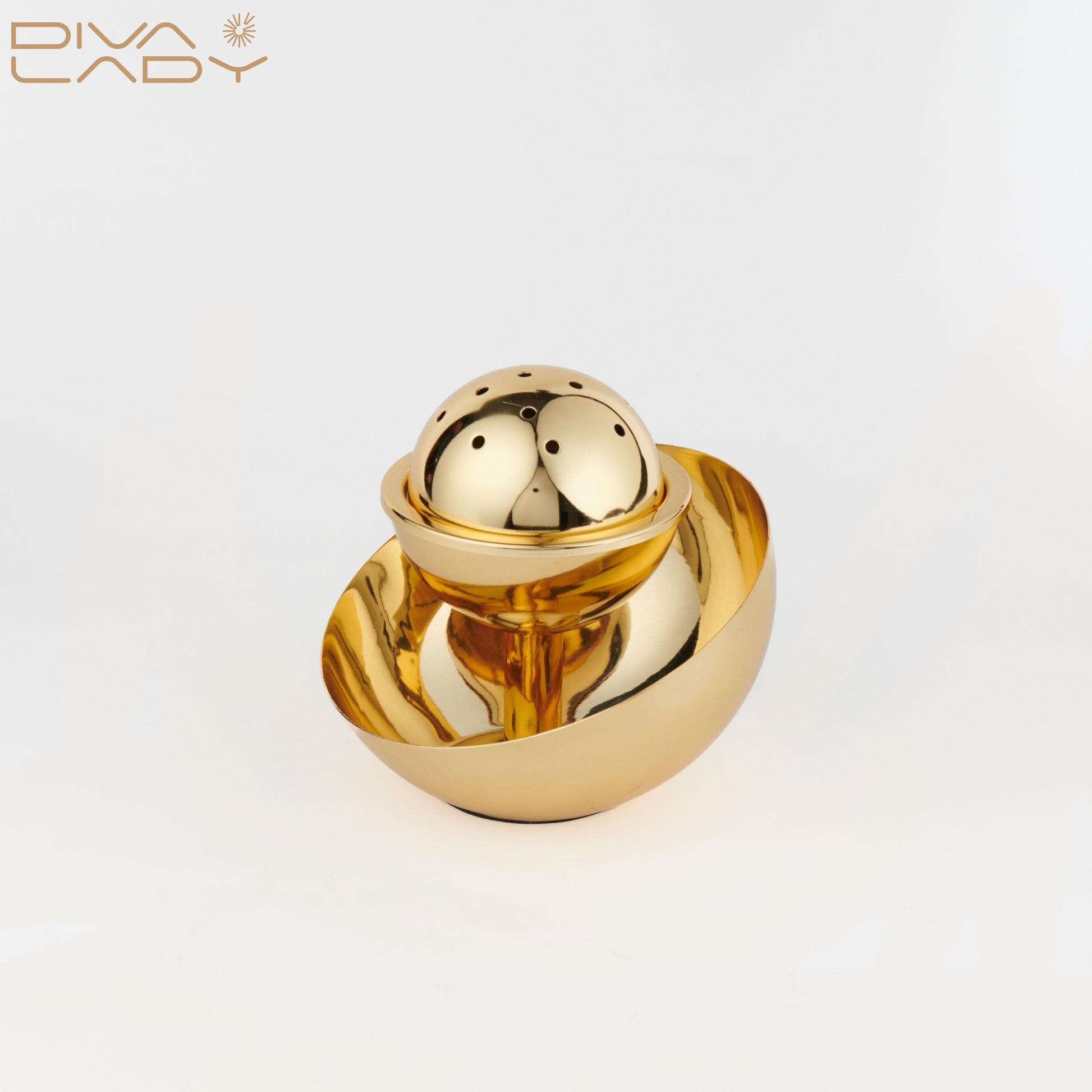 ارتقِ بأجواء منزلك مع هذه المبخرة الاستثنائية المصنوعة من المعدن المطلي بالذهب. تأتي بتصميم كروي أنيق موضوع داخل وعاء مائل يُضفي طابعًا فنّيًا عصريًا، ما يجعلها قطعة ديكور مبهرة بجانب وظيفتها العملية.