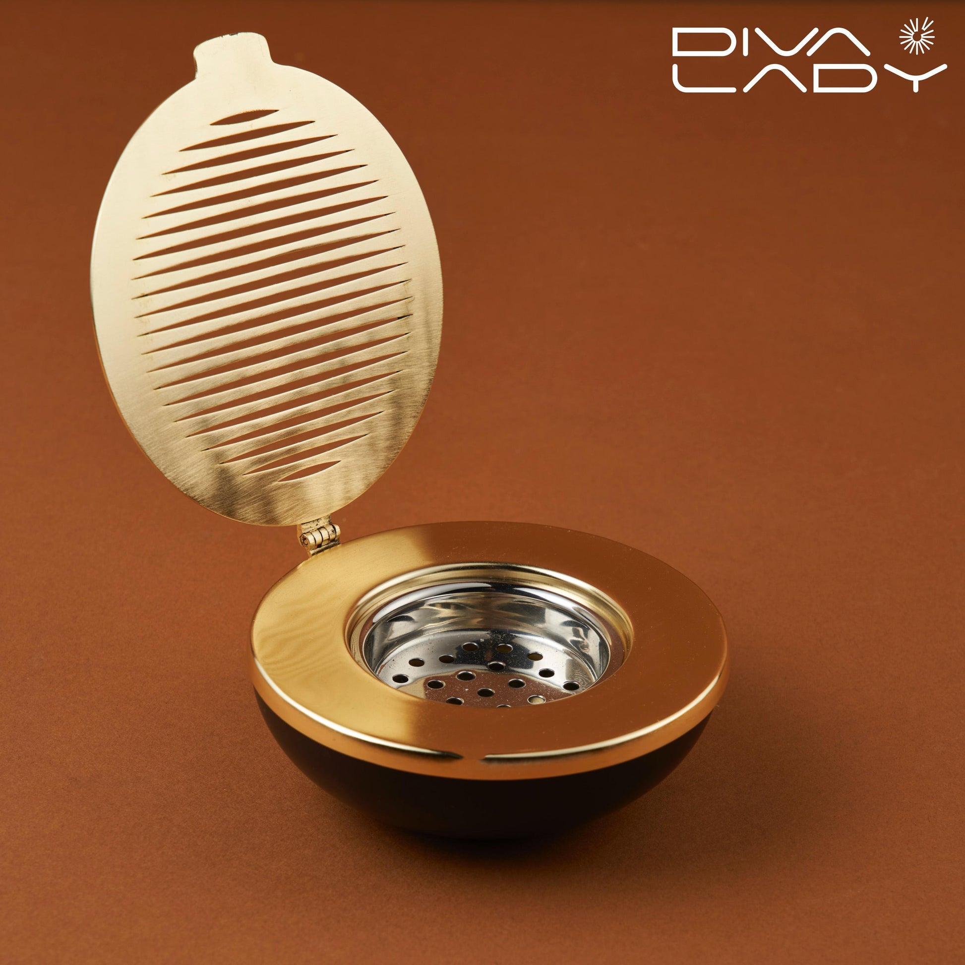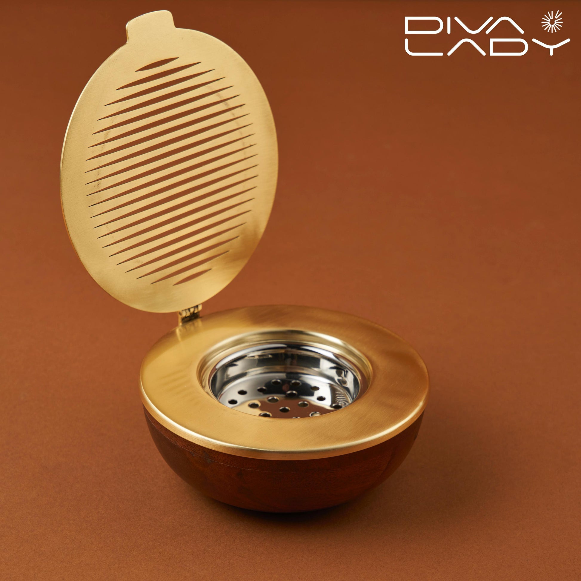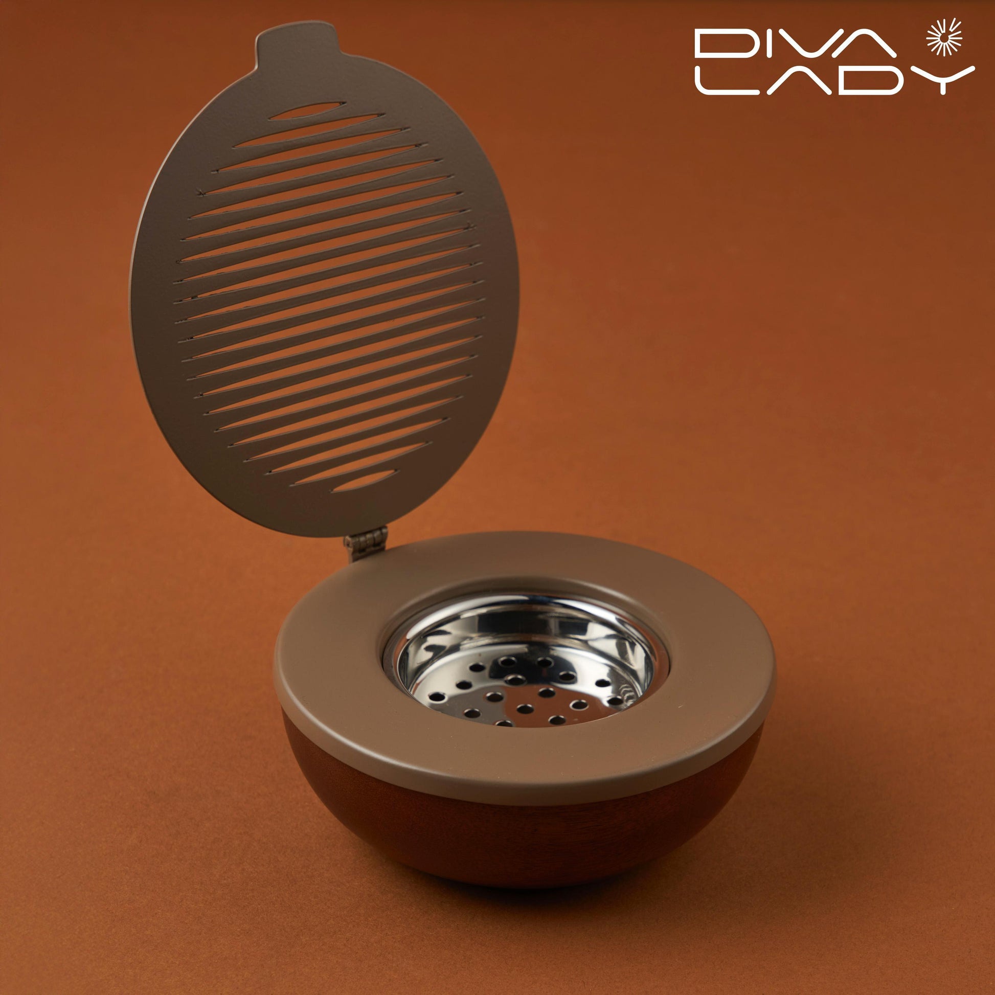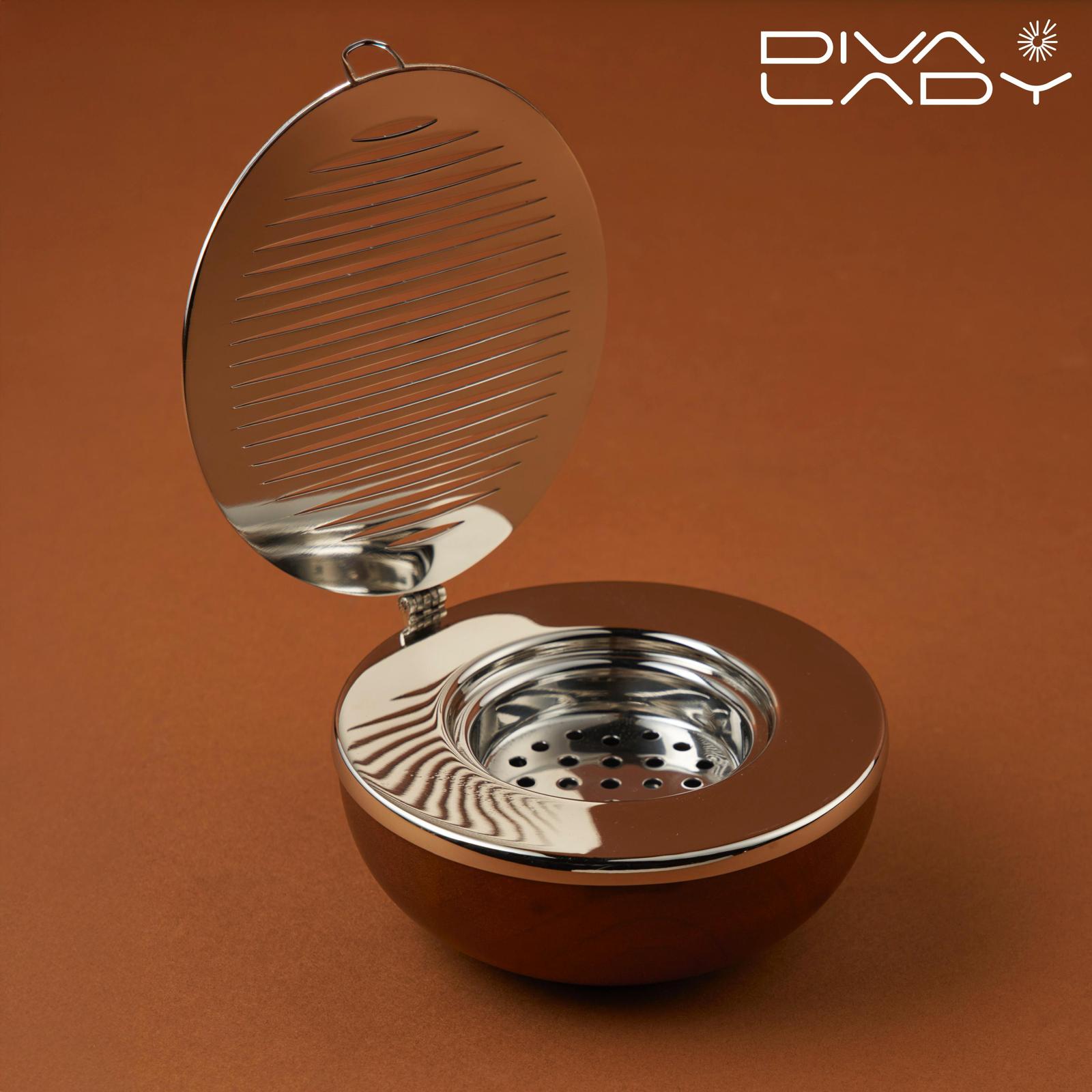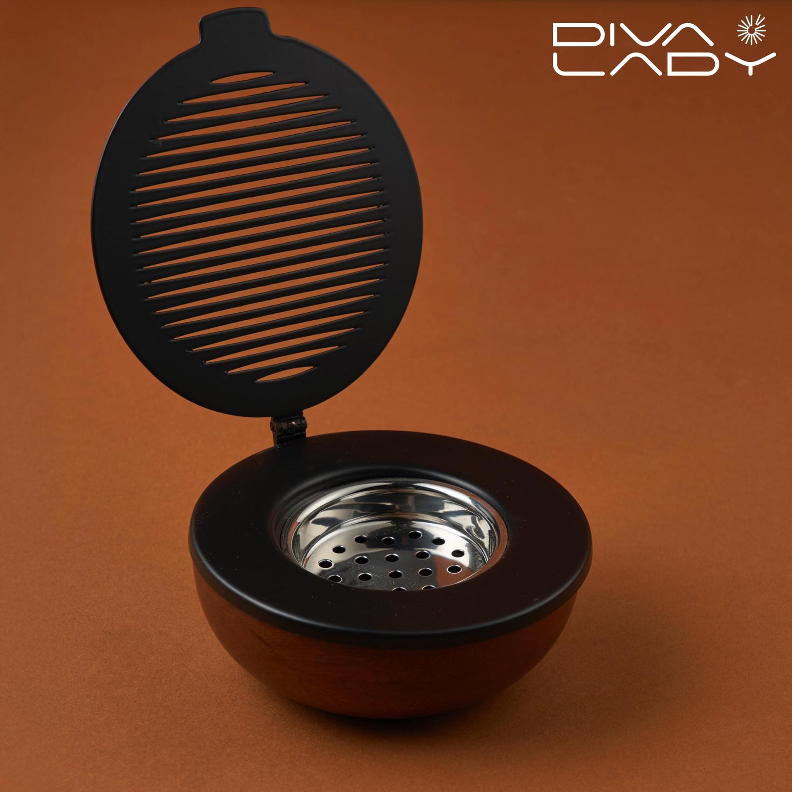 مبخرة للعود، وتتميز بتصميم أنيق يحتوي على غطاء معدني محزز ودائرة خارجية خشبية