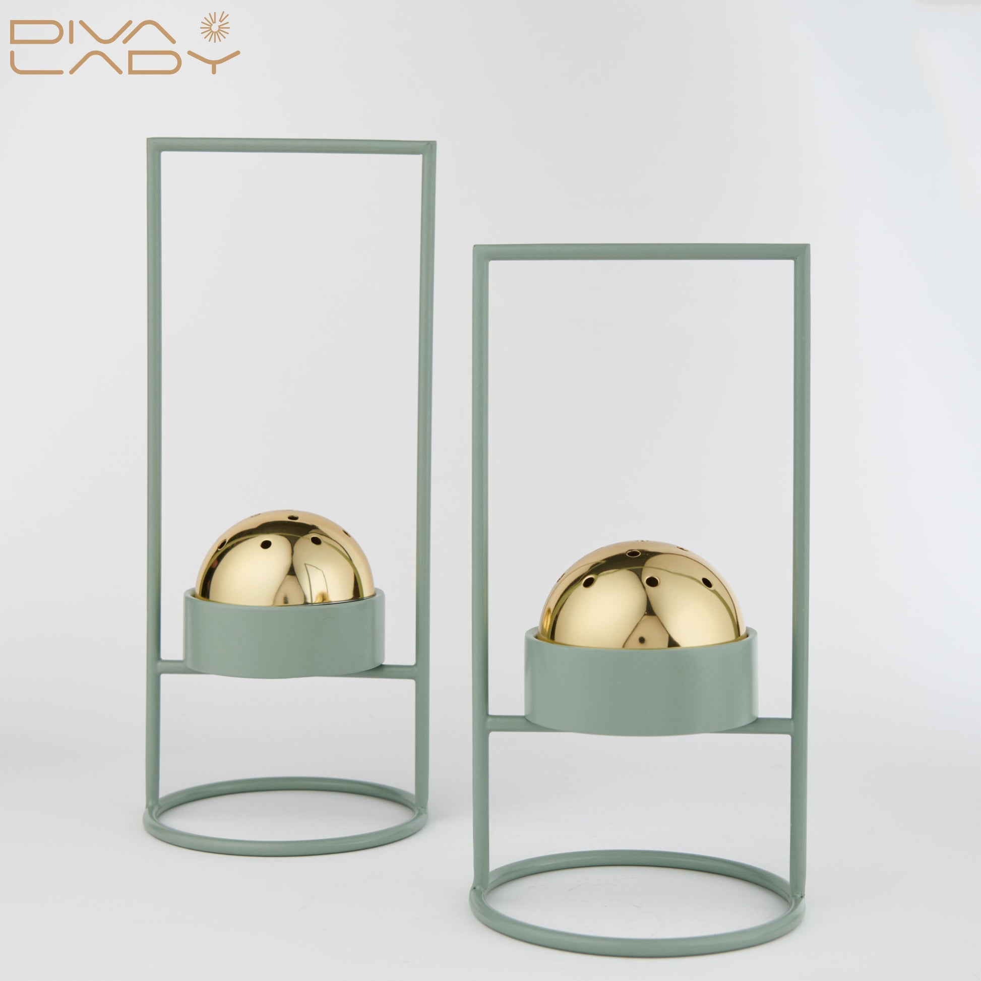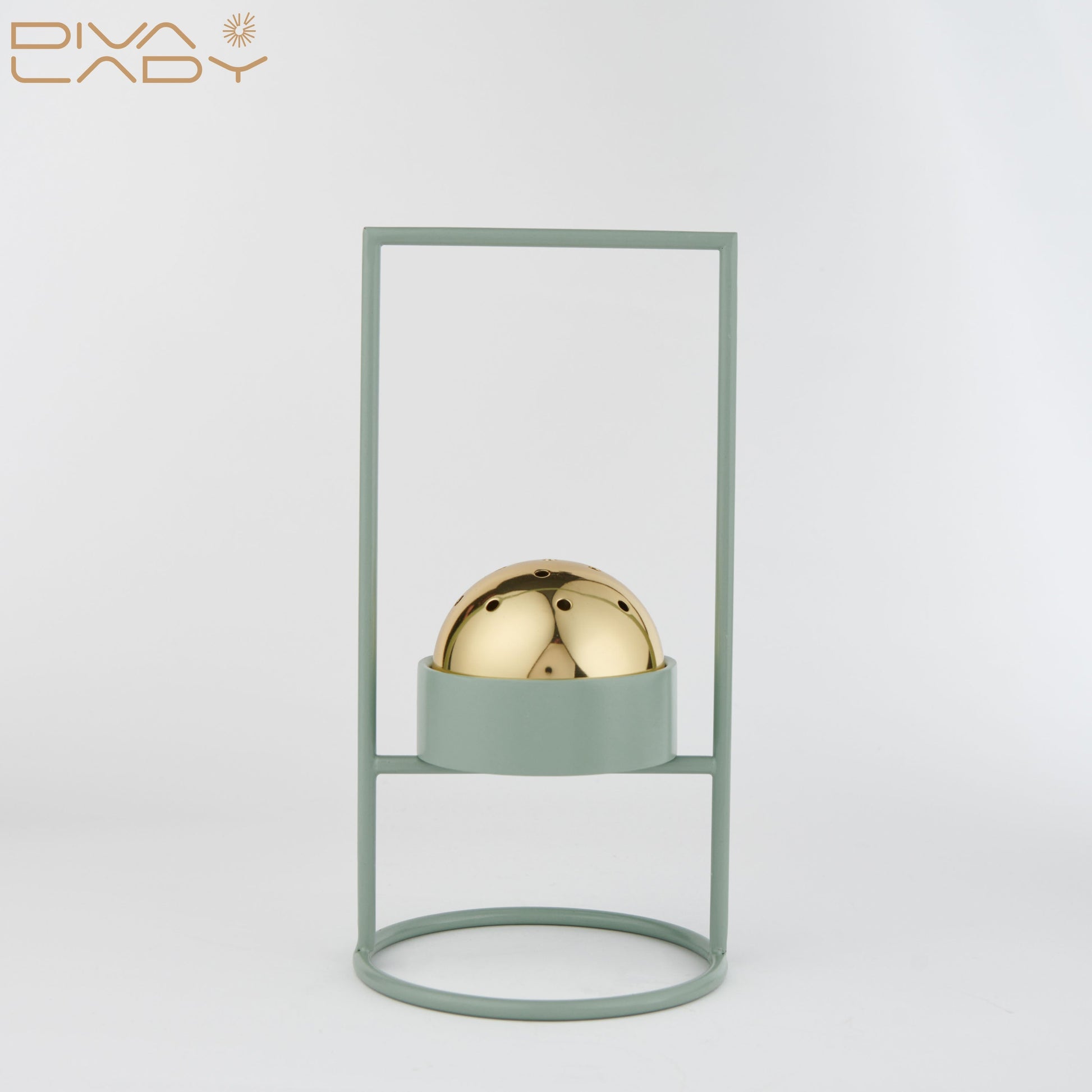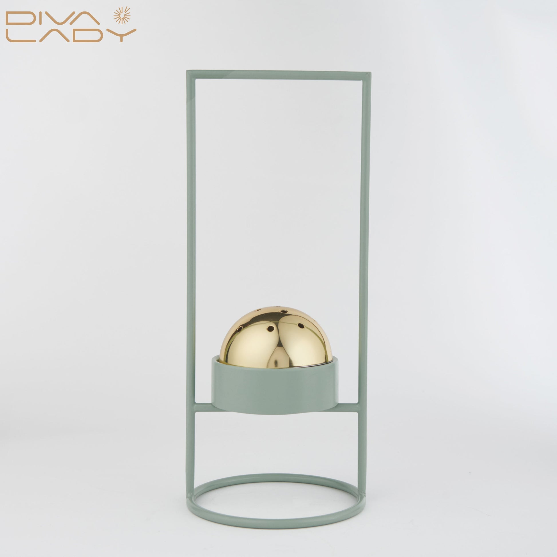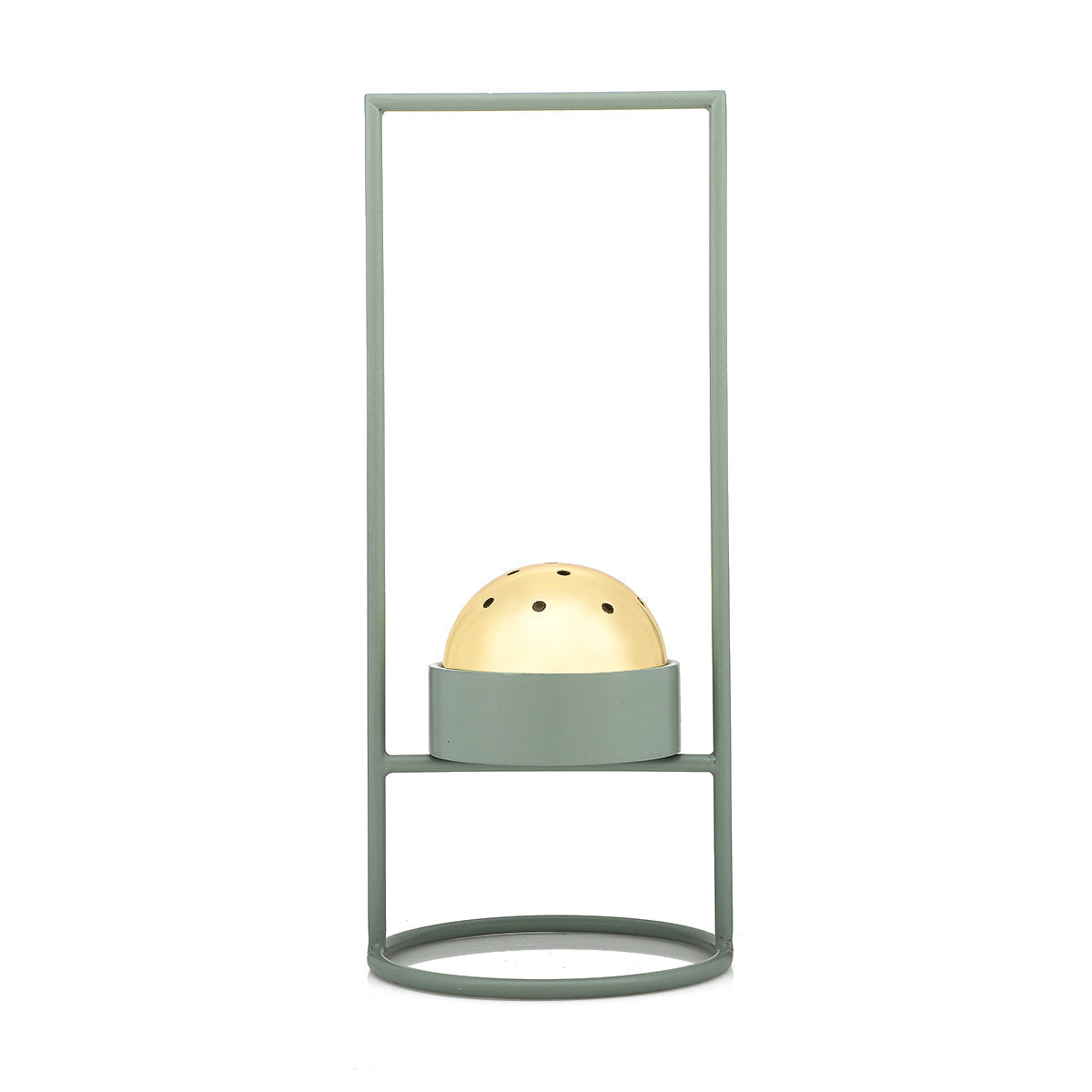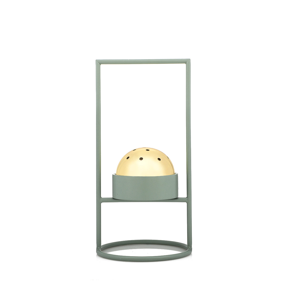 مبخرة فريدة من نوعها بتصميم هندسي أنيق، تجمع بين قاعدة معدنية بلون أخضر باستيلي هادئ وكُرة علوية ذهبية لامعة تحتوي على فتحات لنشر البخور بطريقة متجانسة. التصميم المبتكر يجعلها قطعة فنية تلفت الأنظار وتضيف لمسة راقية إلى ديكور منزلك أو مكتبك.