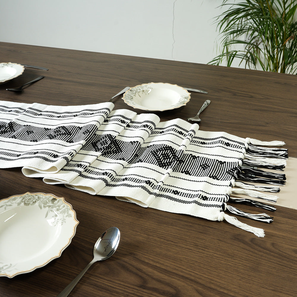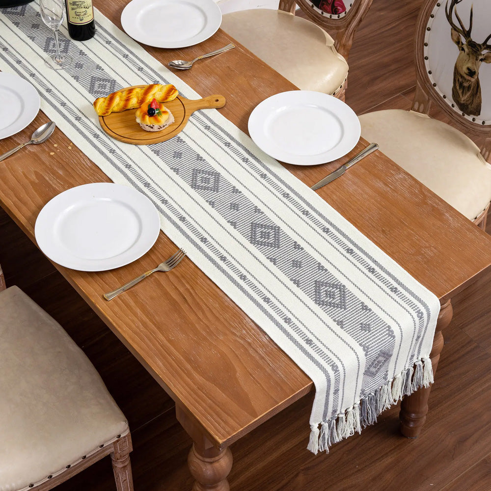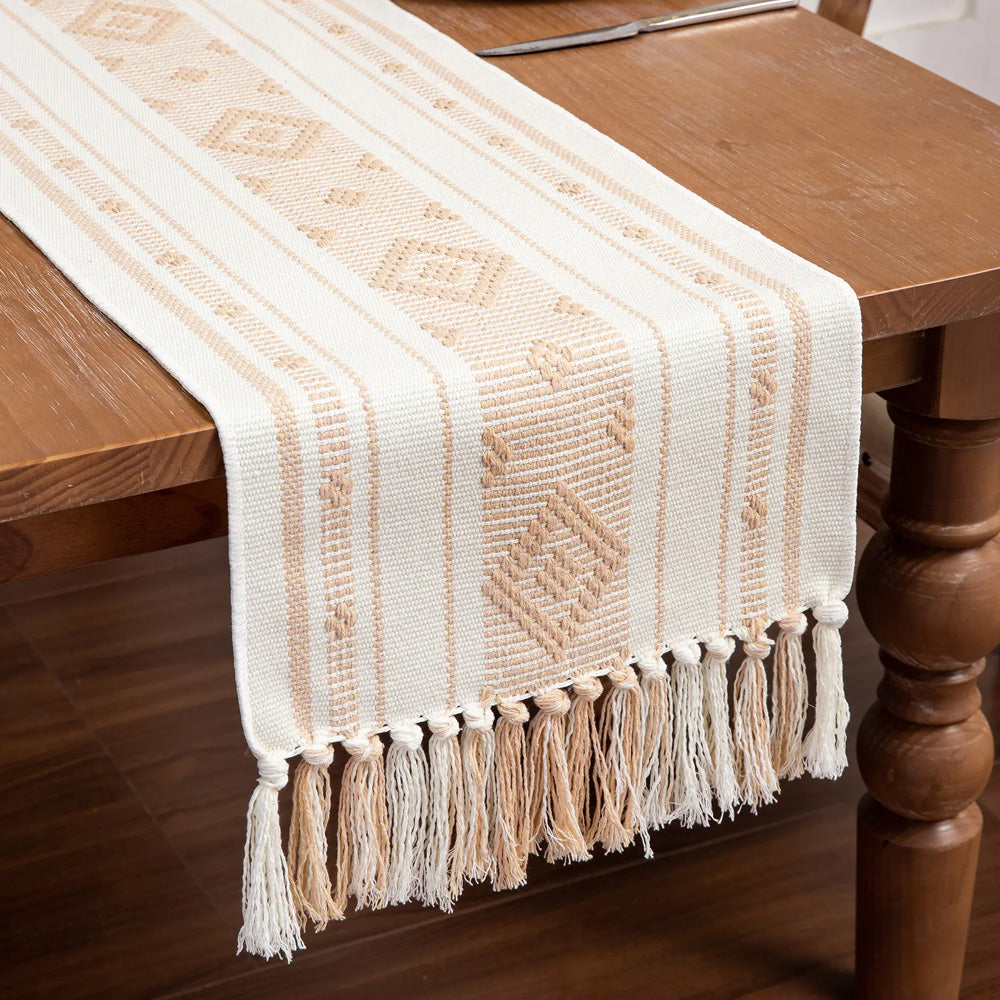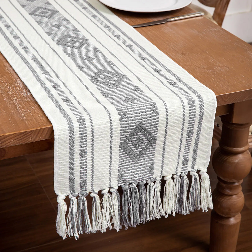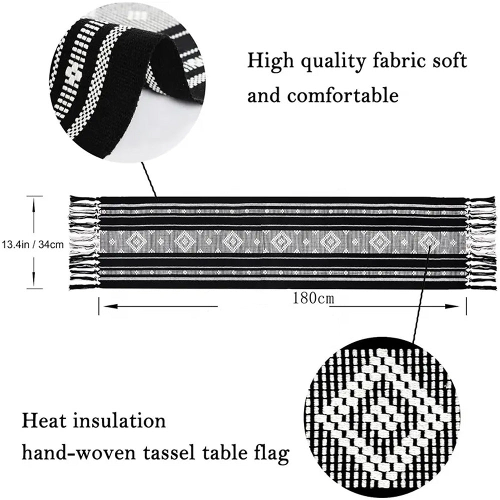 مفرش طاولة قطني بتصميم ريفي حديث مع شرابات، مقاس: 180*35 سم