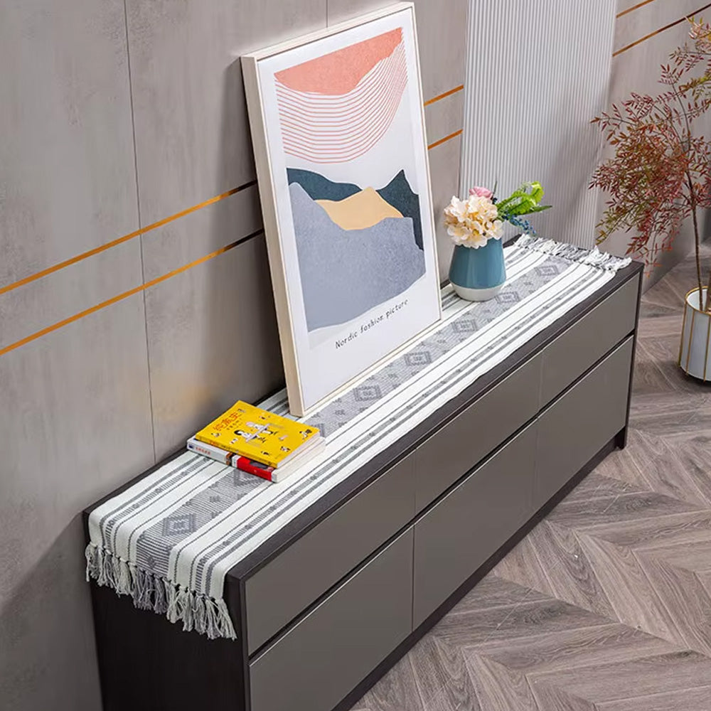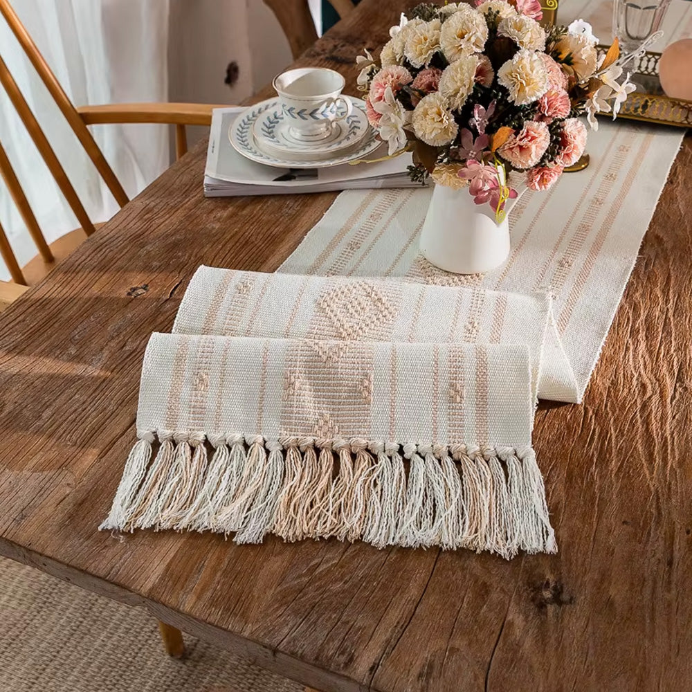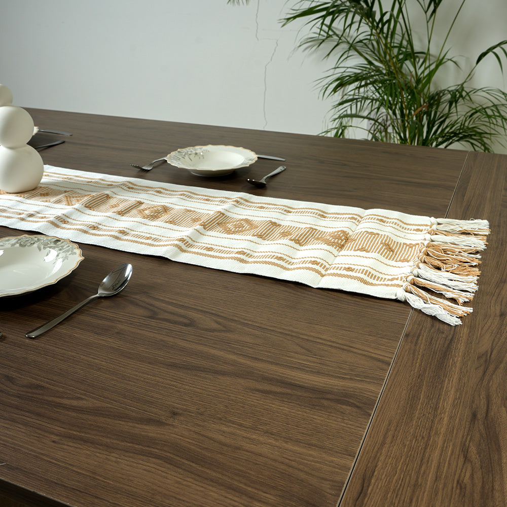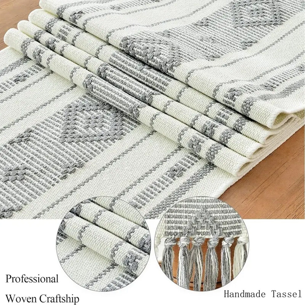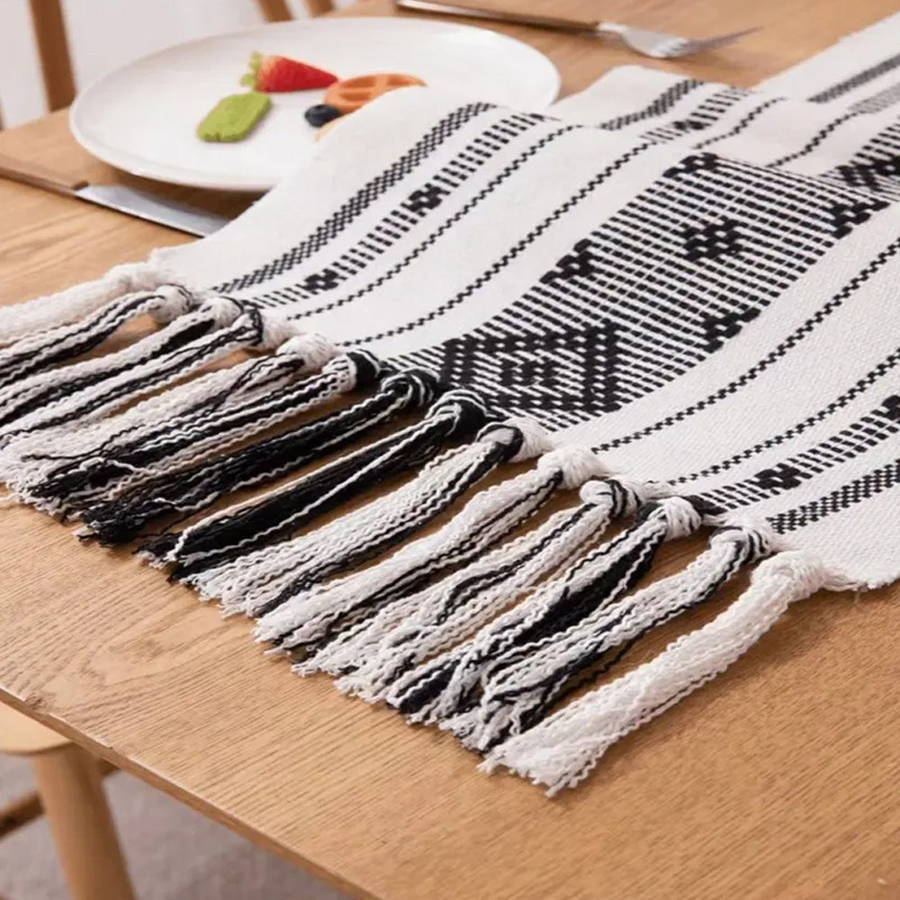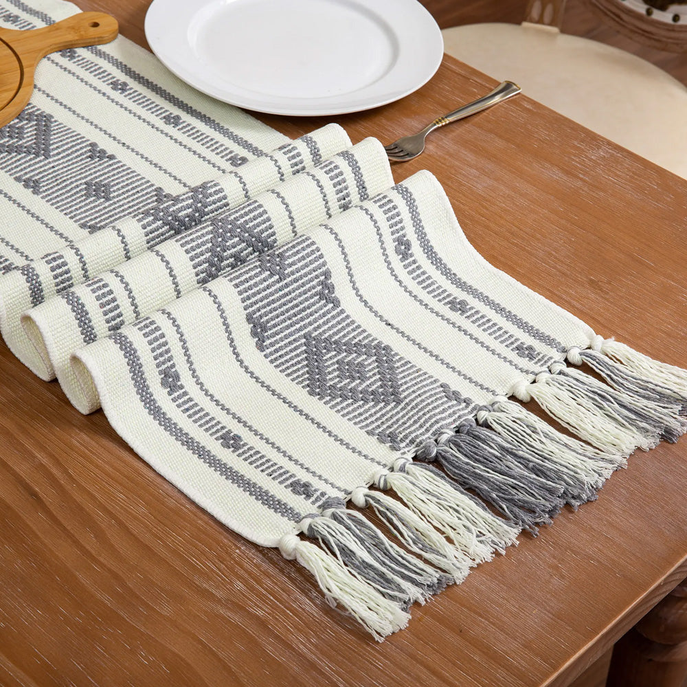 مفرش طاولة قطني بتصميم ريفي حديث مع شرابات، مقاس: 180*35 سم