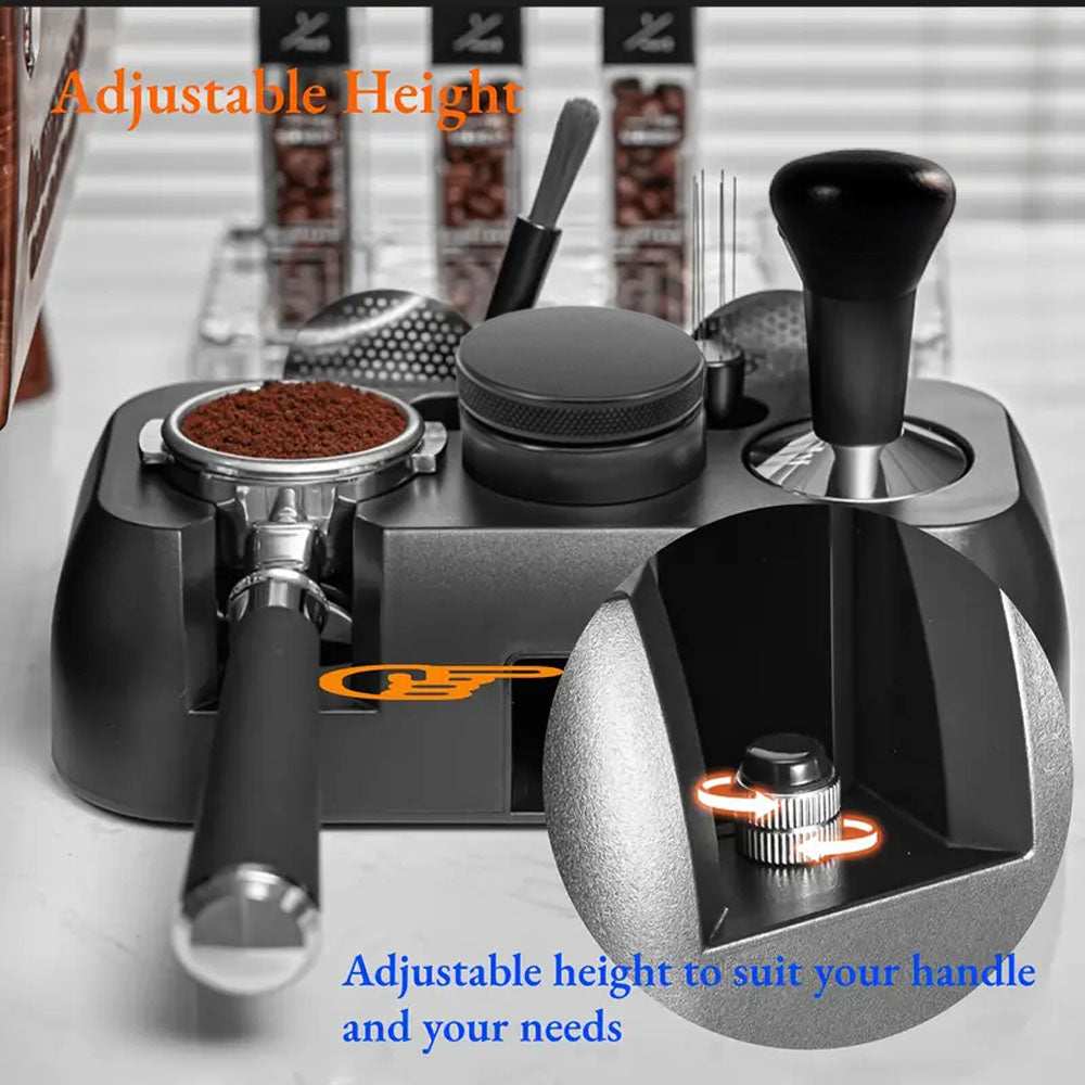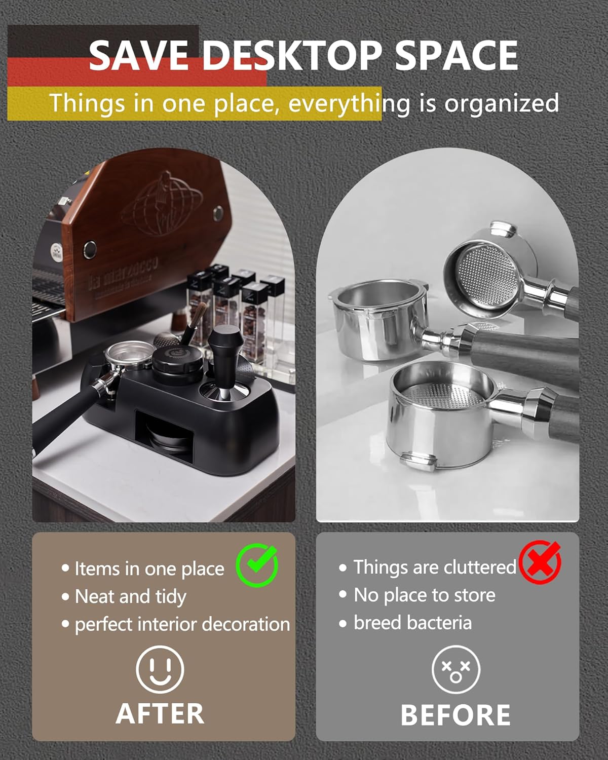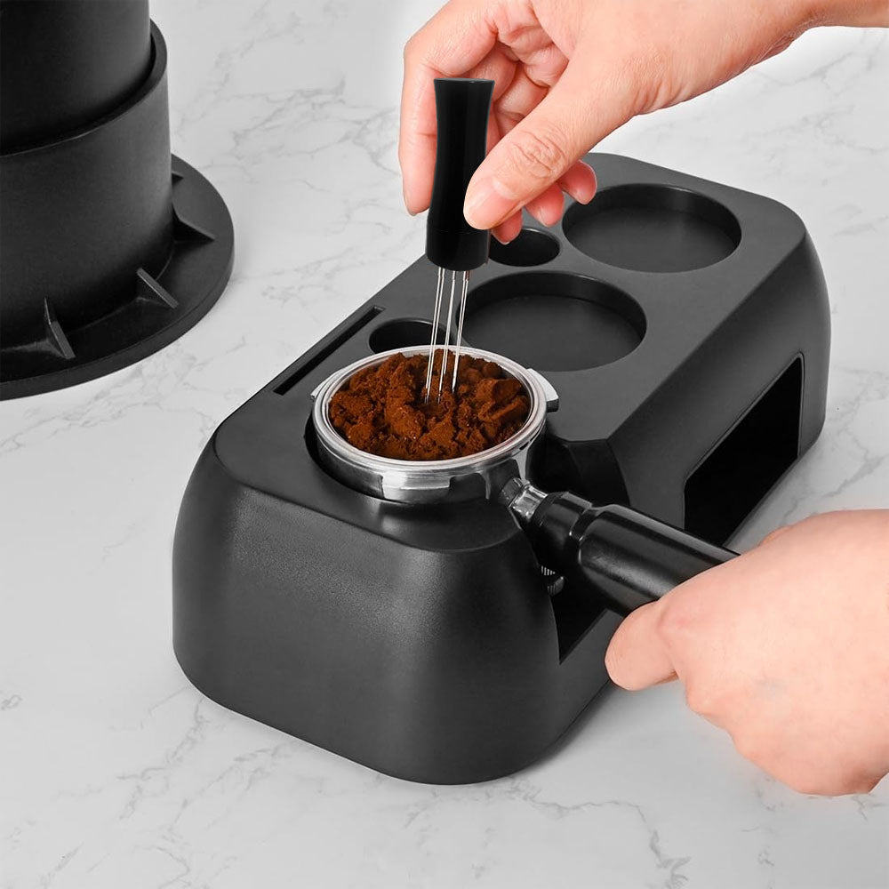 مادة منظم محطة الإسبريسو - مصنوع جيدًا من مادة أكريلونتريل بوتادين ستايرين، ومستقر ومتين. مع 4 أقدام مطاطية غير قابلة للانزلاق لضمان الثبات عند التشغيل. مواضع حامل المكبس/الموزع مع حصيرة سيليكون لحماية سطح أدوات القهوة الخاصة بك وتسهيل التنظيف.