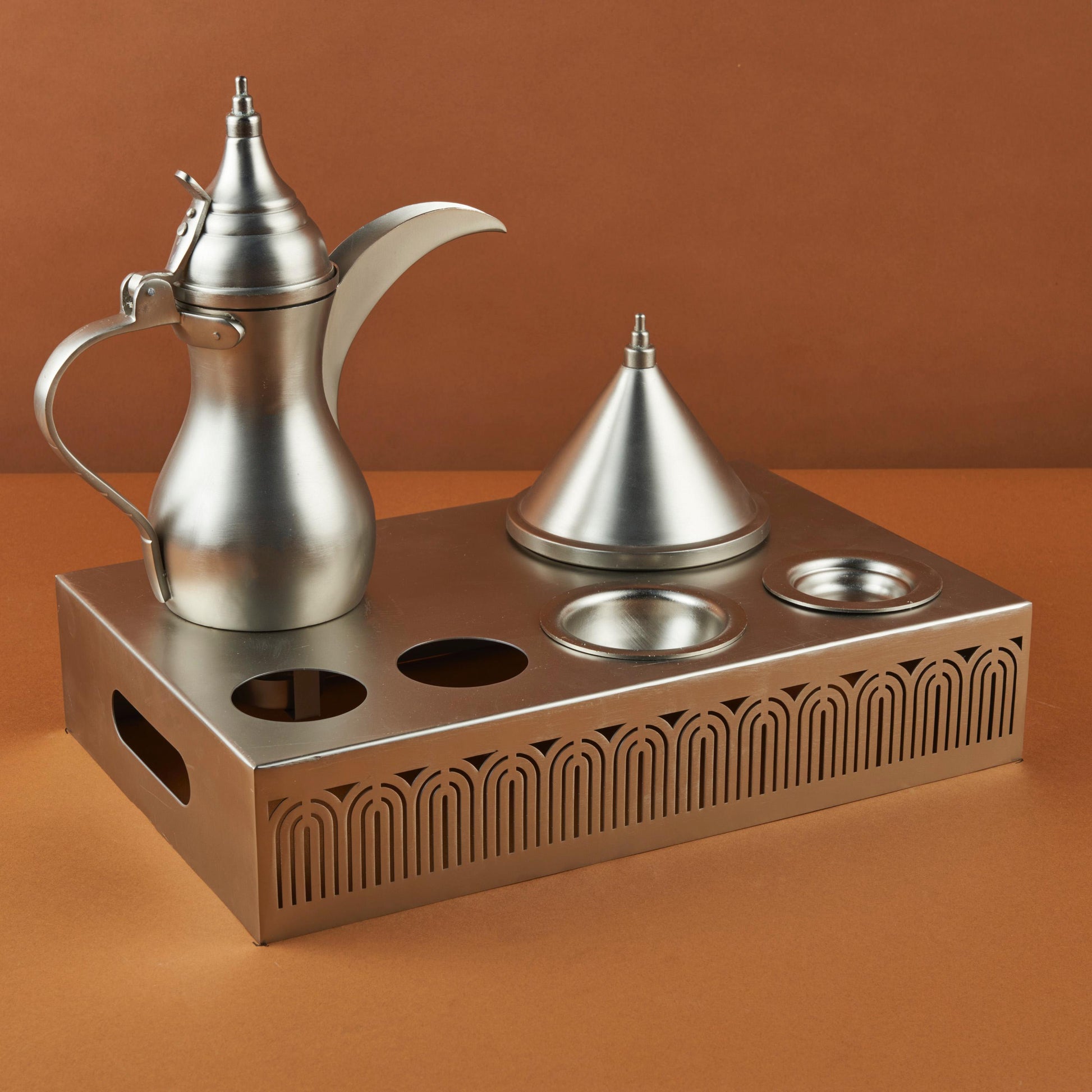تميّز في ضيافتك مع طقم تقديم القهوة العربية من، المصنوع من المعدن الفاخر والمصمم بأسلوب يجمع بين الحداثة والأصالة. يأتي الطقم مع دلة أنيقة، غطاء مخروطي، وحامل معدني مزخرف بدقة عالية، يتضمن فتحات مخصصة للفناجين وأماكن مخصصة لتثبيت الأدوات. مثالي لتقديم القهوة في المناسبات الخاصة، العزائم، أو كقطعة ديكور فاخرة في المجالس.