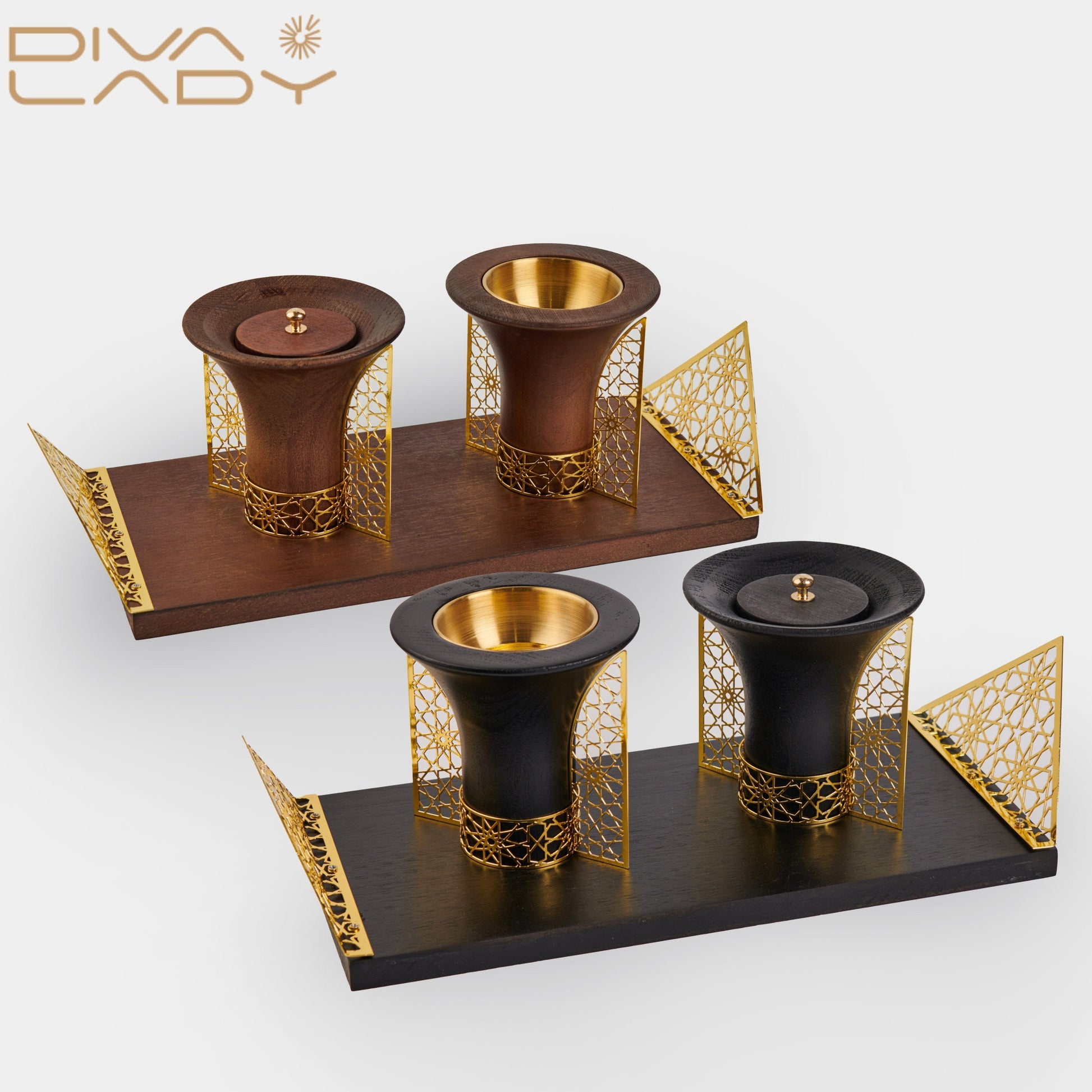 تحتوي على مبخرتين أنيقتين بغطاء ذهبي داخلي وقاعدة خشبية