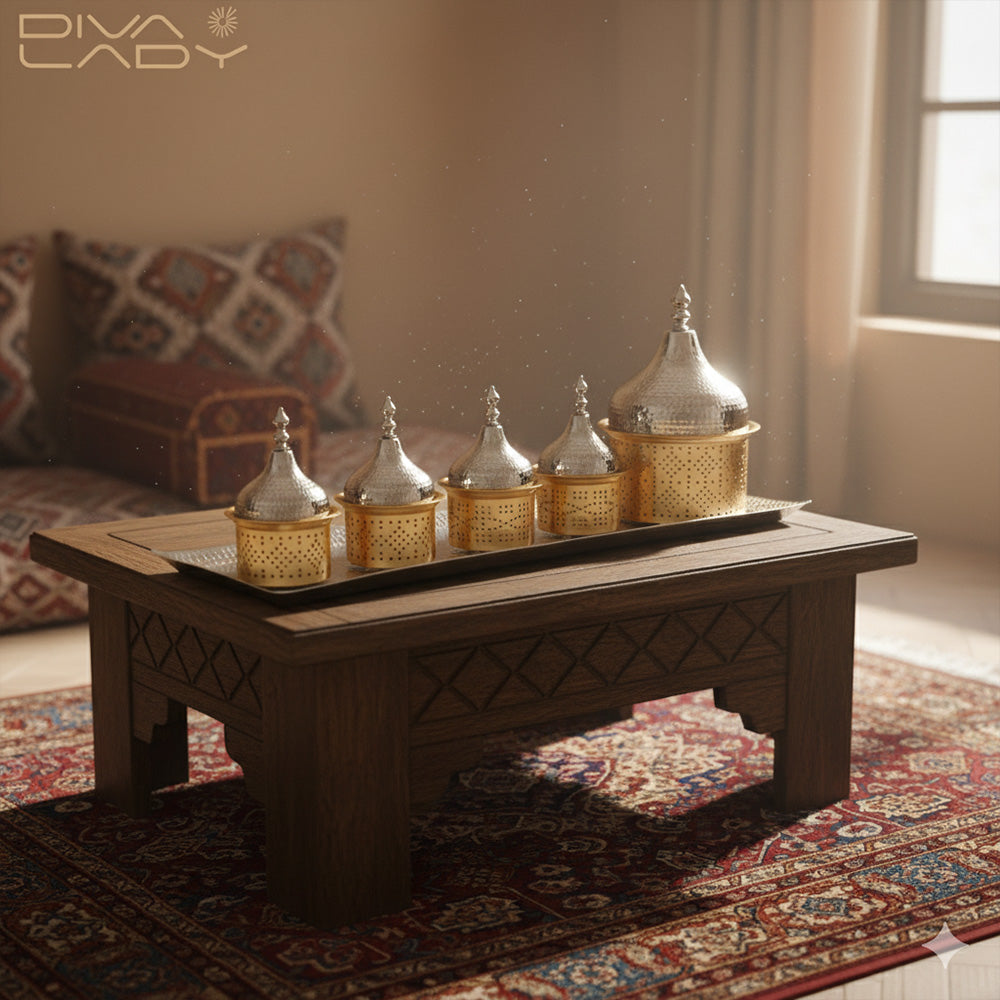 يتكون من 5 اطباق ذهبية بغطاء فضى و صينية باللون الفضى