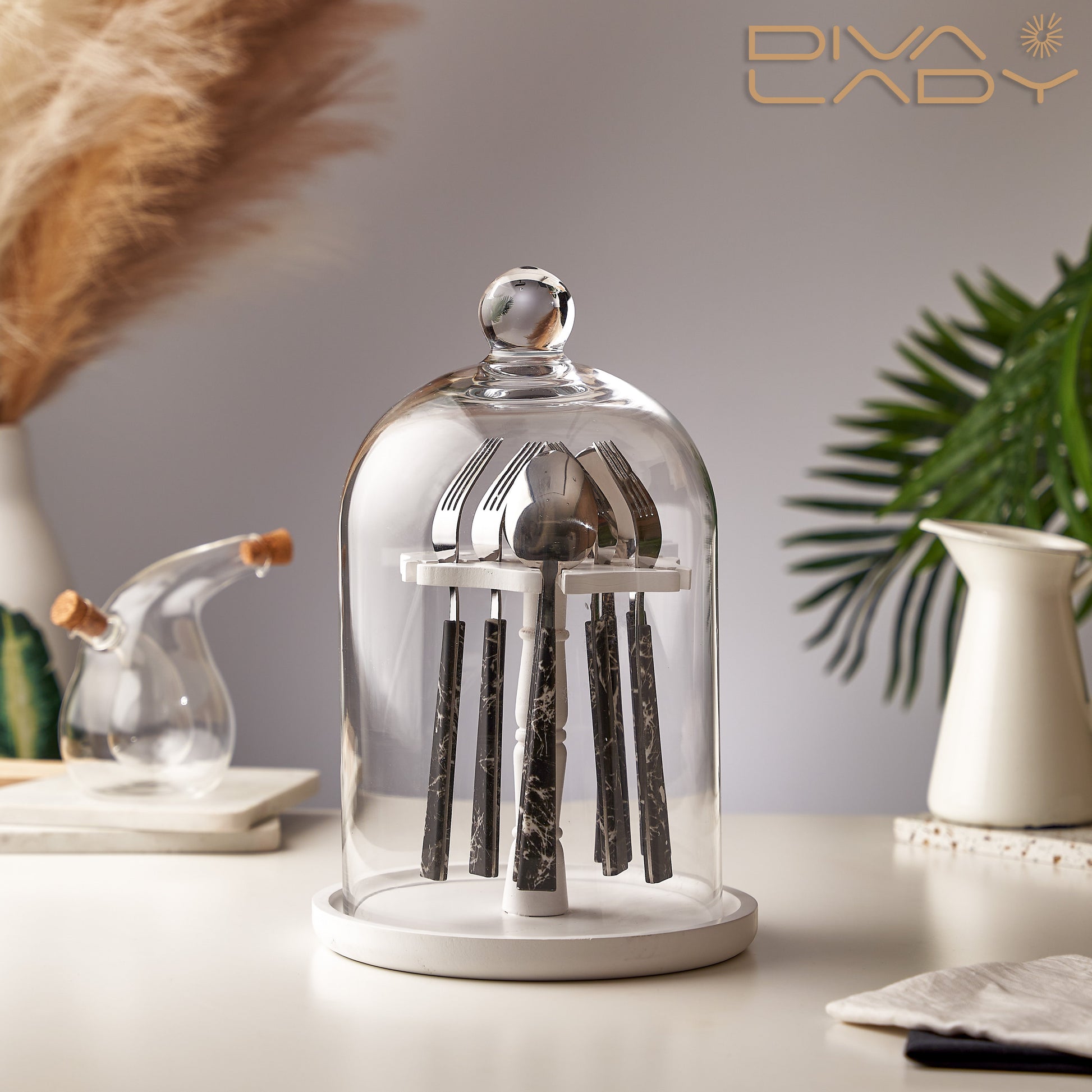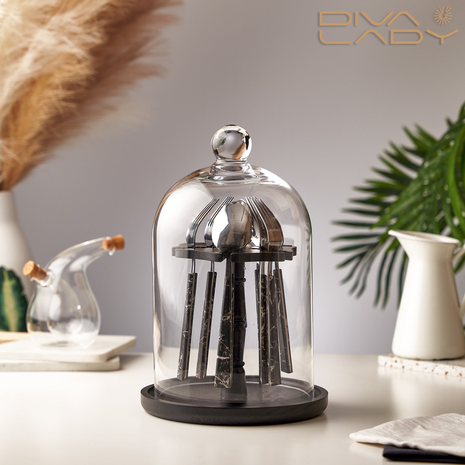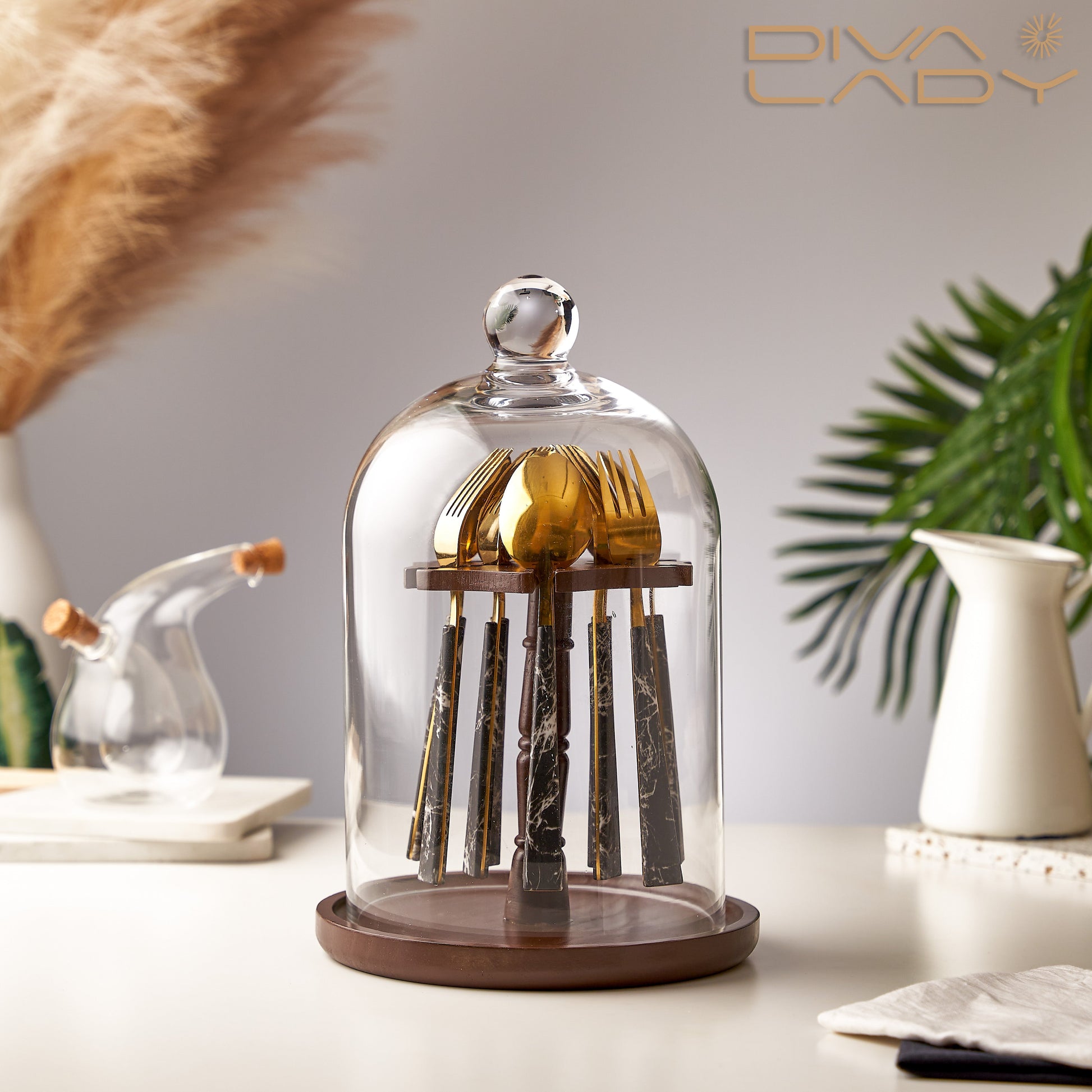 أضيفي لمسة من الرقي إلى طاولتك مع منظم أدوات المائدة الفاخر، المصنوع من قاعدة خشبية مرتفعة وغطاء زجاجي شفاف يحافظ على نظافة الأدوات وأناقتها. مثالي لتقديم أدوات المائدة أو الملاعق والشوك والسكاكين في المناسبات أو الاستخدام اليومي.