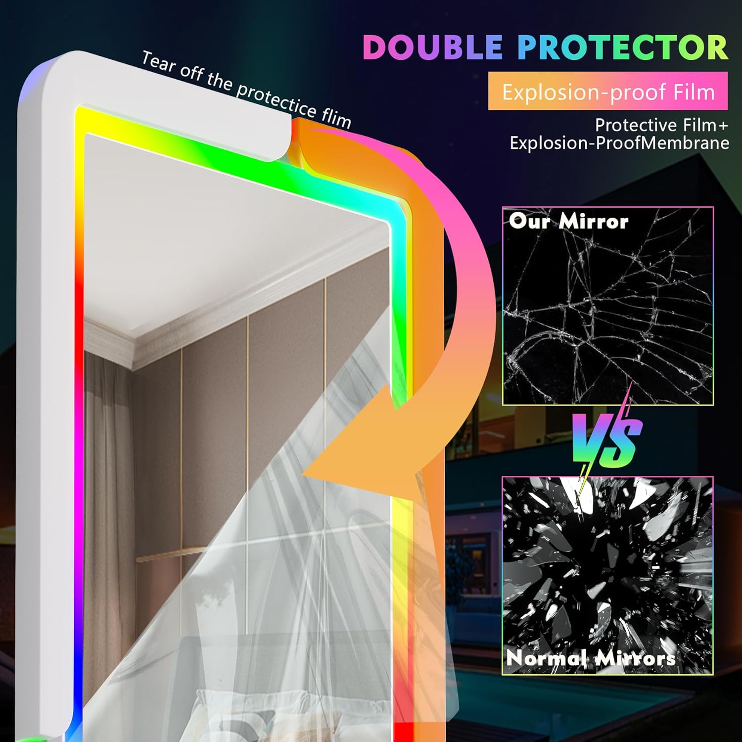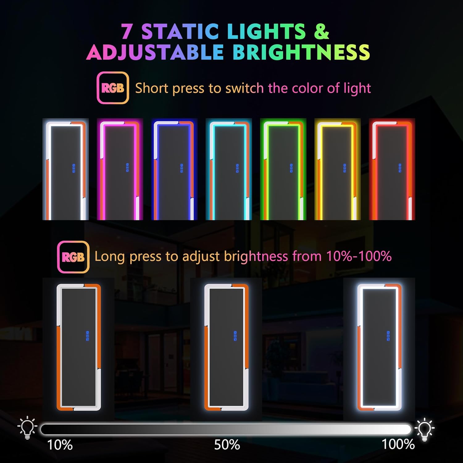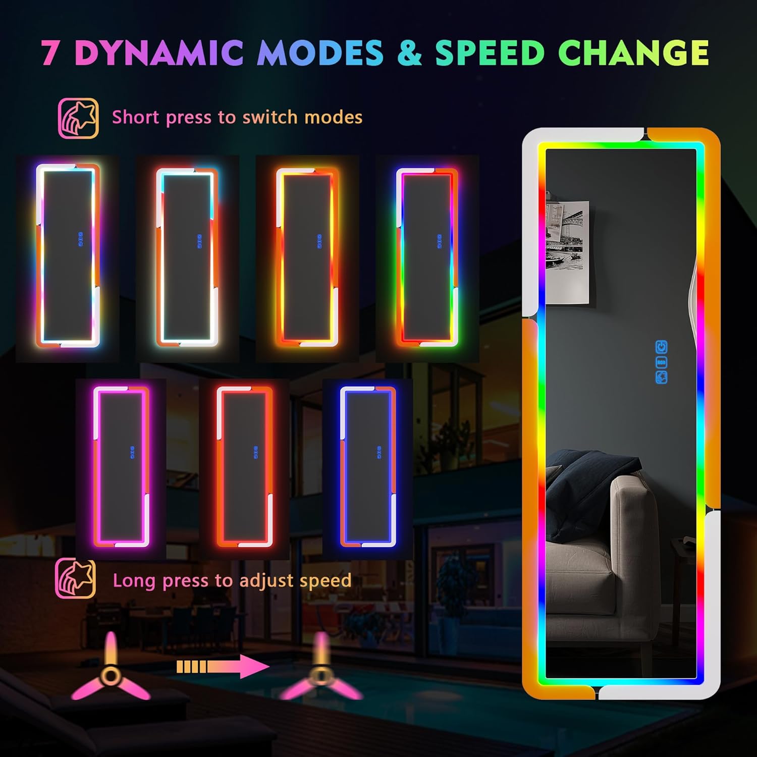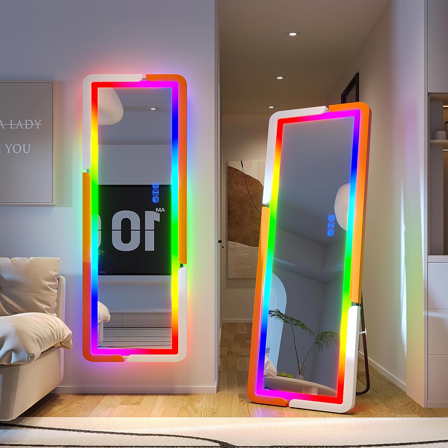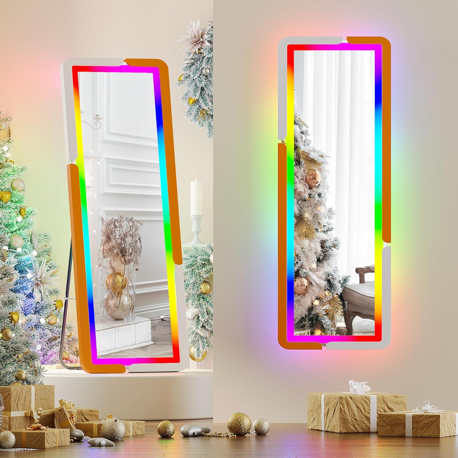 مرآة كاملة بإضاءة RGB متعددة الاستخدامات – تعليق حائطي وحامل أرضي بإضاءة برتقالية وبيضاء