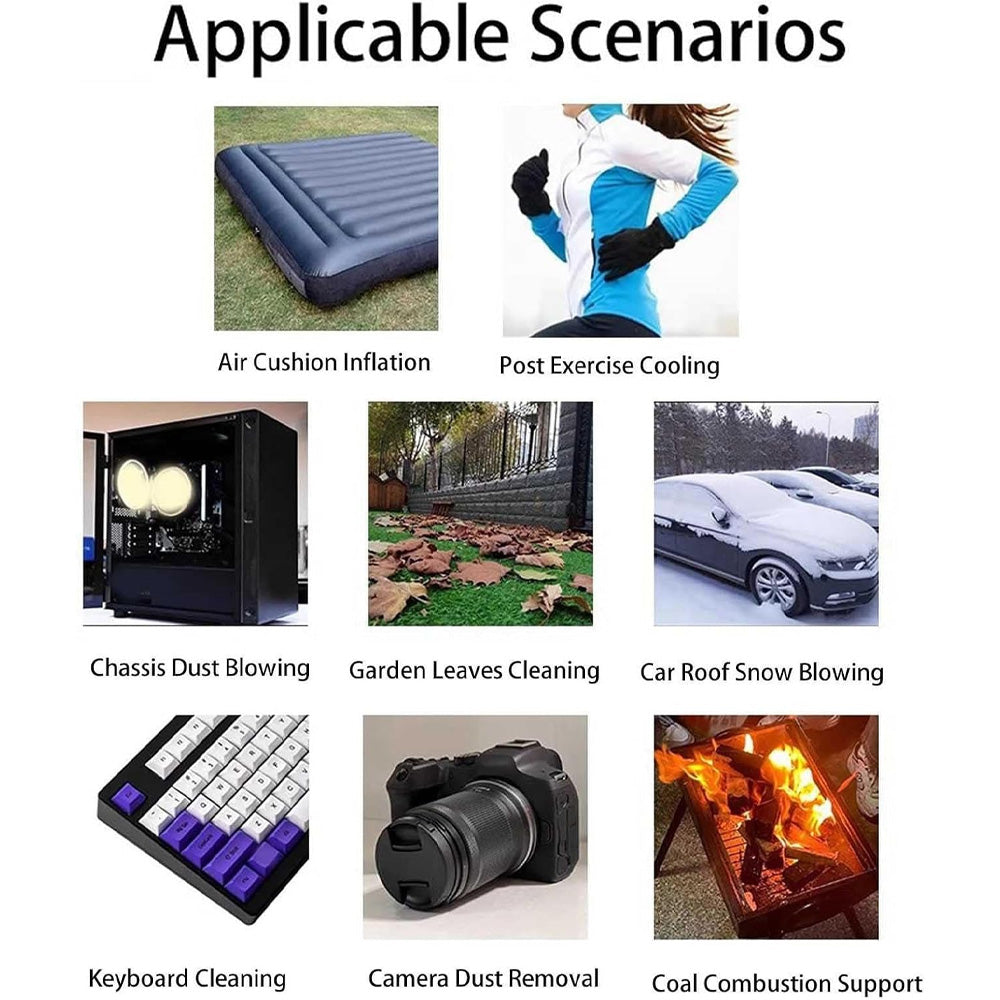 3. تطبيقات متعددة: سواء كان الأمر يتعلق بنفخ الهواء المخفف، أو تنظيف الكمبيوتر، أو إزالة الغبار الصناعي، أو إضاءة الفحم، أو تنظيف السيارة، أو التصوير الفوتوغرافي في الاستوديو، أو تجفيف الحيوانات الأليفة، فإن مروحة نفخ الهواء هذه مصممة للتعامل مع مجموعة متنوعة من المهام.