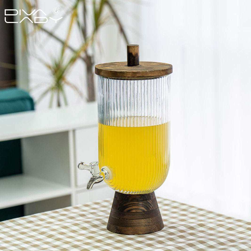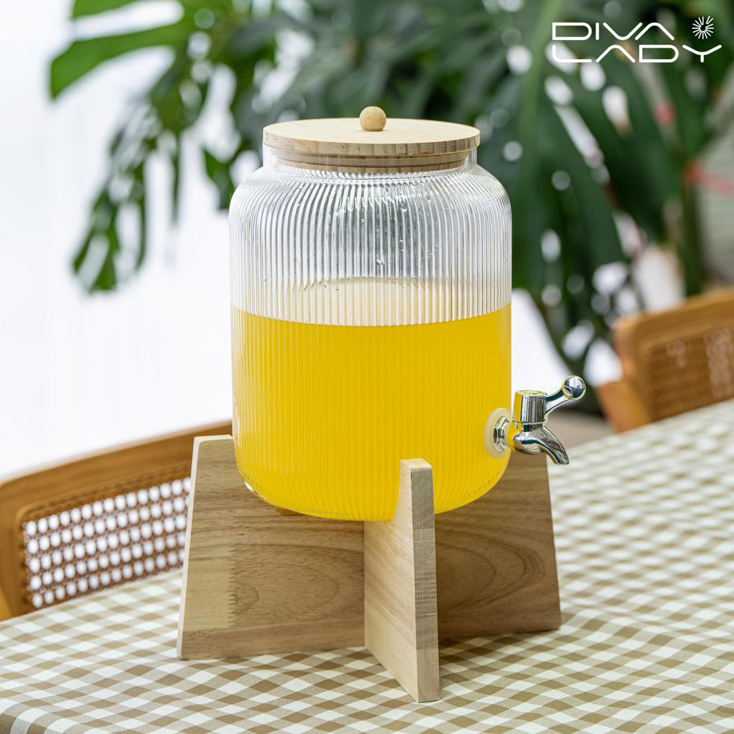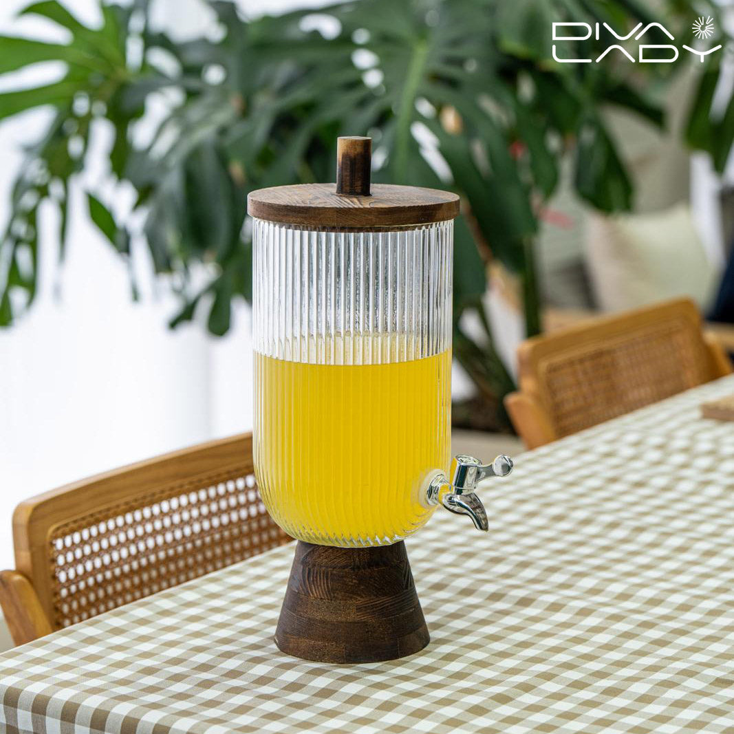 مطارة زجاجية للمشروبات الباردة مصممة بشكل جميل لتقديم المشروبات خلال جلسات العائلة والأصدقاء وسكبها بسهولة من خلال صنبور من الاستالس المعالج ضد الصدا مصنوعة من زجاج عالى الجودة ومزودة بقاعدة خشبية وغطاء خشبى
