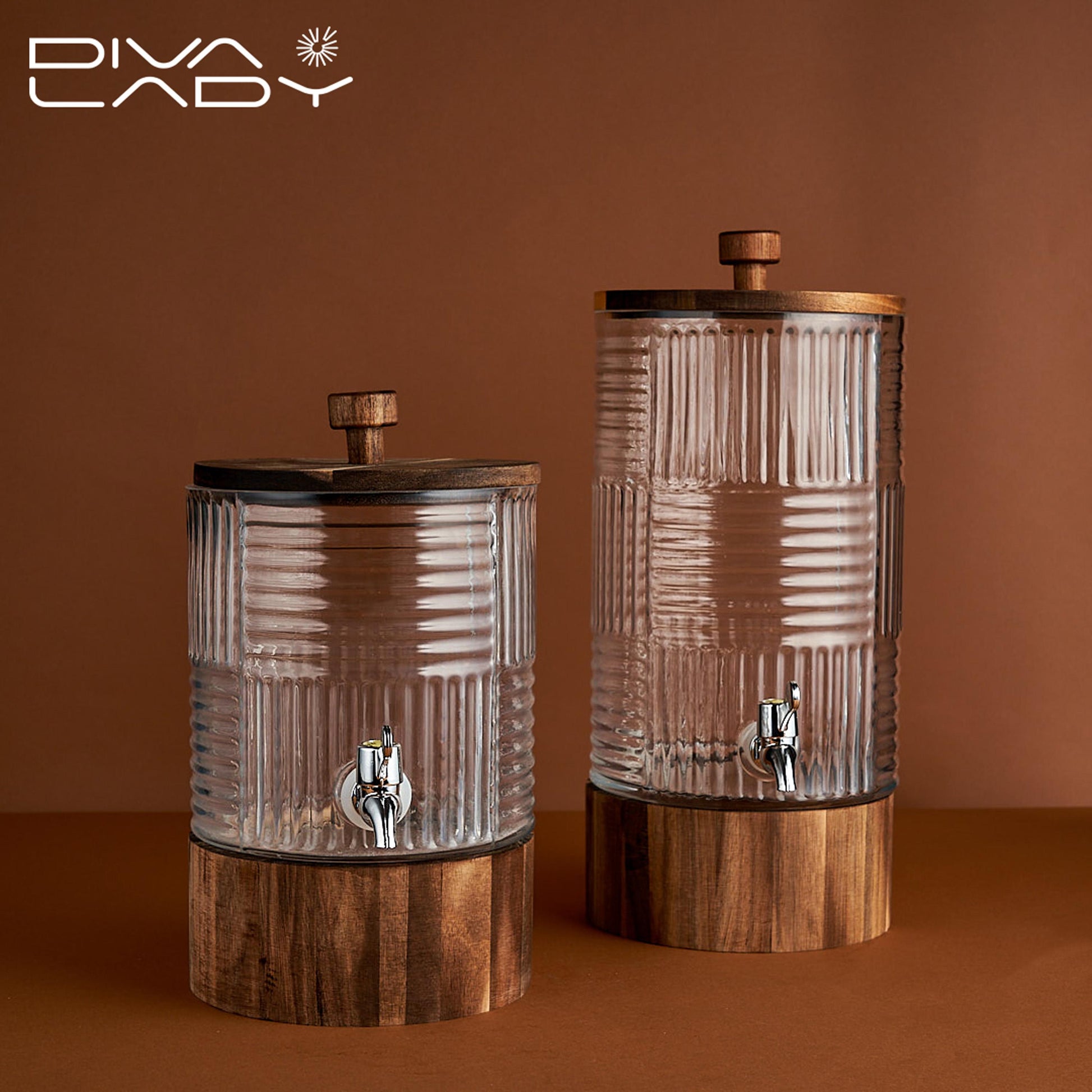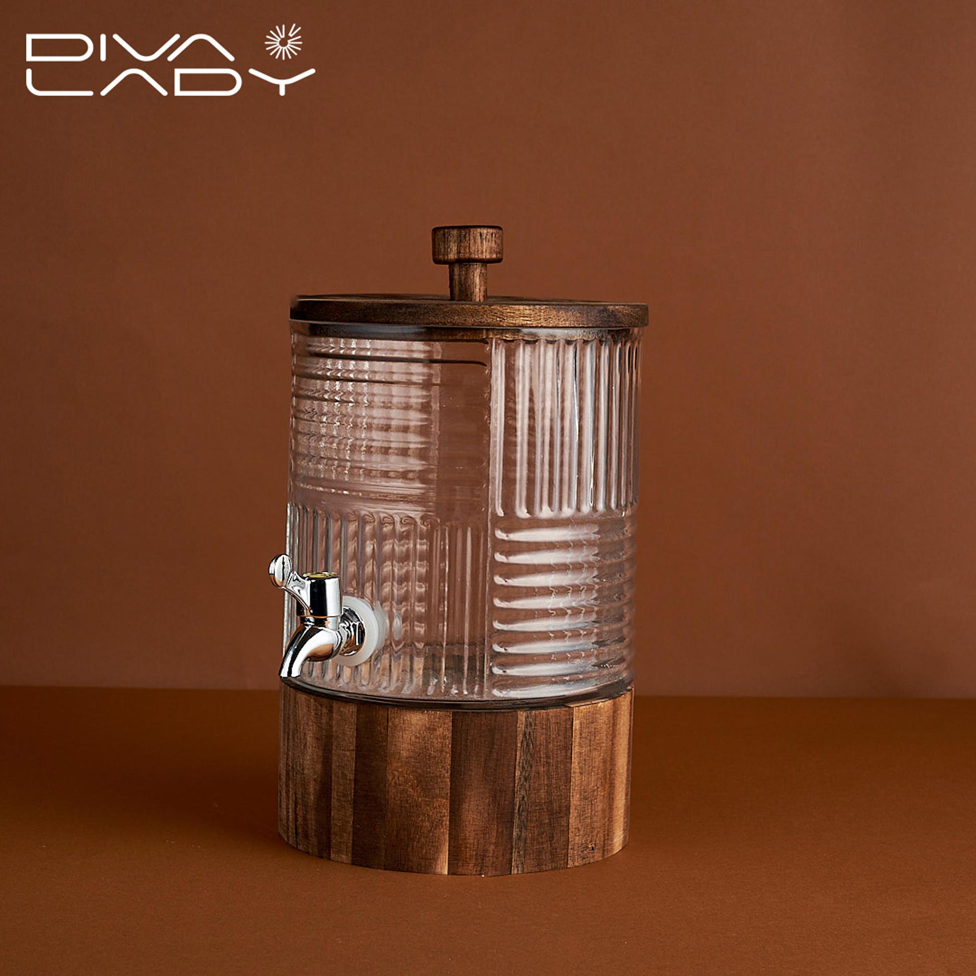 مطارة زجاجية للمشروبات الباردة مصممة بشكل جميل لتقديم المشروبات خلال جلسات العائلة والأصدقاء وسكبها بسهولة من خلال صنبور من الاستالس المعالج ضد الصدا مصنوعة من زجاج عالى الجودة ومزودة بقاعدة خشبية وغطاء زجاجى