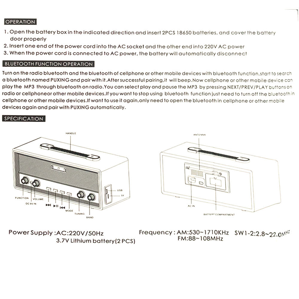 راديو FM Pu Xing PX-630BT مع مشغل موسيقى MP3 بلوتوث/USB/TF