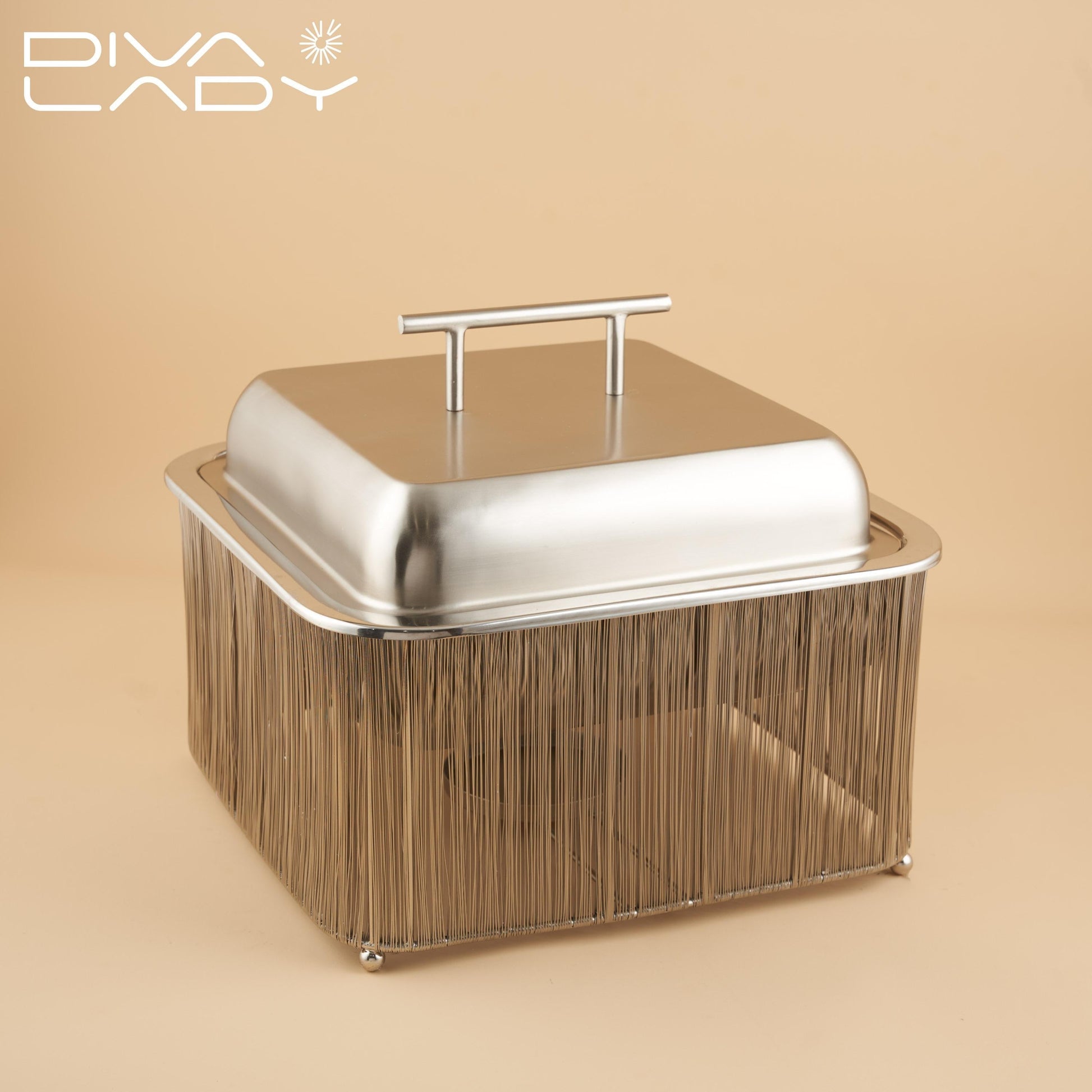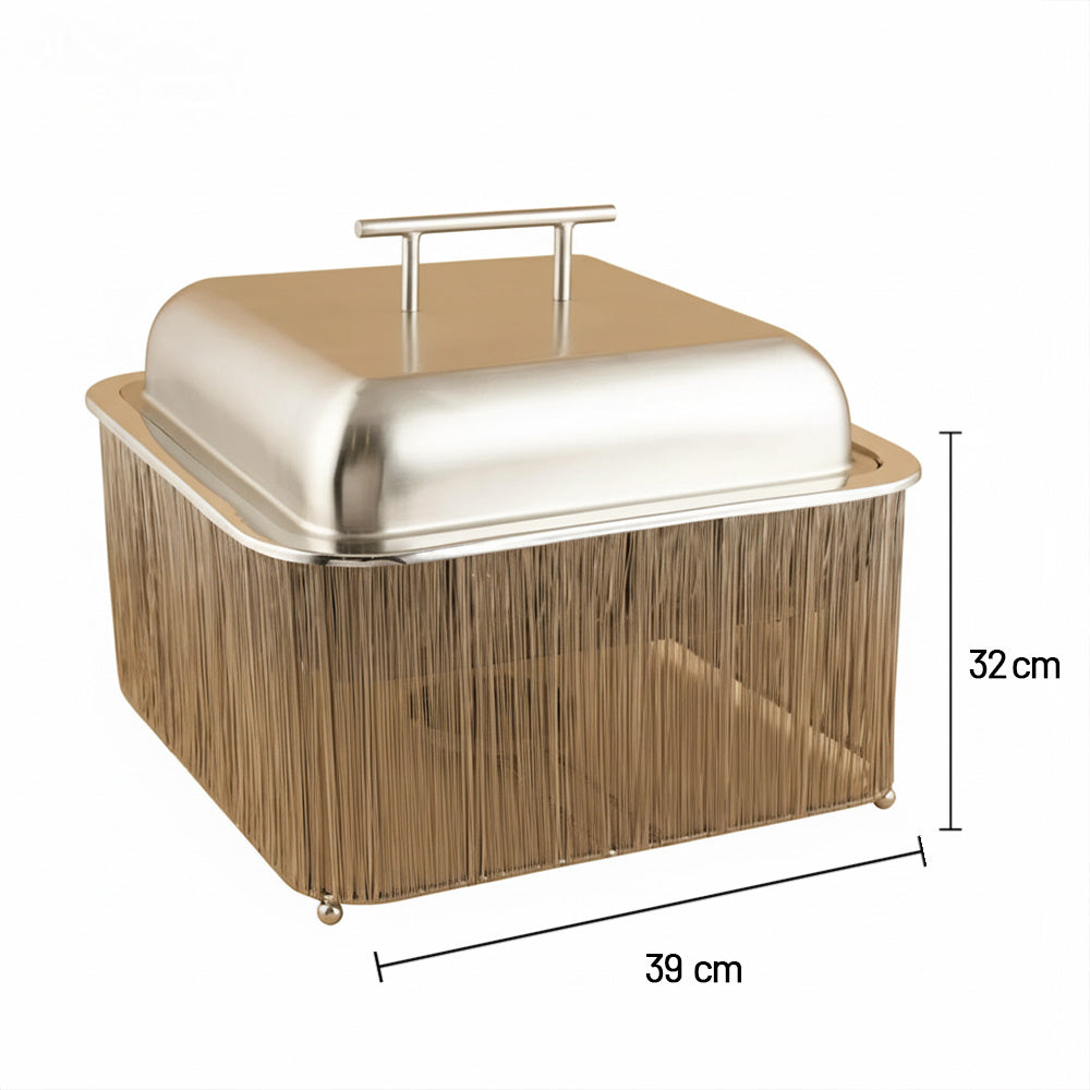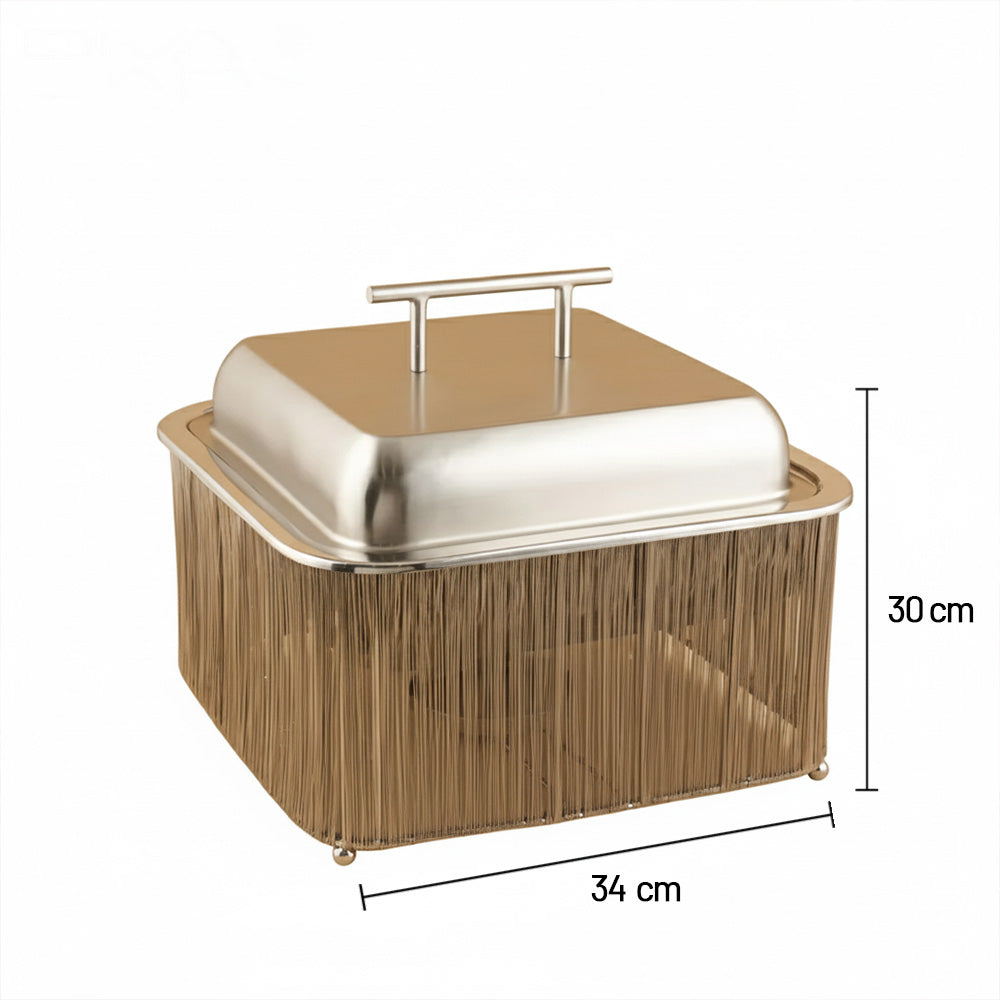 سخان طعام مربع مصنوع من الاستانلس ستيل المقاوم للصدا مما يضيف علية مظهرا عالى الجودة و المتانة و الحماية الجانبية ويحيط بالوعاء قاعدة مصنوعة من الاسلاك المعدنية و التى تكون مصممة لتوفير التهوية افضل