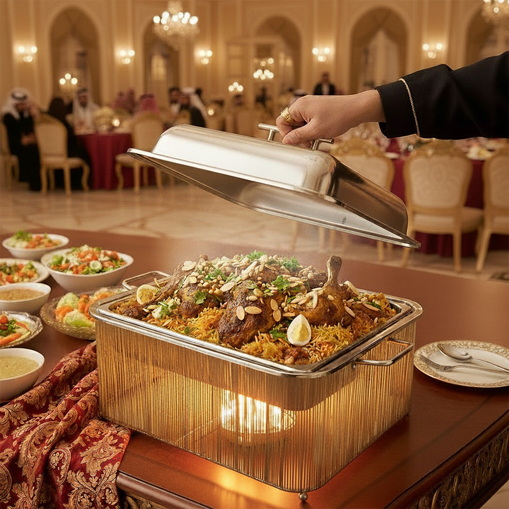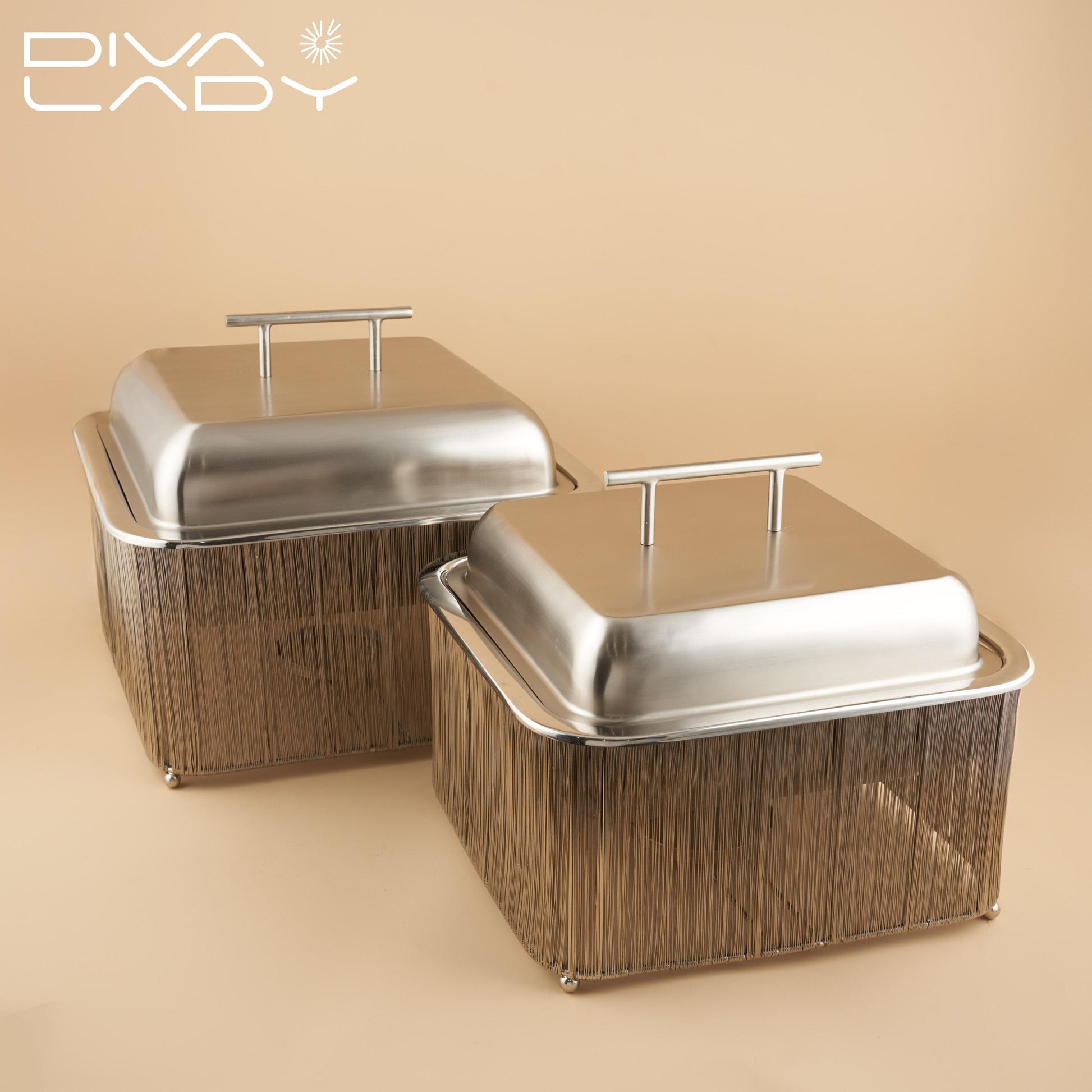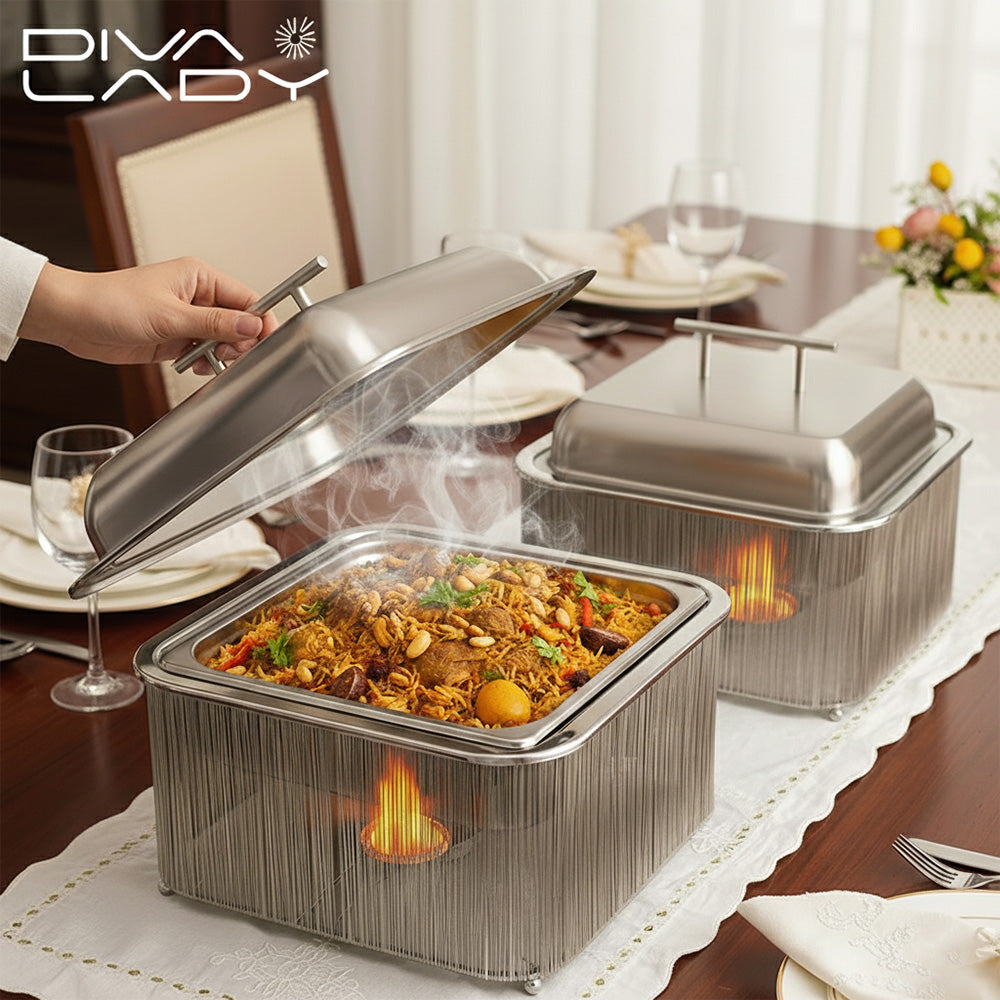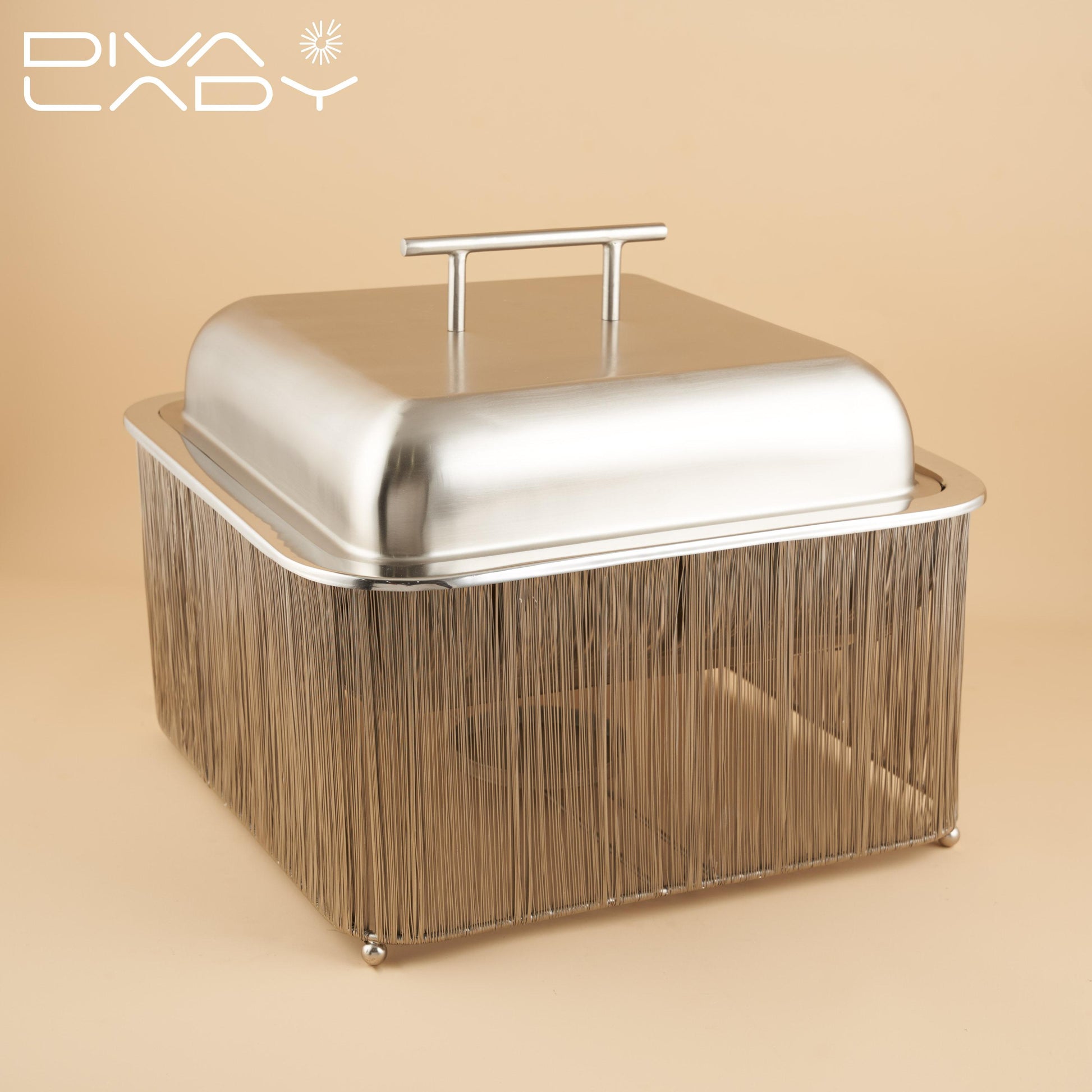 سخان طعام مربع مصنوع من الاستانلس ستيل المقاوم للصدا مما يضيف علية مظهرا عالى الجودة و المتانة و الحماية الجانبية ويحيط بالوعاء قاعدة مصنوعة من الاسلاك المعدنية و التى تكون مصممة لتوفير التهوية افضل