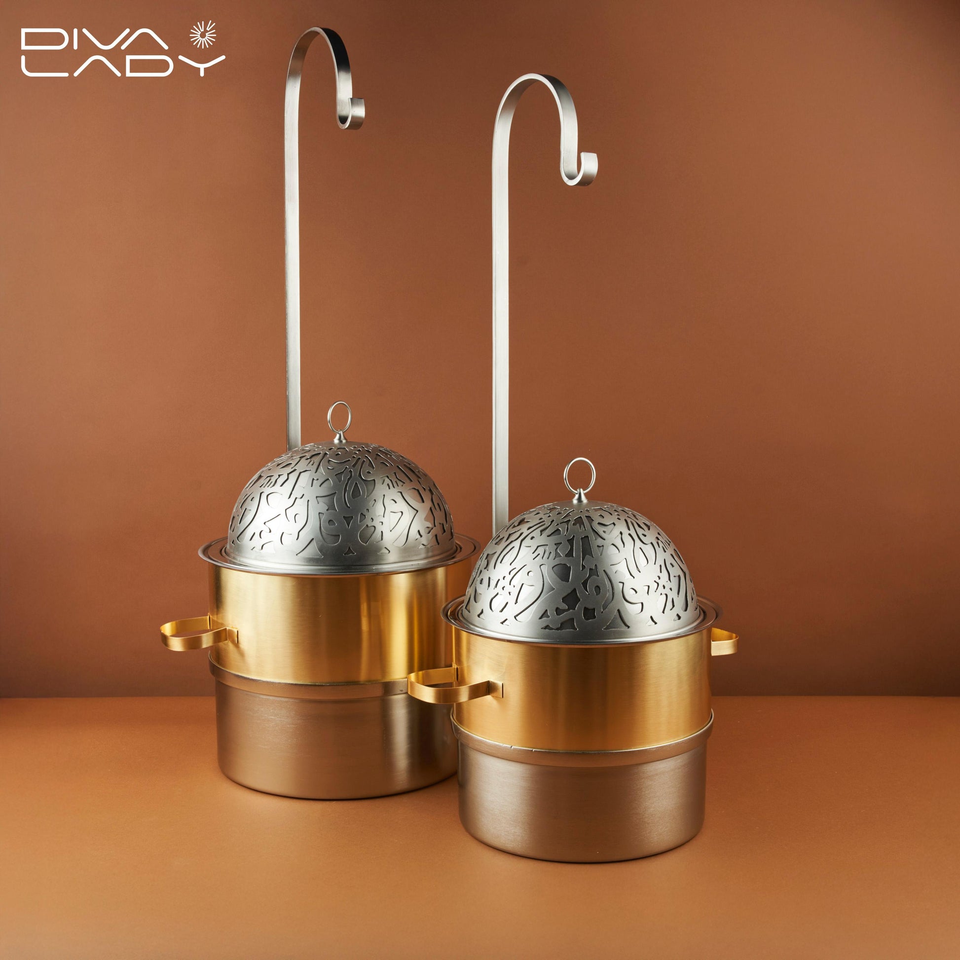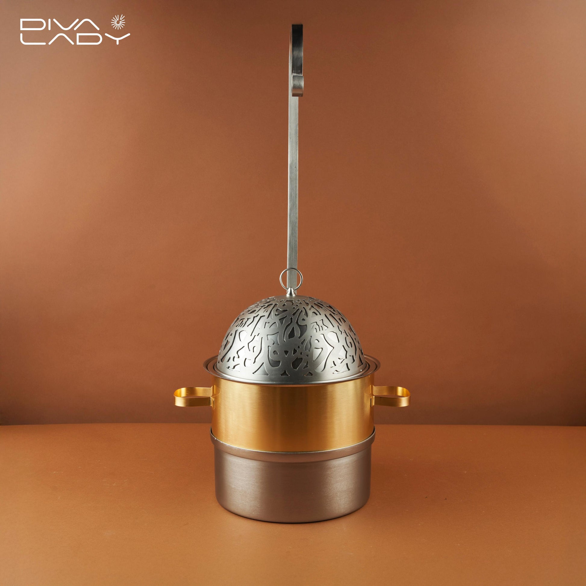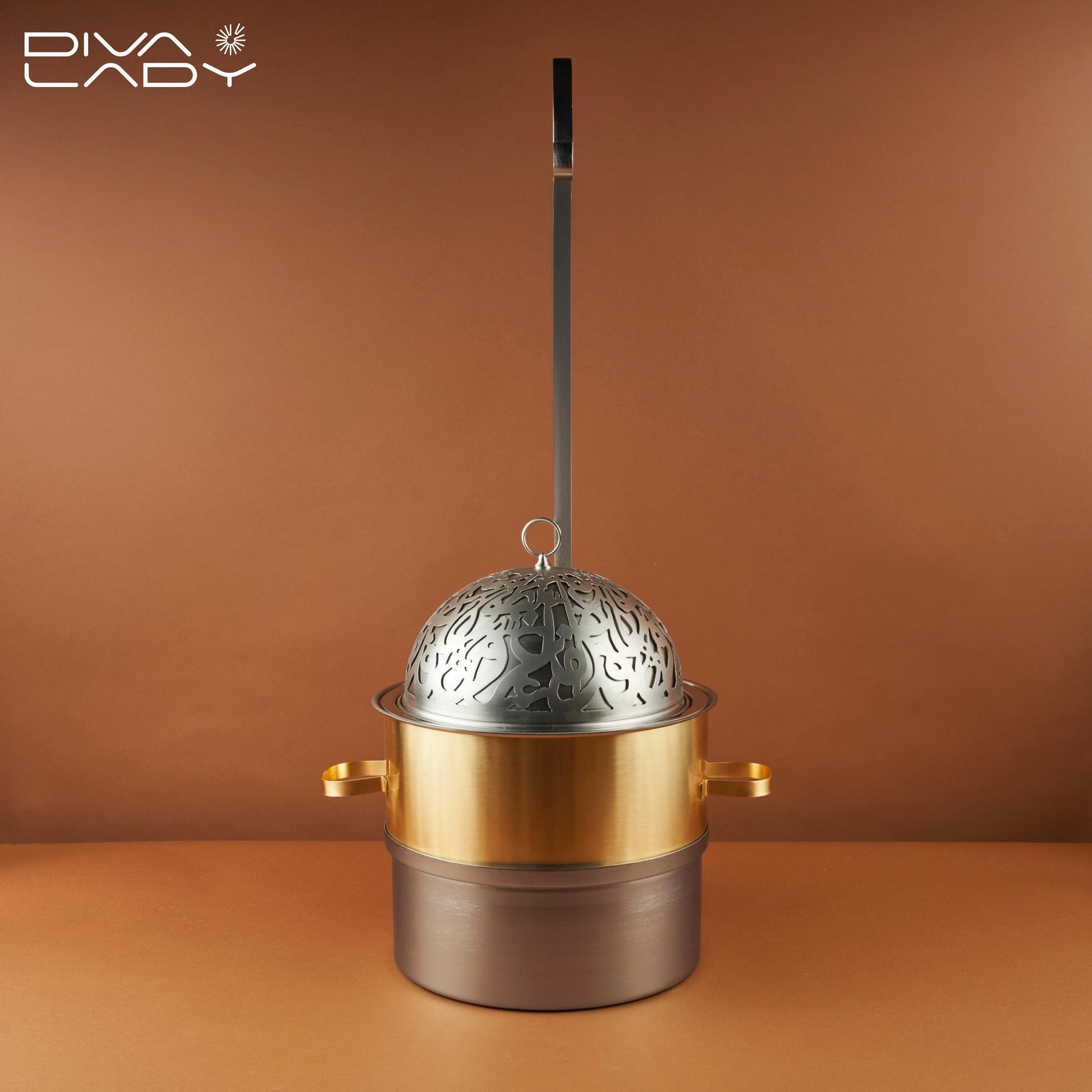 سخان طعام يتكون من وعاء معدنى دائرى بيدين جانبيتين لسهولة الحمل مع غطاء مزخرف بتصميم انيق مع حامل معدنى طويل مما يجعله مناسب للاستخدام فى الهواء الطلق يحافظ على درجه حرارة الطعام ويجعله جاهز للتقديم