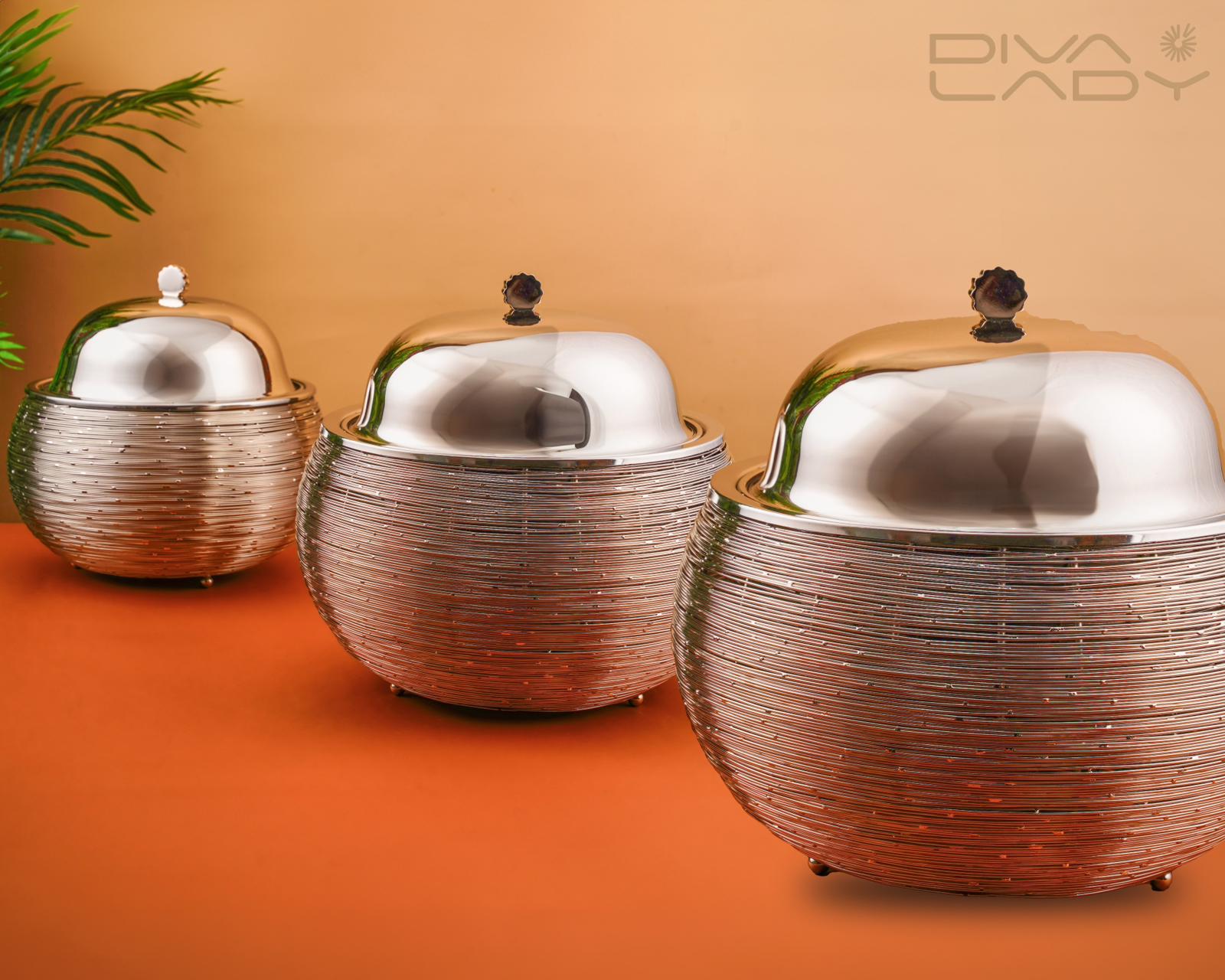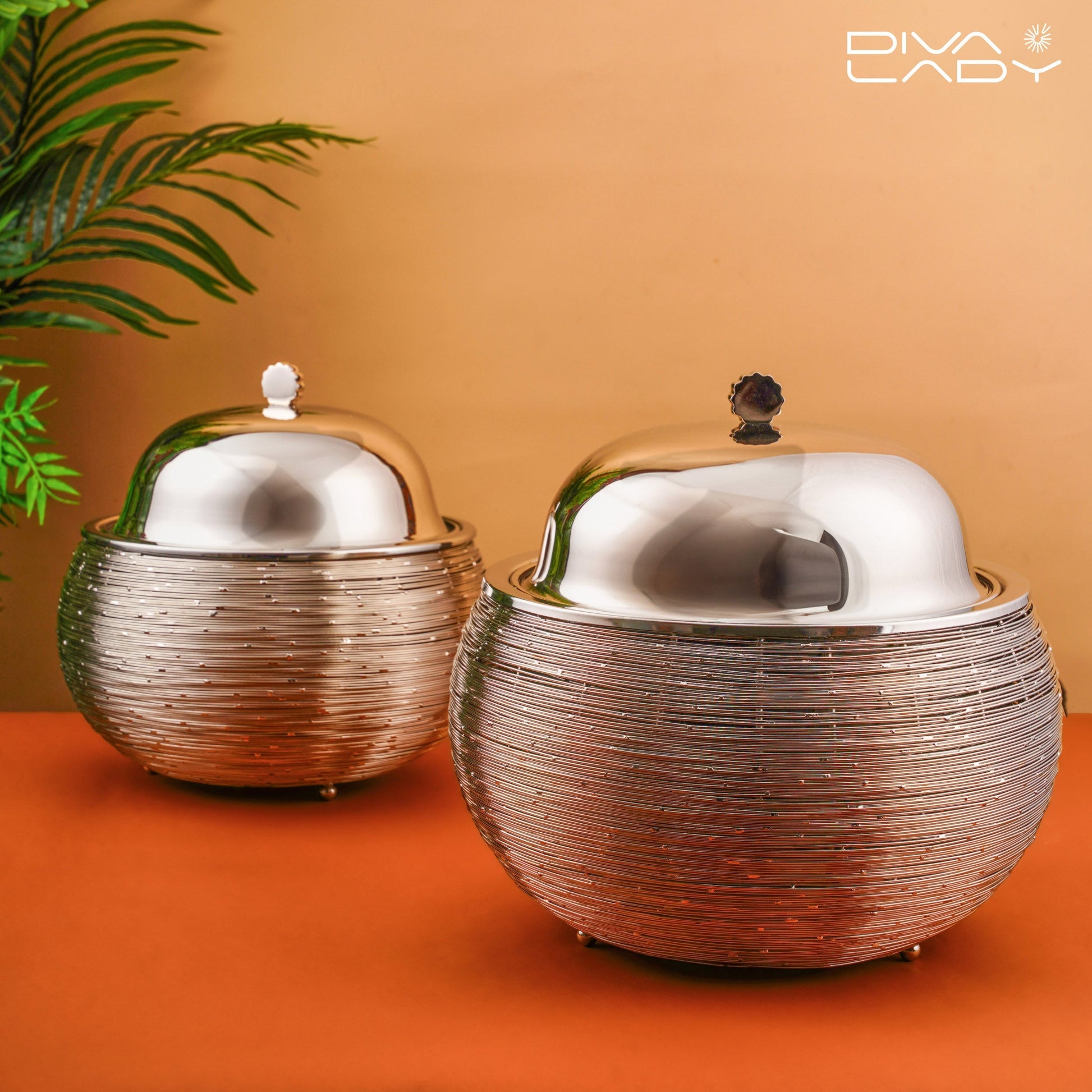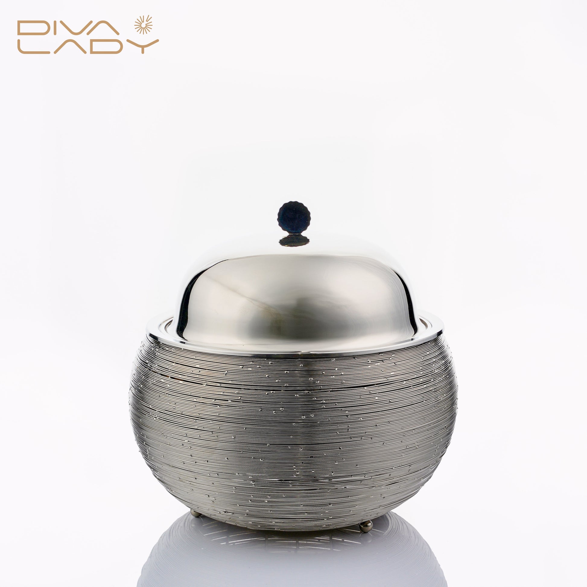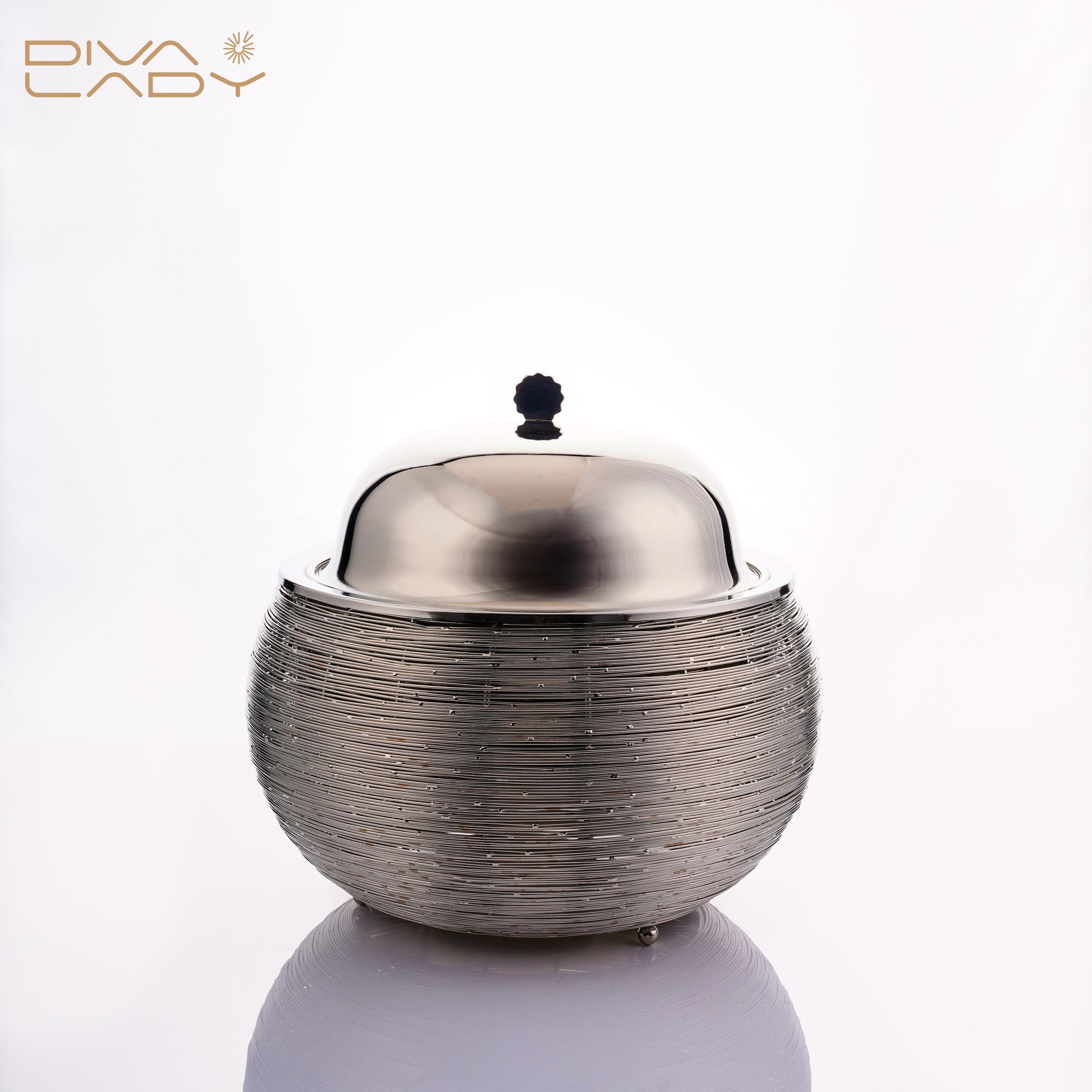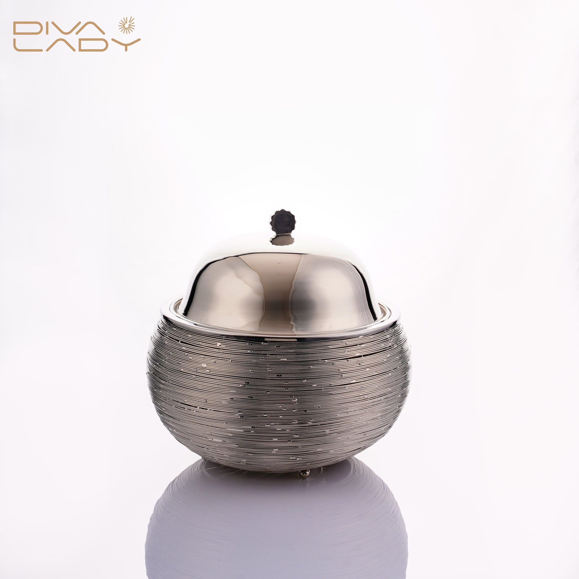 اجعل تقديم الطعام أكثر فخامة مع هذا السخان المعدني الأنيق، المصمم بشكل كروي عصري ونقوش دقيقة تضيف لمسة من الرقي على مائدتك. يأتي بغطاء قبة لامع أنيق لحفظ الحرارة ومنع تسرب الروائح، مثالي لتقديم الأطعمة الساخنة في العزائم والمناسبات الخاصة.